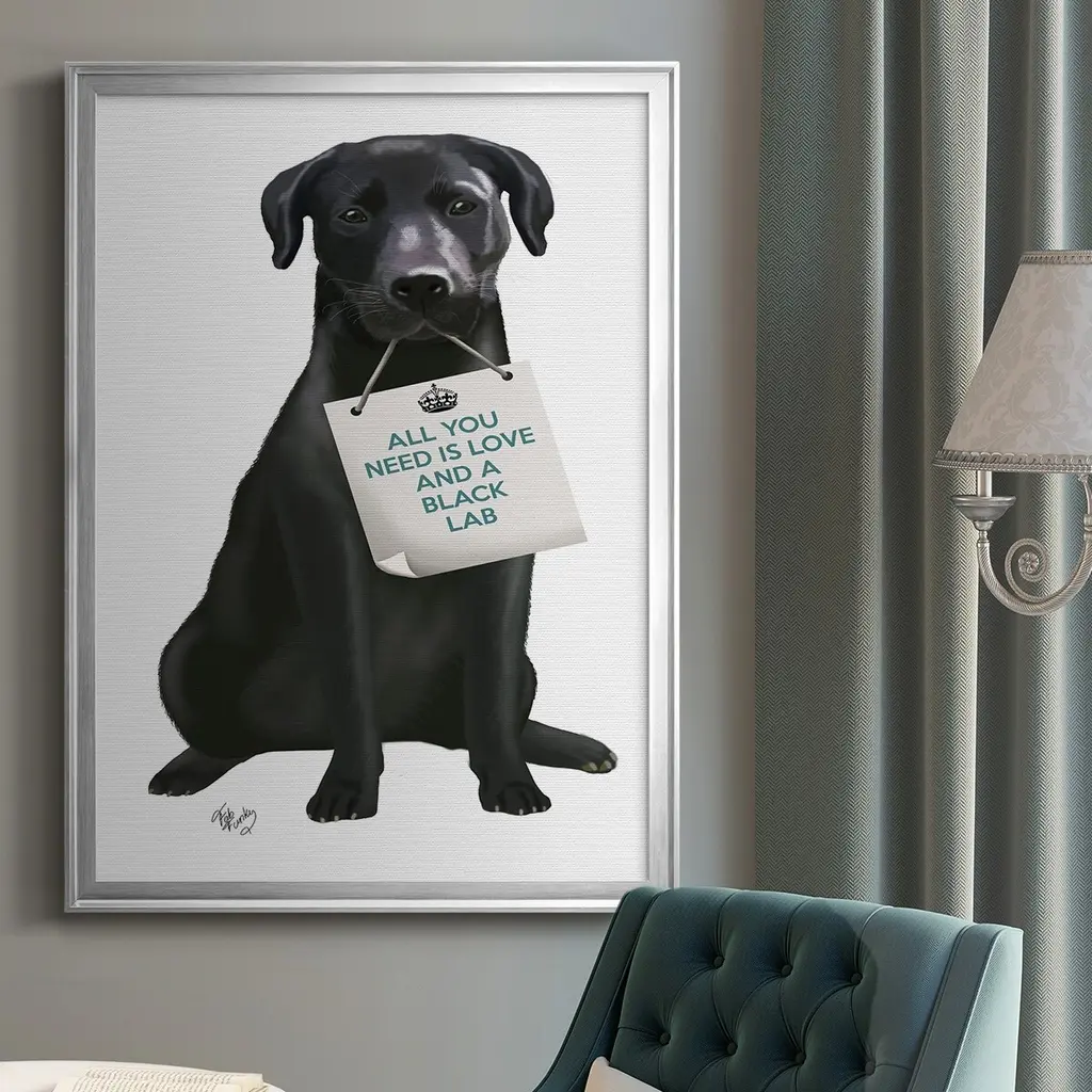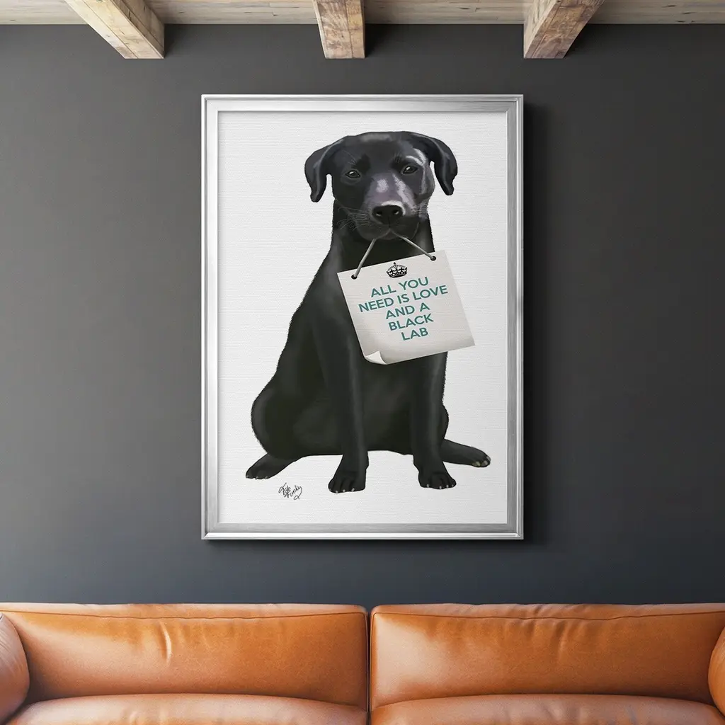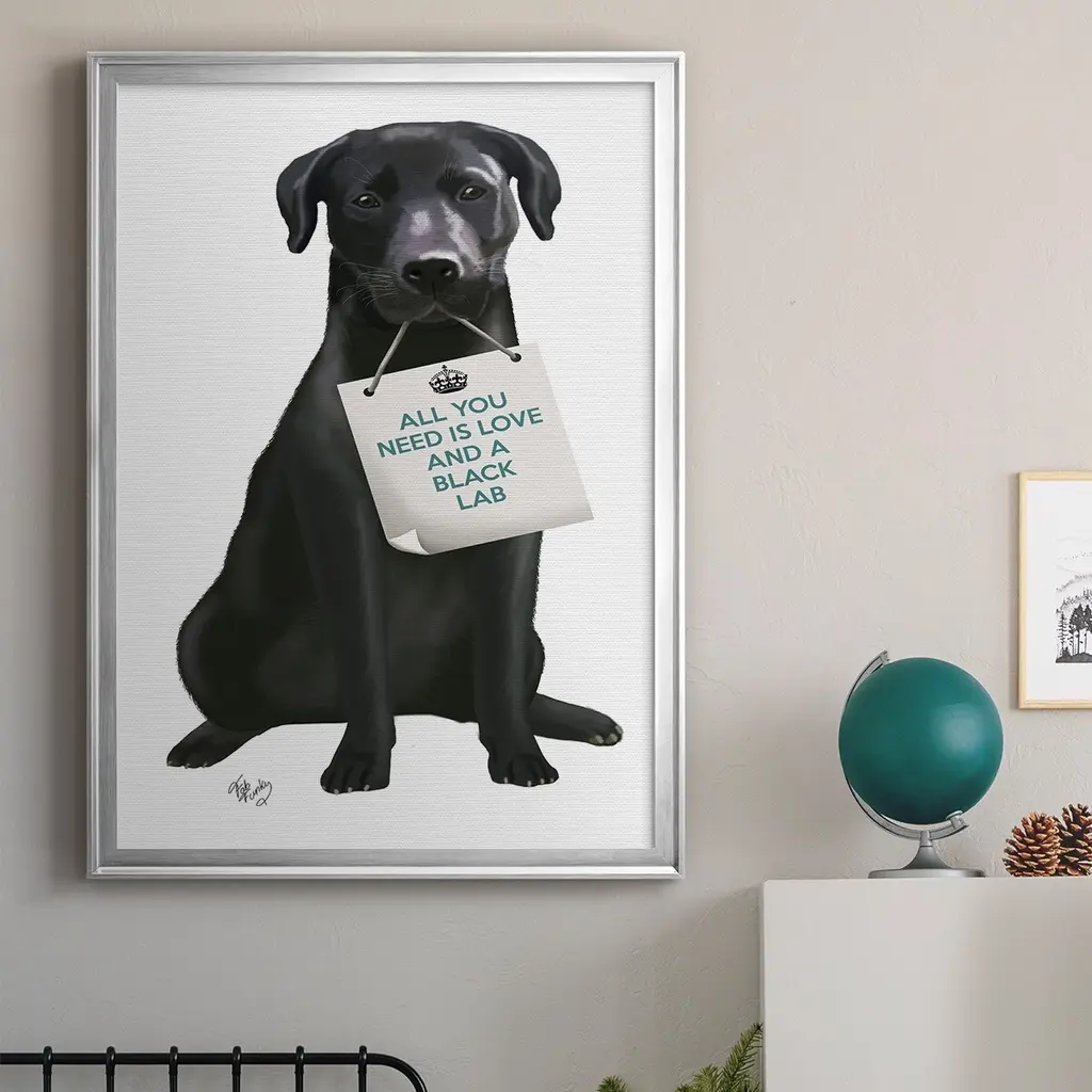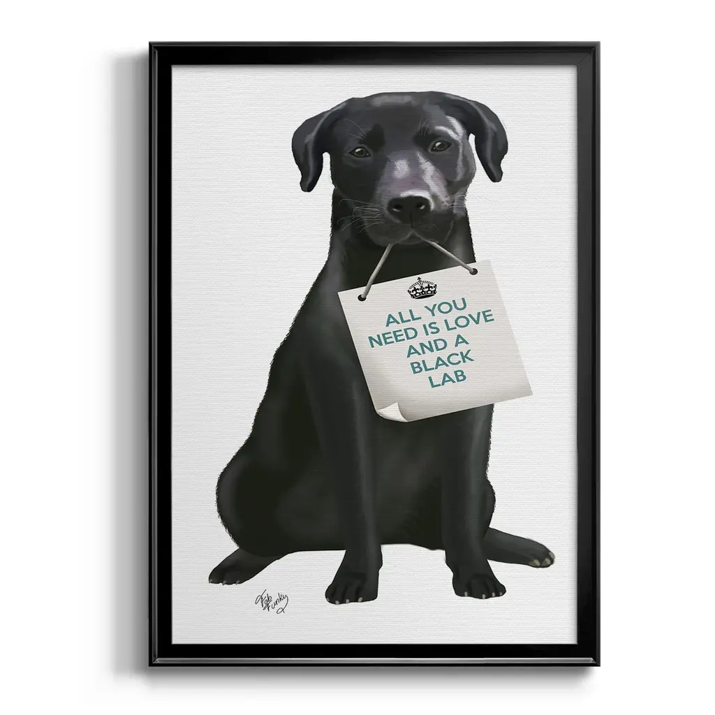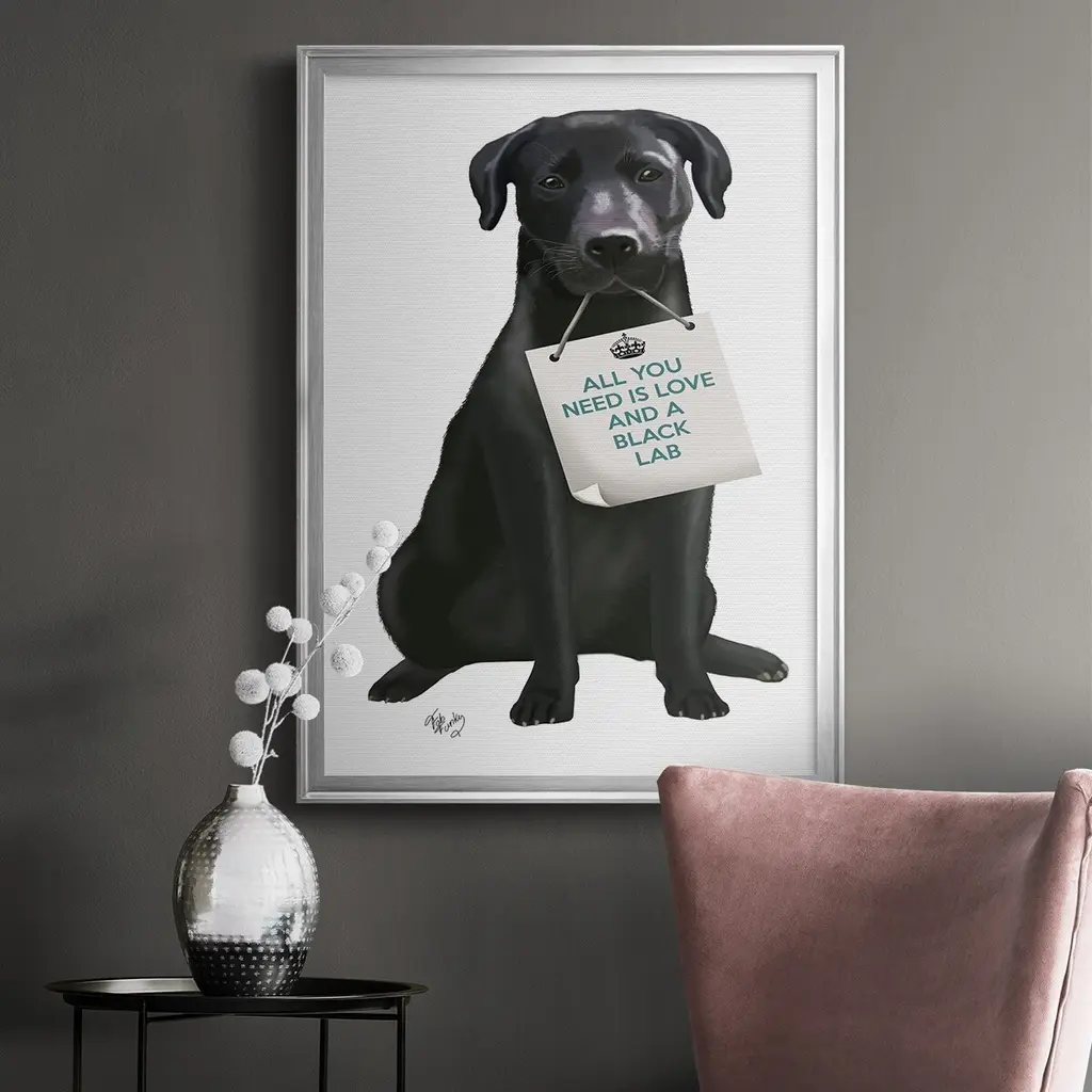 Love and Black Labrador Premium Framed Print - Ready to Hang A Premium Framed Print created to last. Framed in distressed wood and available in an array of sizes and colors Featuring a beveled a solid wood stretcher bar, each piece comes ready to hand 4 SIZES AVAILABLE 30.5''X42.5'' - Overall Size 26.5'X36.5'' - Overall Size 22.5''x30.5'' - Overall Size 18.5''x24.5'' - Overall Size Each piece is made to order. Each piece comes with hanging hardware. Made in the USA Ready to Hang