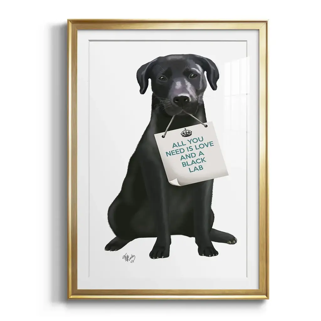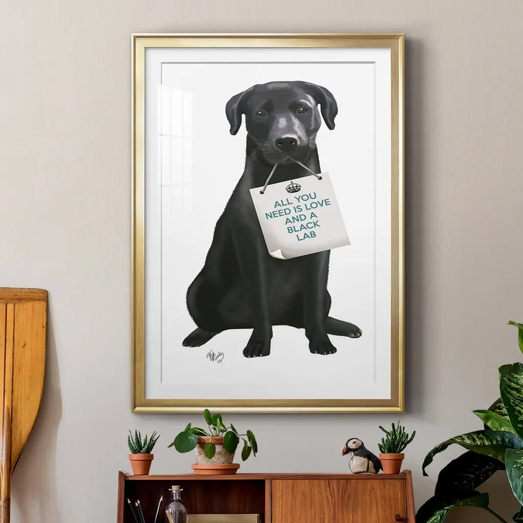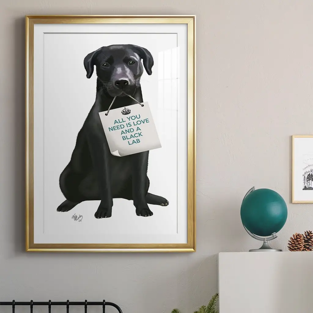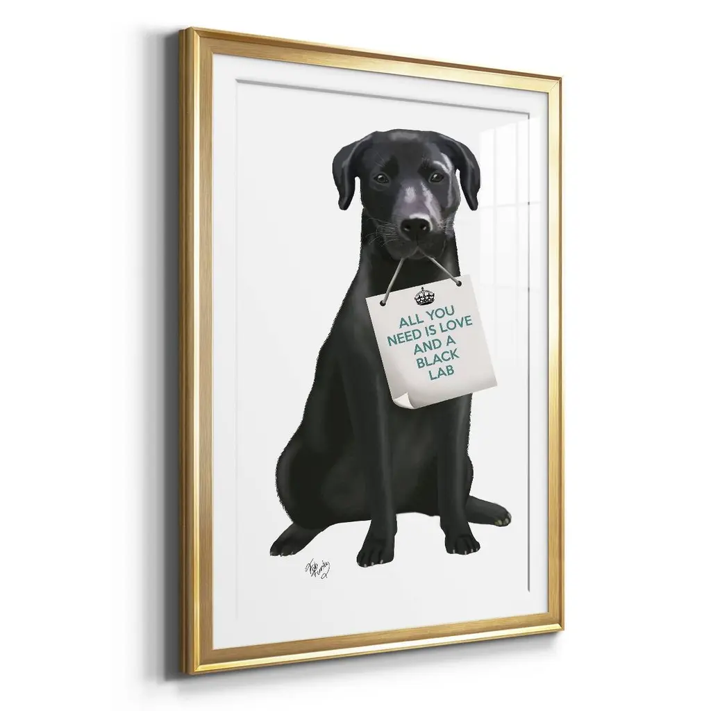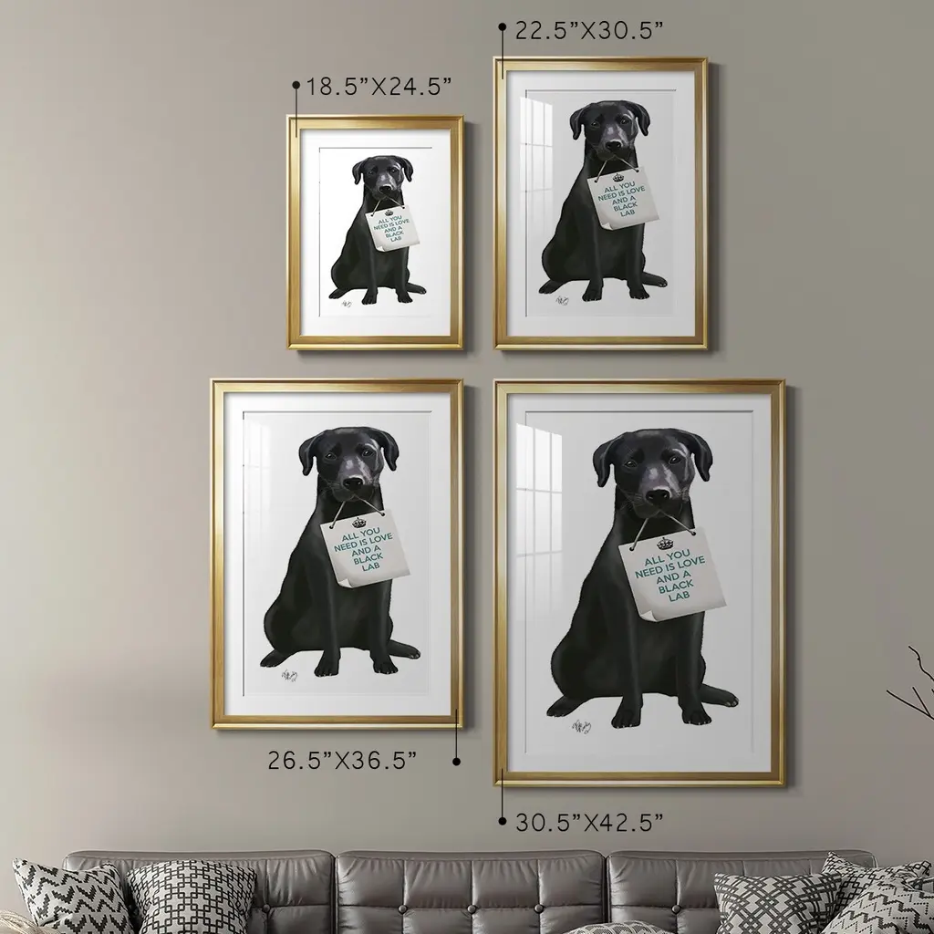 Love and Black Labrador Premium Framed Print - Ready to Hang A Premium Framed Print created to last. Framed in distressed wood and available in an array of sizes and colors Featuring a beveled a solid wood stretcher bar, each piece comes ready to hand 4 SIZES AVAILABLE 30.5''X42.5'' - Overall Size 26.5'X36.5'' - Overall Size 22.5''x30.5'' - Overall Size 18.5''x24.5'' - Overall Size Each piece is made to order. Each piece comes with hanging hardware. Made in the USA Ready to Hang Giclee Paper Print Acrylic Glass Beveled Matt Board
