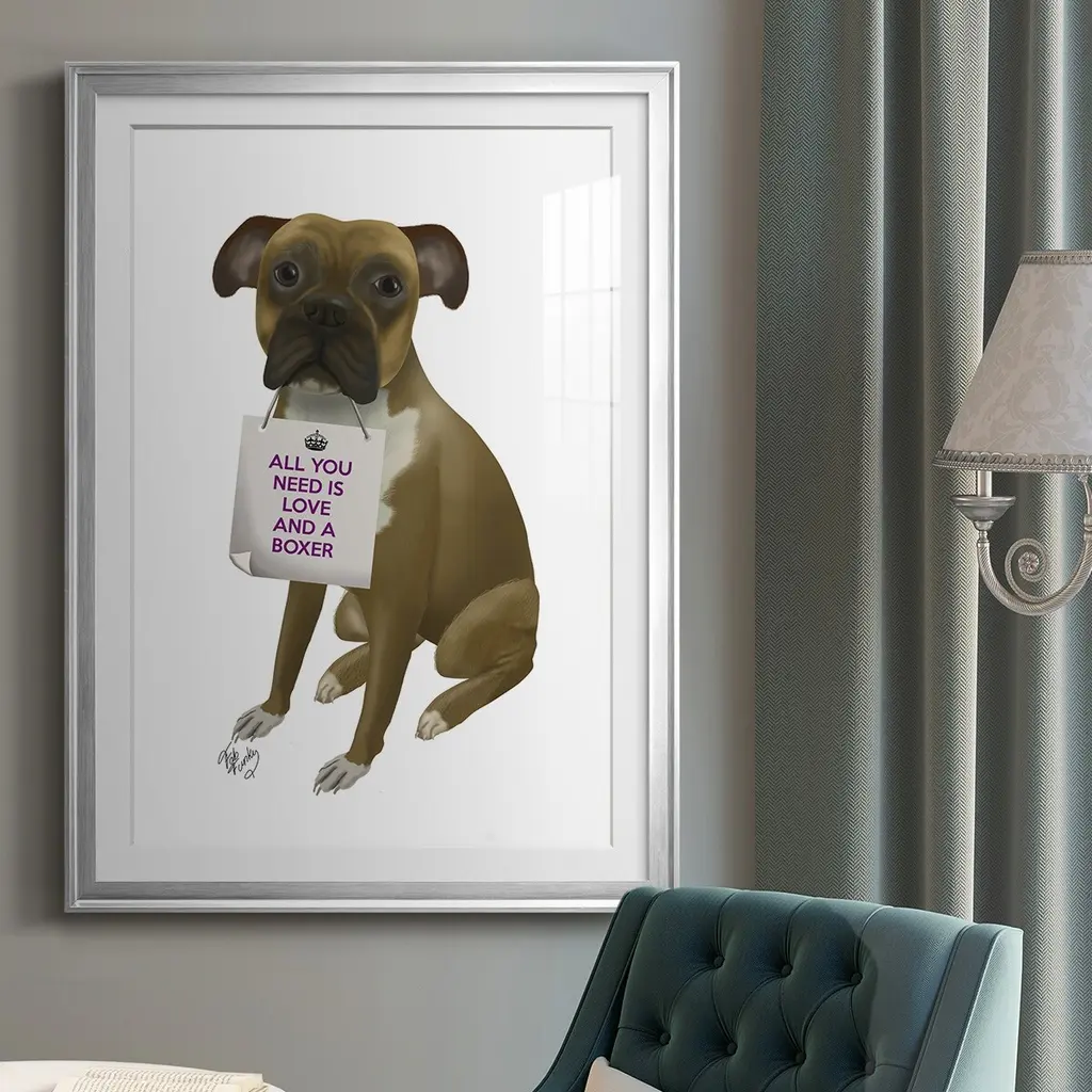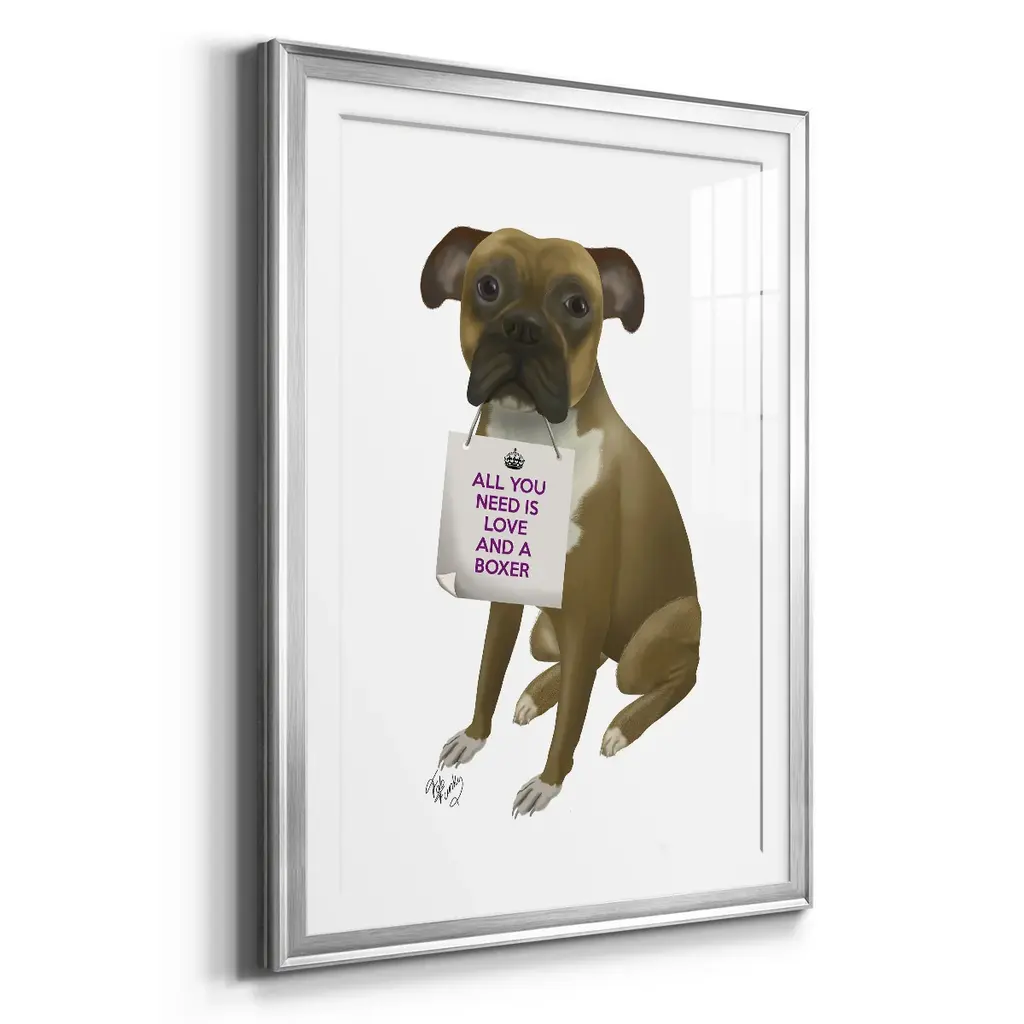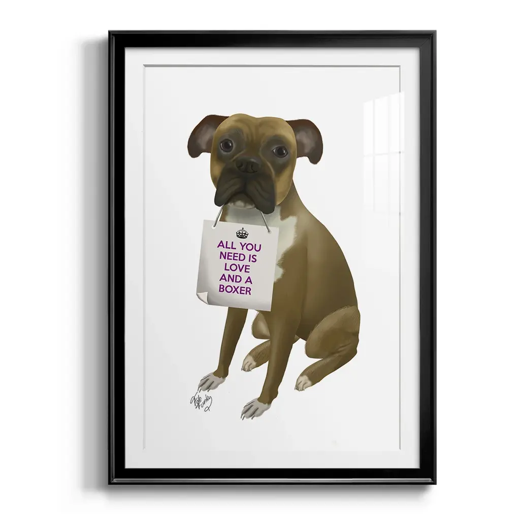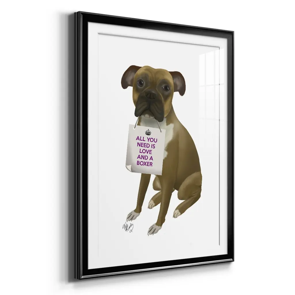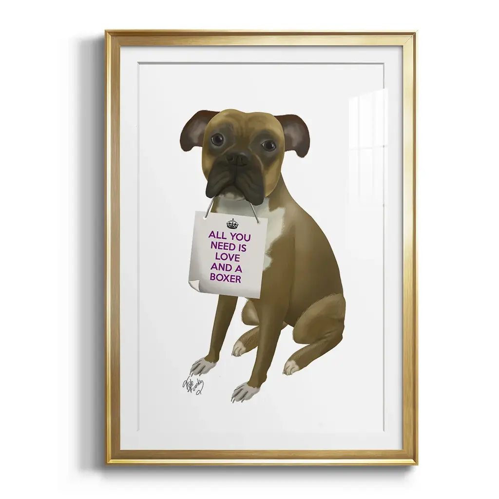 Love and Boxer Premium Framed Print - Ready to Hang A Premium Framed Print created to last. Framed in distressed wood and available in an array of sizes and colors Featuring a beveled a solid wood stretcher bar, each piece comes ready to hand 4 SIZES AVAILABLE 30.5''X42.5'' - Overall Size 26.5'X36.5'' - Overall Size 22.5''x30.5'' - Overall Size 18.5''x24.5'' - Overall Size Each piece is made to order. Each piece comes with hanging hardware. Made in the USA Ready to Hang Giclee Paper Print Acrylic Glass Beveled Matt Board