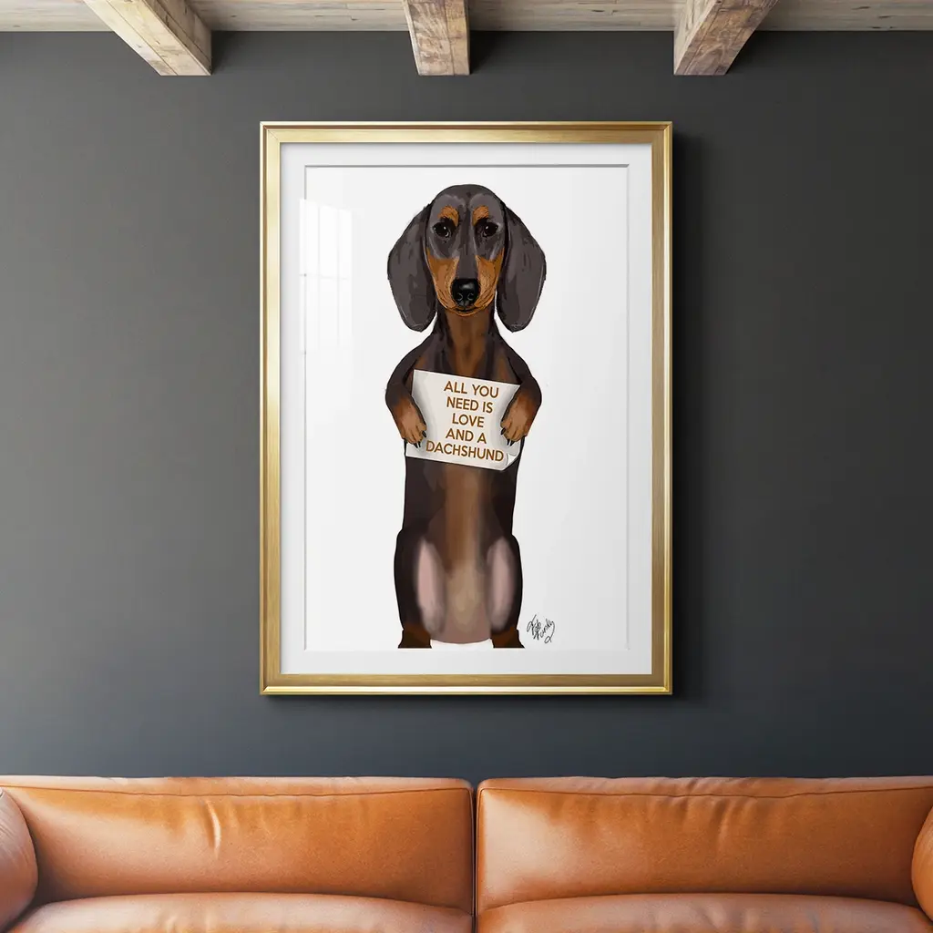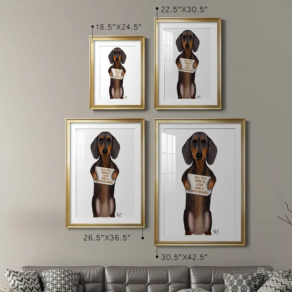 Love and Dachshund Premium Framed Print - Ready to Hang A Premium Framed Print created to last. Framed in distressed wood and available in an array of sizes and colors Featuring a beveled a solid wood stretcher bar, each piece comes ready to hand 4 SIZES AVAILABLE 30.5''X42.5'' - Overall Size 26.5'X36.5'' - Overall Size 22.5''x30.5'' - Overall Size 18.5''x24.5'' - Overall Size Each piece is made to order. Each piece comes with hanging hardware. Made in the USA Ready to Hang Giclee Paper Print Acrylic Glass Beveled Matt Board