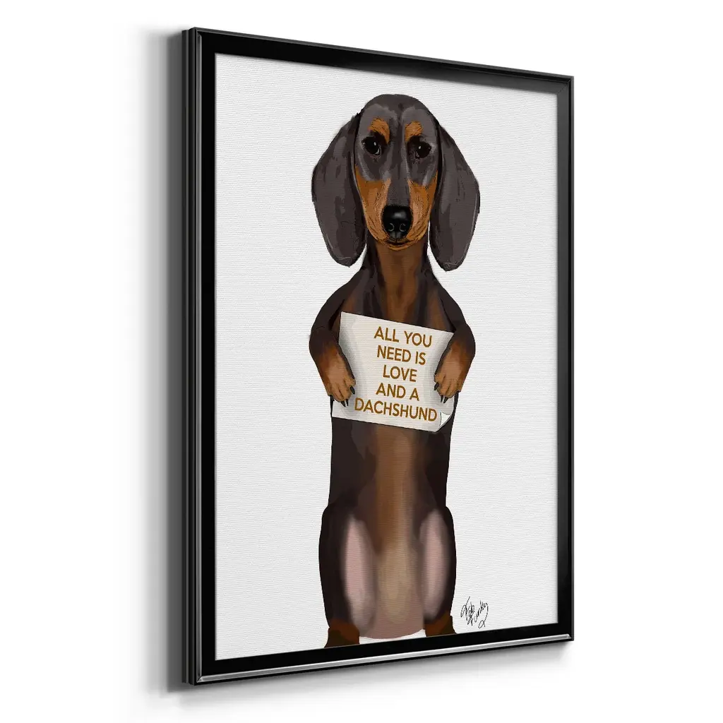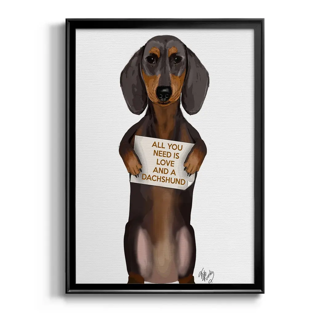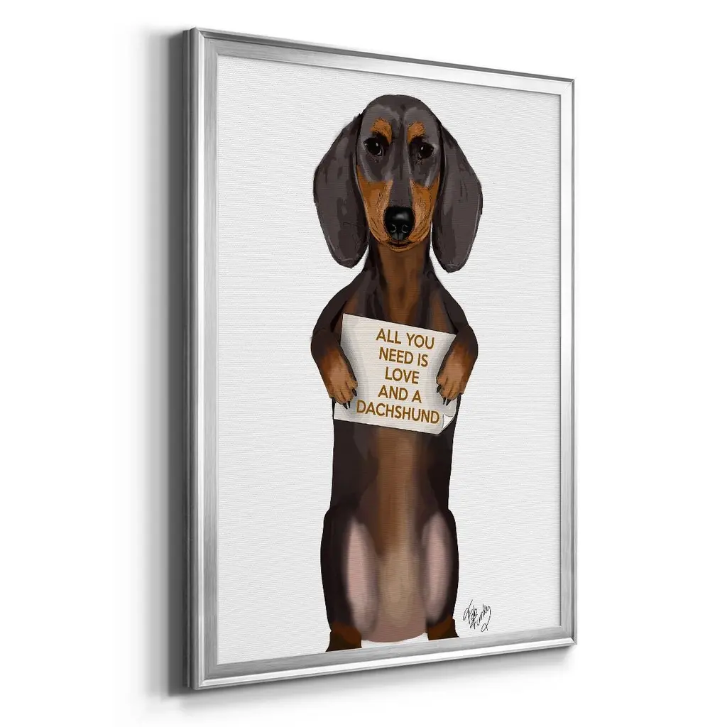 Love and Dachshund Premium Framed Print - Ready to Hang A Premium Framed Print created to last. Framed in distressed wood and available in an array of sizes and colors Featuring a beveled a solid wood stretcher bar, each piece comes ready to hand 4 SIZES AVAILABLE 30.5''X42.5'' - Overall Size 26.5'X36.5'' - Overall Size 22.5''x30.5'' - Overall Size 18.5''x24.5'' - Overall Size Each piece is made to order. Each piece comes with hanging hardware. Made in the USA Ready to Hang