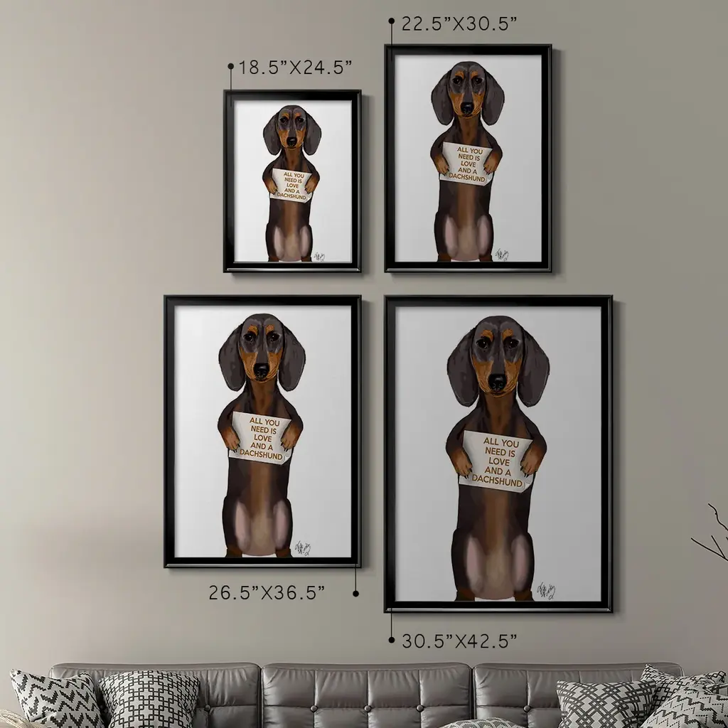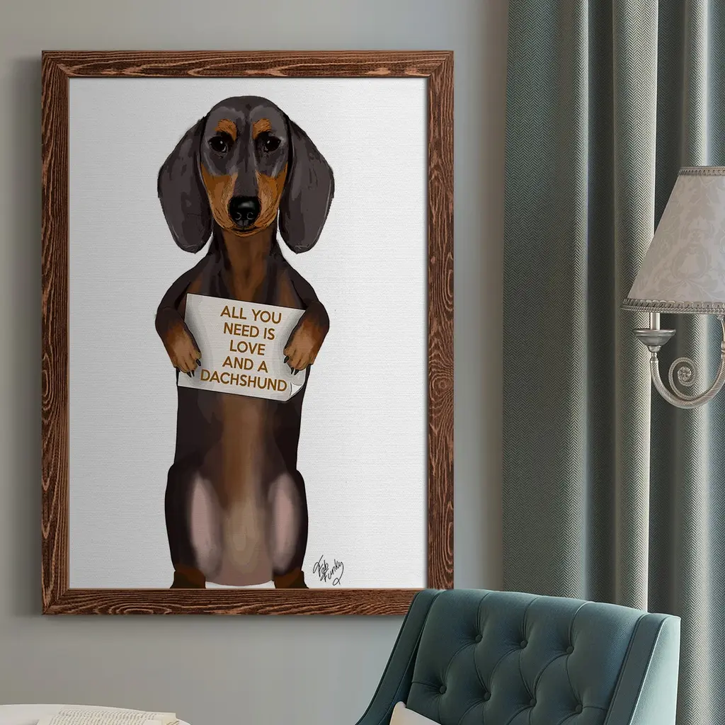 Love and Dachshund Premium Framed Print - Ready to Hang A Premium Framed Print created to last. Framed in distressed wood and available in an array of sizes and colors Featuring a beveled a solid wood stretcher bar, each piece comes ready to hand 4 SIZES AVAILABLE 30.5''X42.5'' - Overall Size 26.5'X36.5'' - Overall Size 22.5''x30.5'' - Overall Size 18.5''x24.5'' - Overall Size Each piece is made to order. Each piece comes with hanging hardware. Made in the USA Ready to Hang