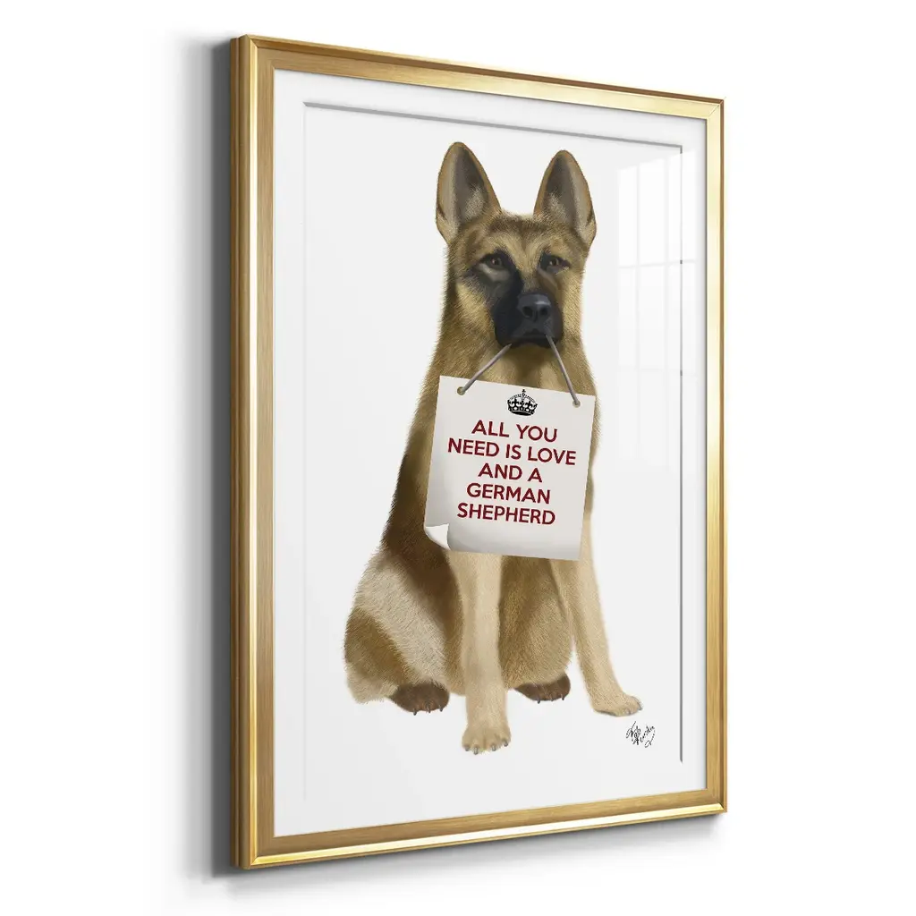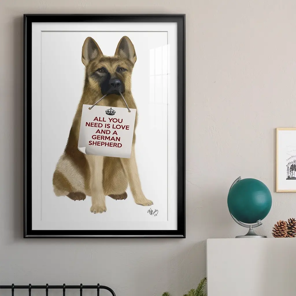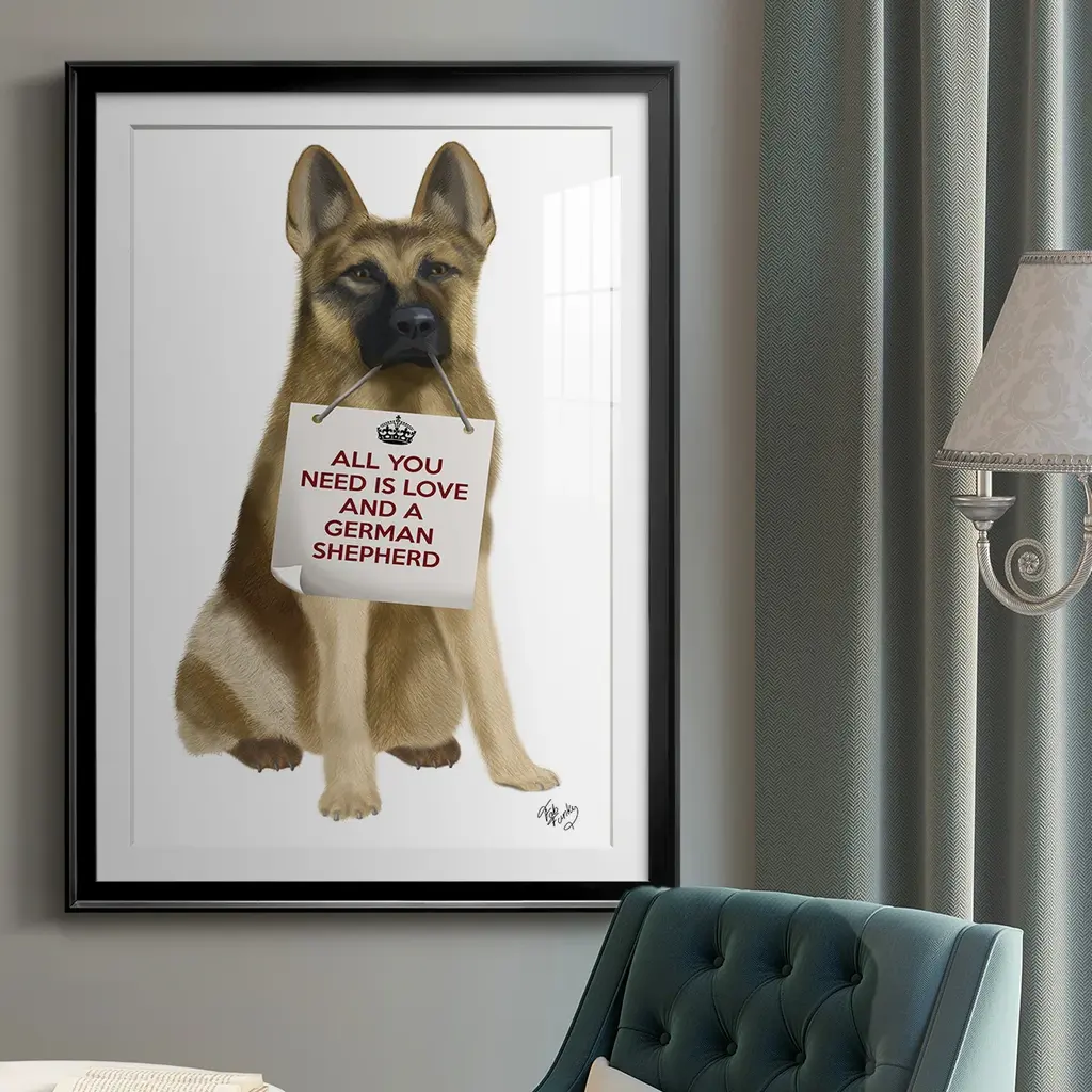 Love and German Shepherd Premium Framed Print - Ready to Hang A Premium Framed Print created to last. Framed in distressed wood and available in an array of sizes and colors Featuring a beveled a solid wood stretcher bar, each piece comes ready to hand 4 SIZES AVAILABLE 30.5''X42.5'' - Overall Size 26.5'X36.5'' - Overall Size 22.5''x30.5'' - Overall Size 18.5''x24.5'' - Overall Size Each piece is made to order. Each piece comes with hanging hardware. Made in the USA Ready to Hang Giclee Paper Print Acrylic Glass Beveled Matt Board