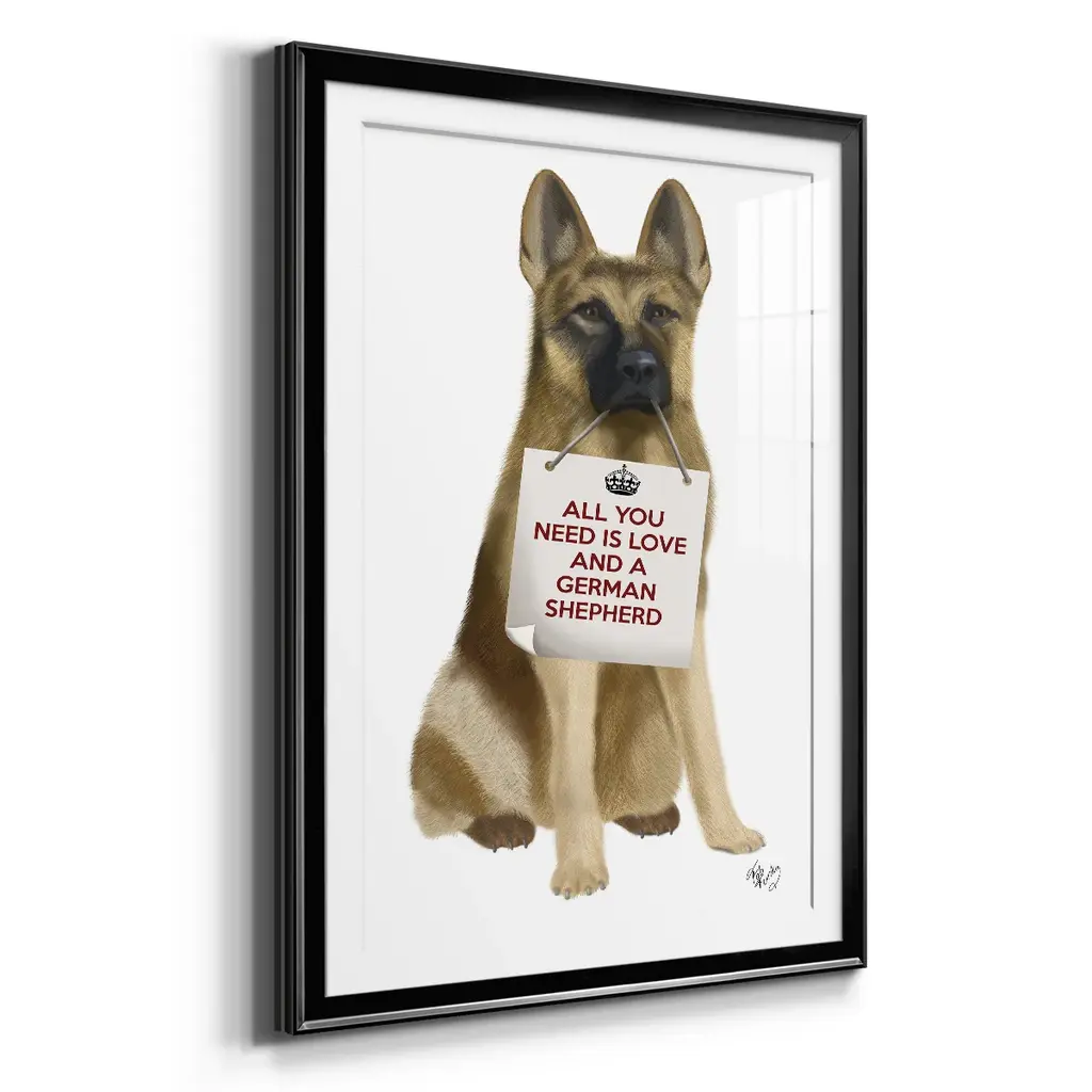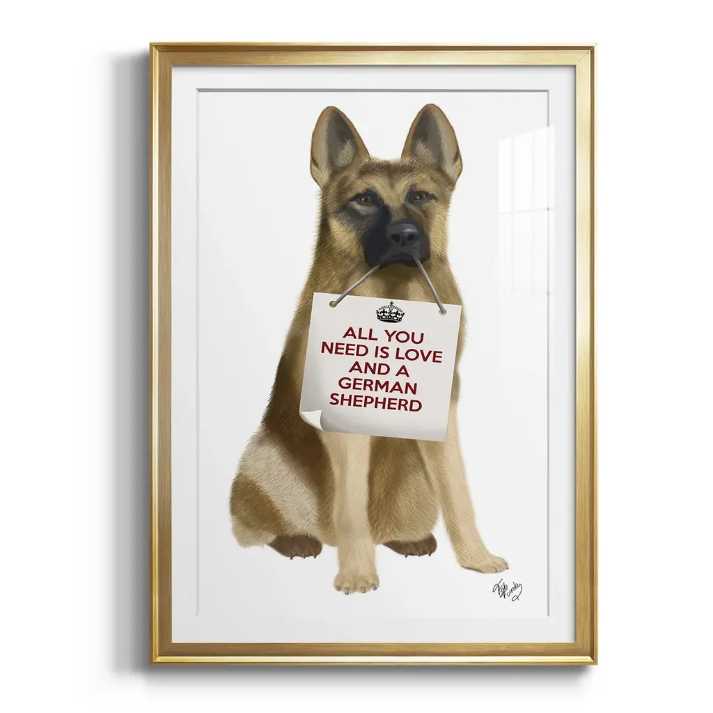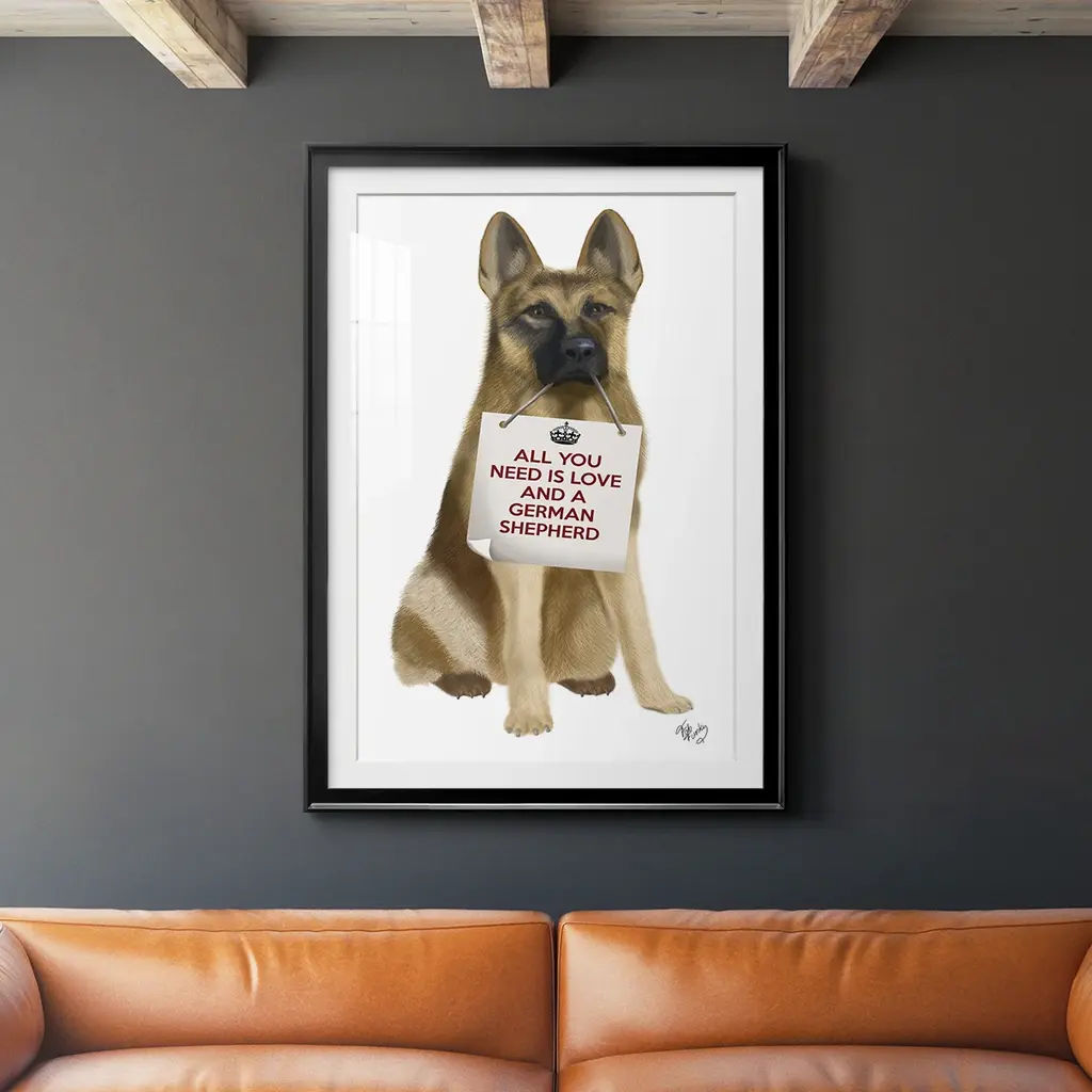 Love and German Shepherd Premium Framed Print - Ready to Hang A Premium Framed Print created to last. Framed in distressed wood and available in an array of sizes and colors Featuring a beveled a solid wood stretcher bar, each piece comes ready to hand 4 SIZES AVAILABLE 30.5''X42.5'' - Overall Size 26.5'X36.5'' - Overall Size 22.5''x30.5'' - Overall Size 18.5''x24.5'' - Overall Size Each piece is made to order. Each piece comes with hanging hardware. Made in the USA Ready to Hang Giclee Paper Print Acrylic Glass Beveled Matt Board