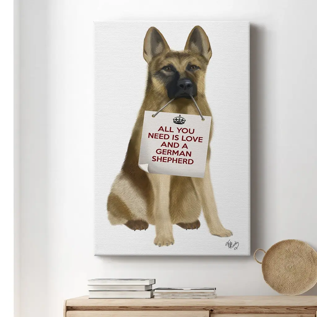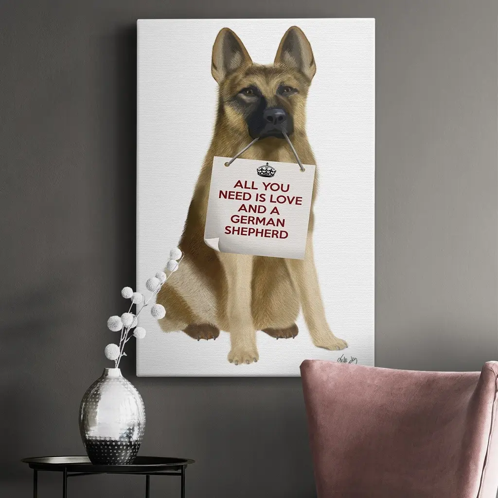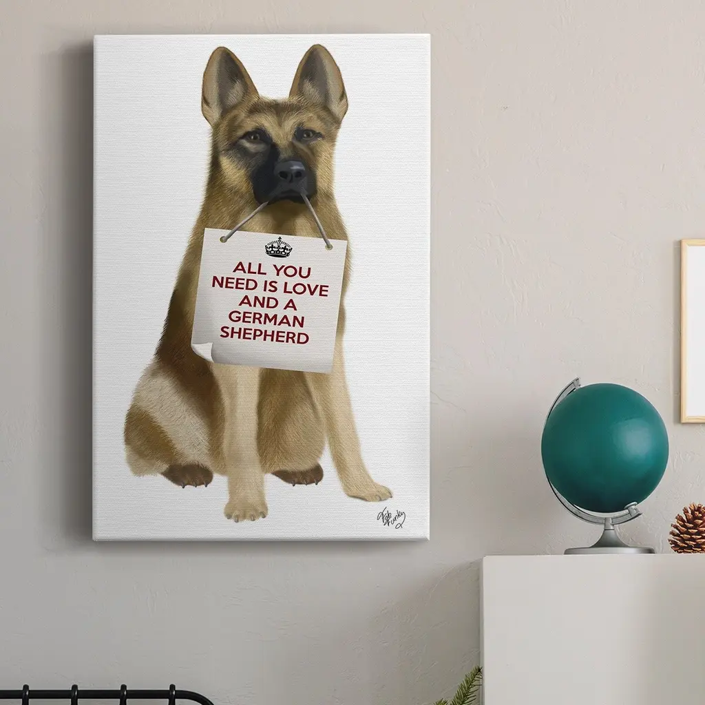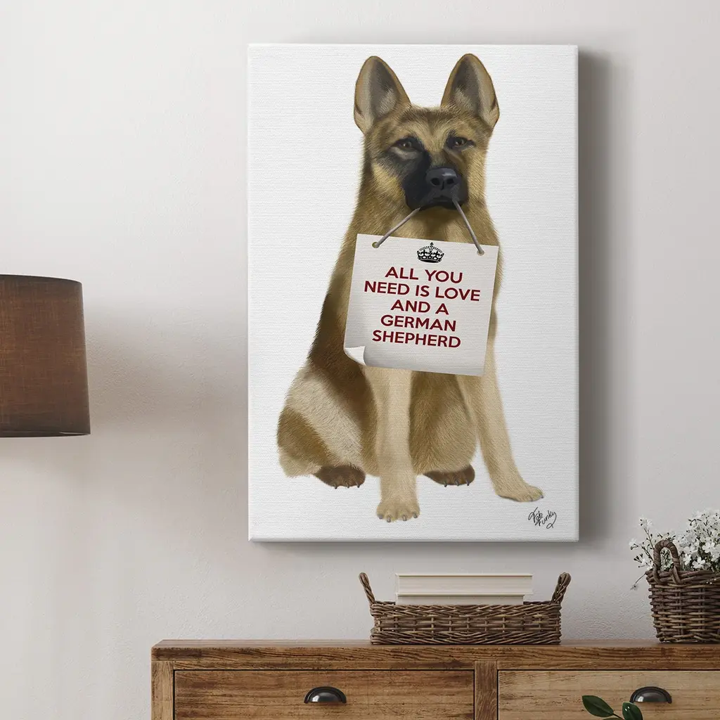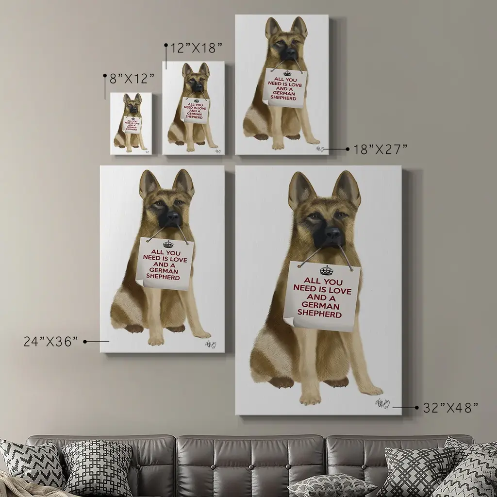 Love and German Shepherd Premium Gallery Wrapped Canvas - Ready to Hang A premium hand stretched gallery wrapped canvas print created to last. Featuring a beveled a solid wood stretcher bar, each piece comes ready to hand 6 SIZES AVAILABLE 8''X12'' - Overall Size 12''X18'' - Overall Size 18''X27'' - Overall Size 24''x36'' - Overall Size 32''x48'' - Overall Size 40''x60'' - Overall Size Each piece is made to order. Built to Last Each piece comes ready to hang Solid wood stretcher Fade and Water resistant Made domestically