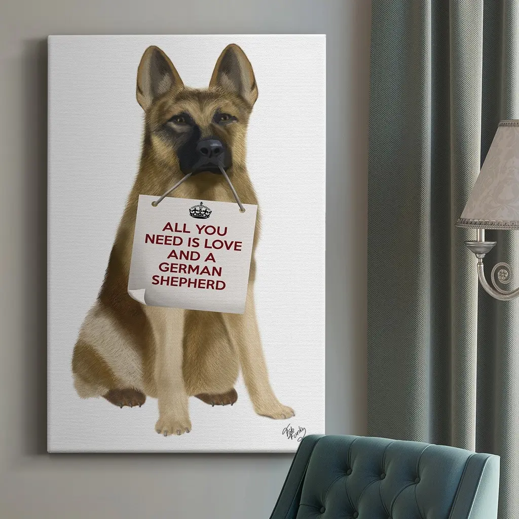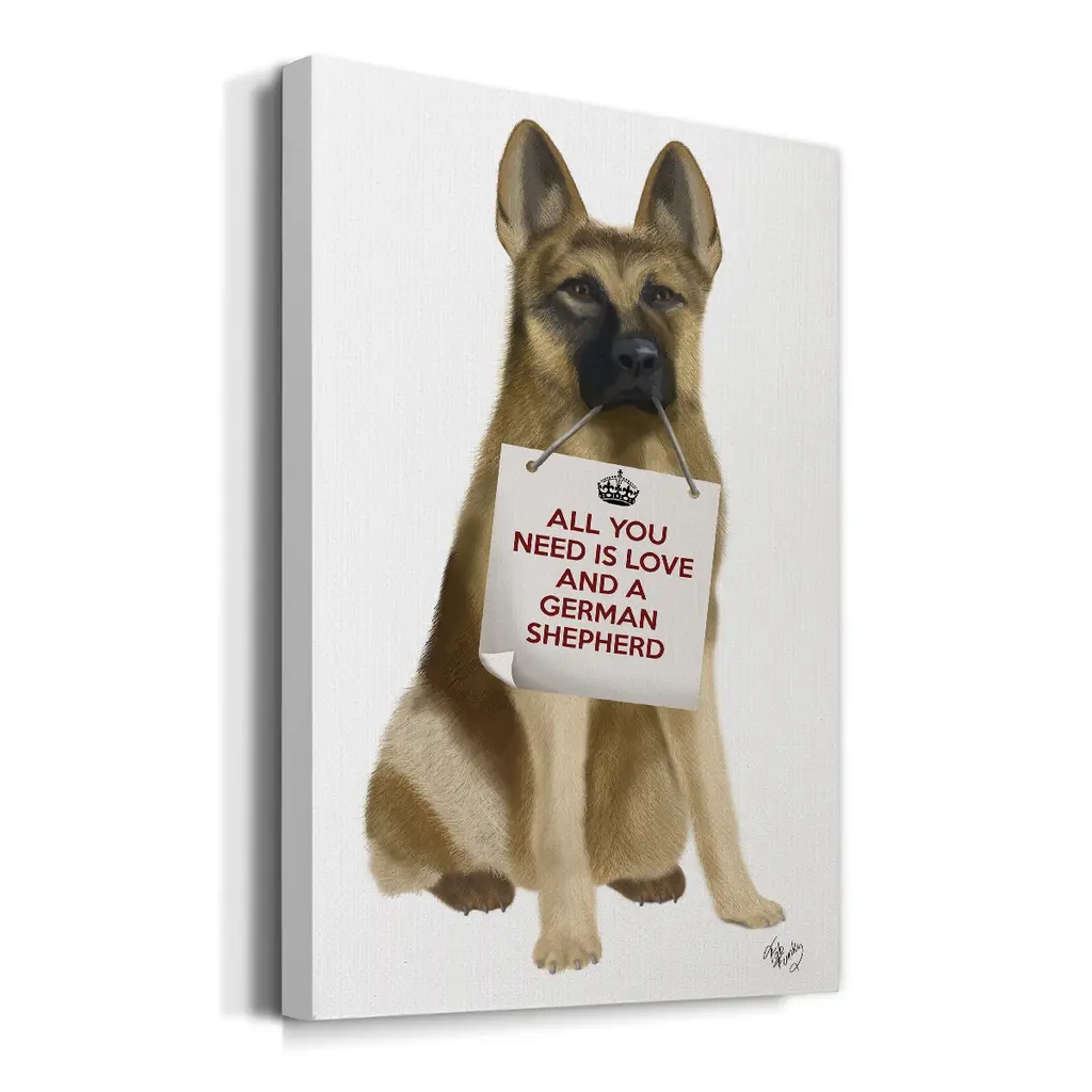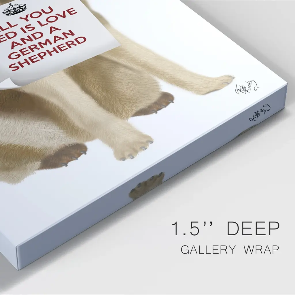 Love and German Shepherd Premium Gallery Wrapped Canvas - Ready to Hang A premium hand stretched gallery wrapped canvas print created to last. Featuring a beveled a solid wood stretcher bar, each piece comes ready to hand 6 SIZES AVAILABLE 8''X12'' - Overall Size 12''X18'' - Overall Size 18''X27'' - Overall Size 24''x36'' - Overall Size 32''x48'' - Overall Size 40''x60'' - Overall Size Each piece is made to order. Built to Last Each piece comes ready to hang Solid wood stretcher Fade and Water resistant Made domestically