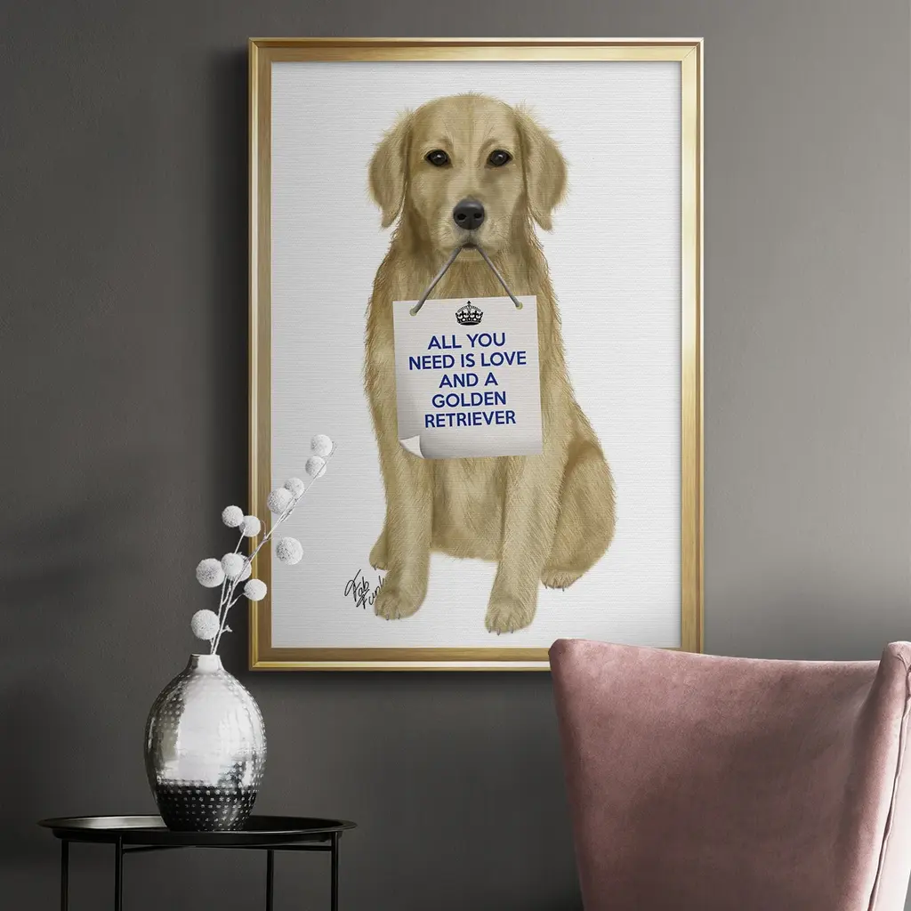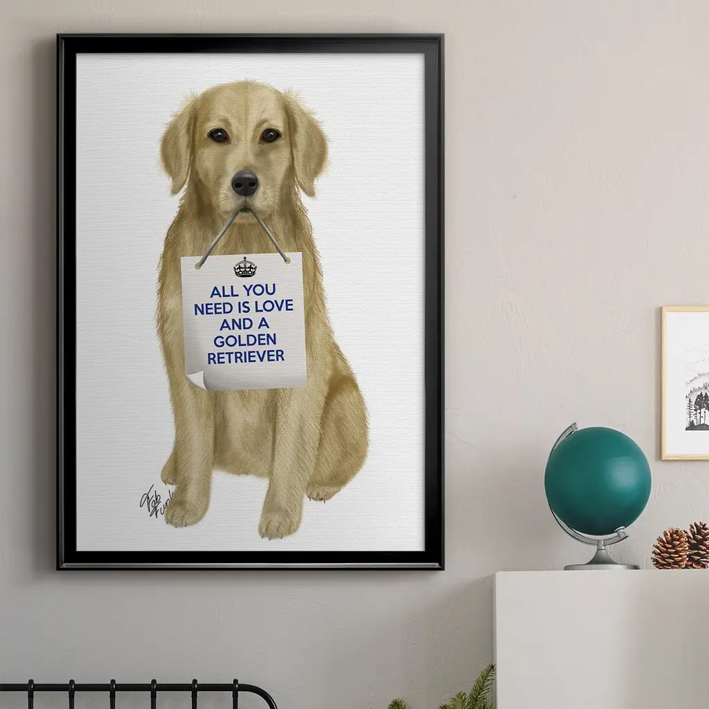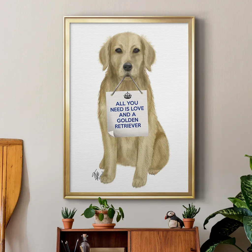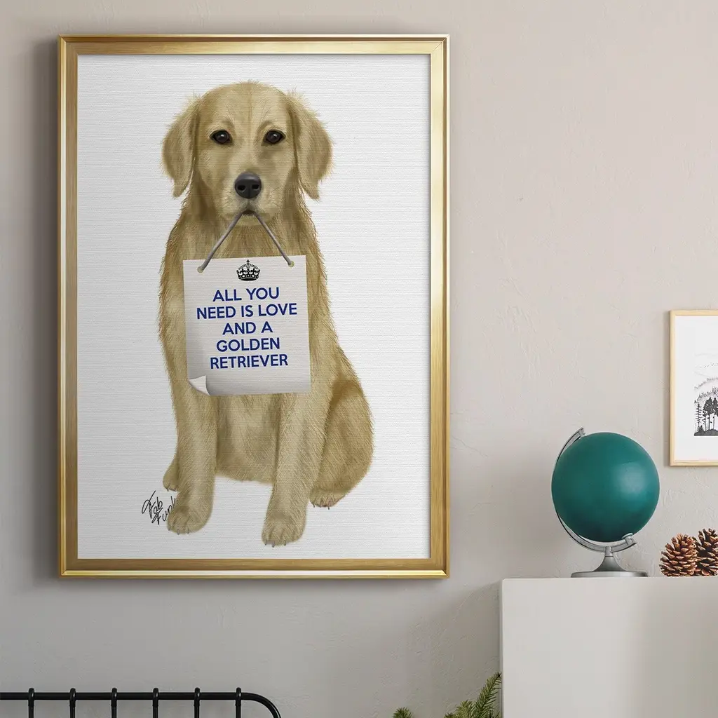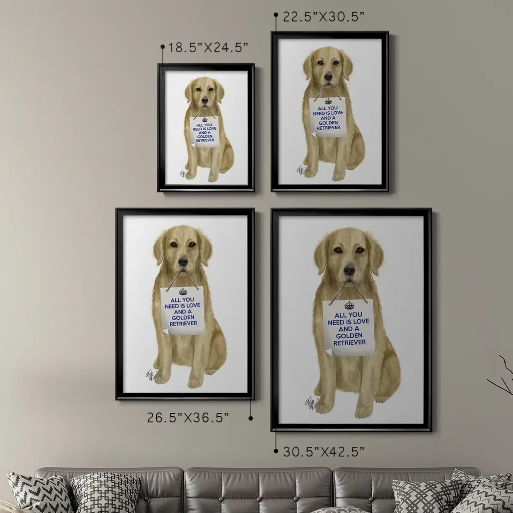Love and Golden Retriever Premium Framed Print - Ready to Hang A Premium Framed Print created to last. Framed in distressed wood and available in an array of sizes and colors Featuring a beveled a solid wood stretcher bar, each piece comes ready to hand 4 SIZES AVAILABLE 30.5''X42.5'' - Overall Size 26.5'X36.5'' - Overall Size 22.5''x30.5'' - Overall Size 18.5''x24.5'' - Overall Size Each piece is made to order. Each piece comes with hanging hardware. Made in the USA Ready to Hang