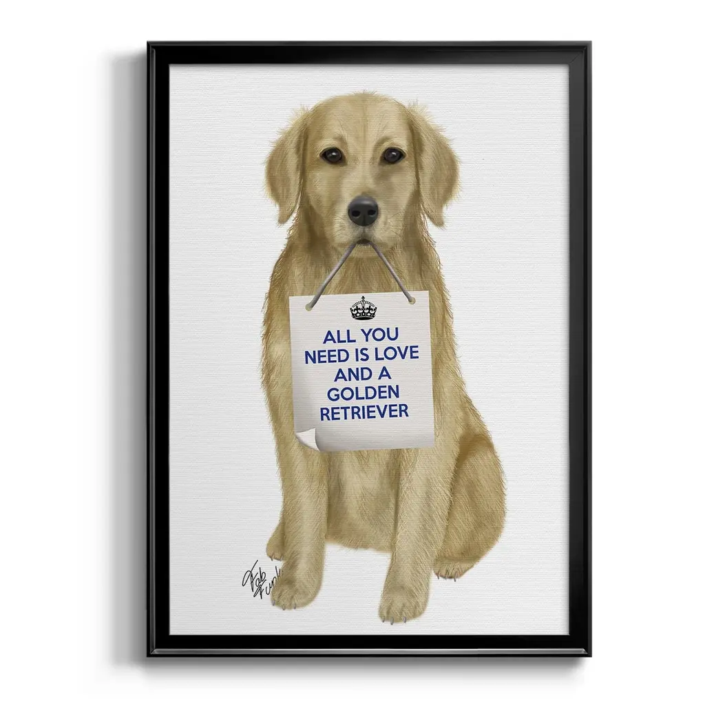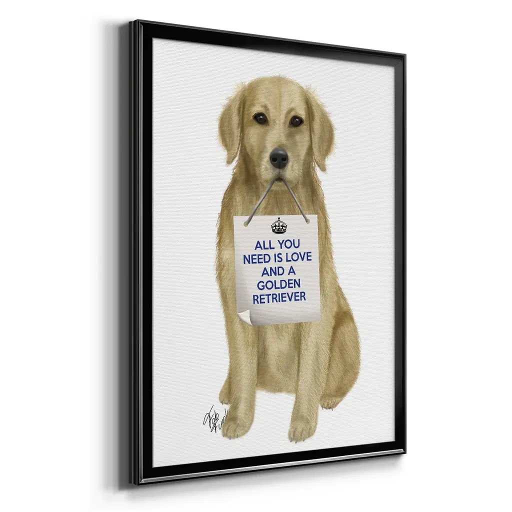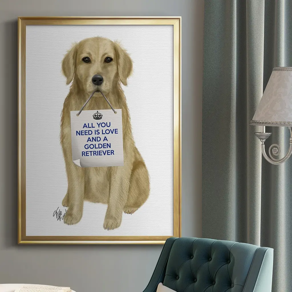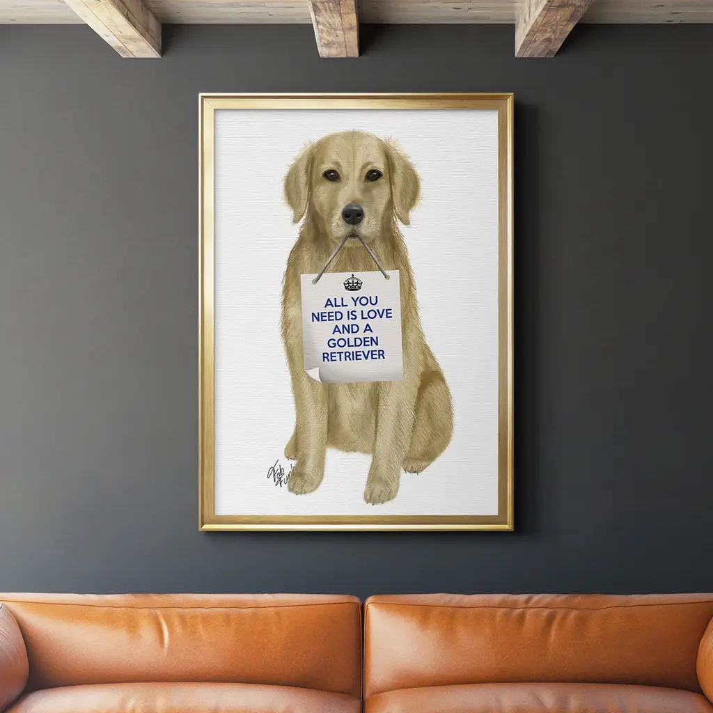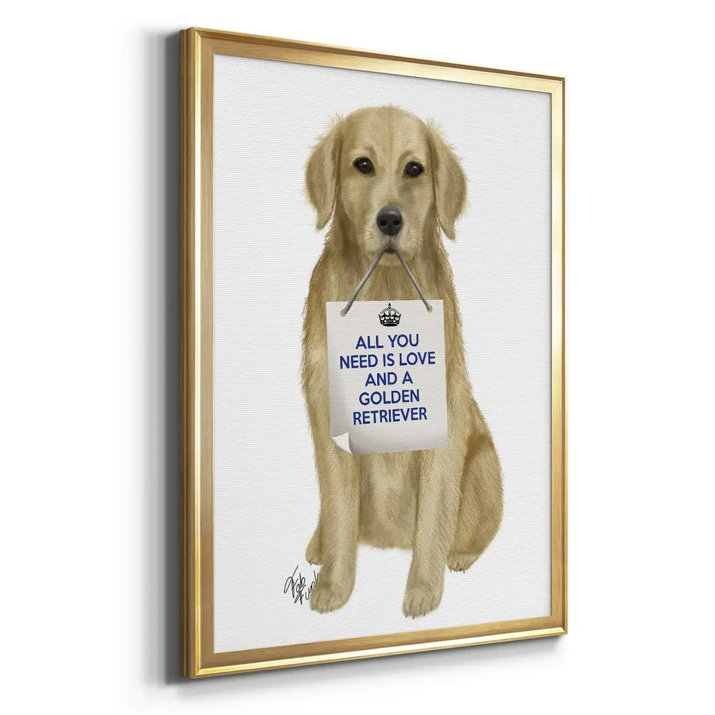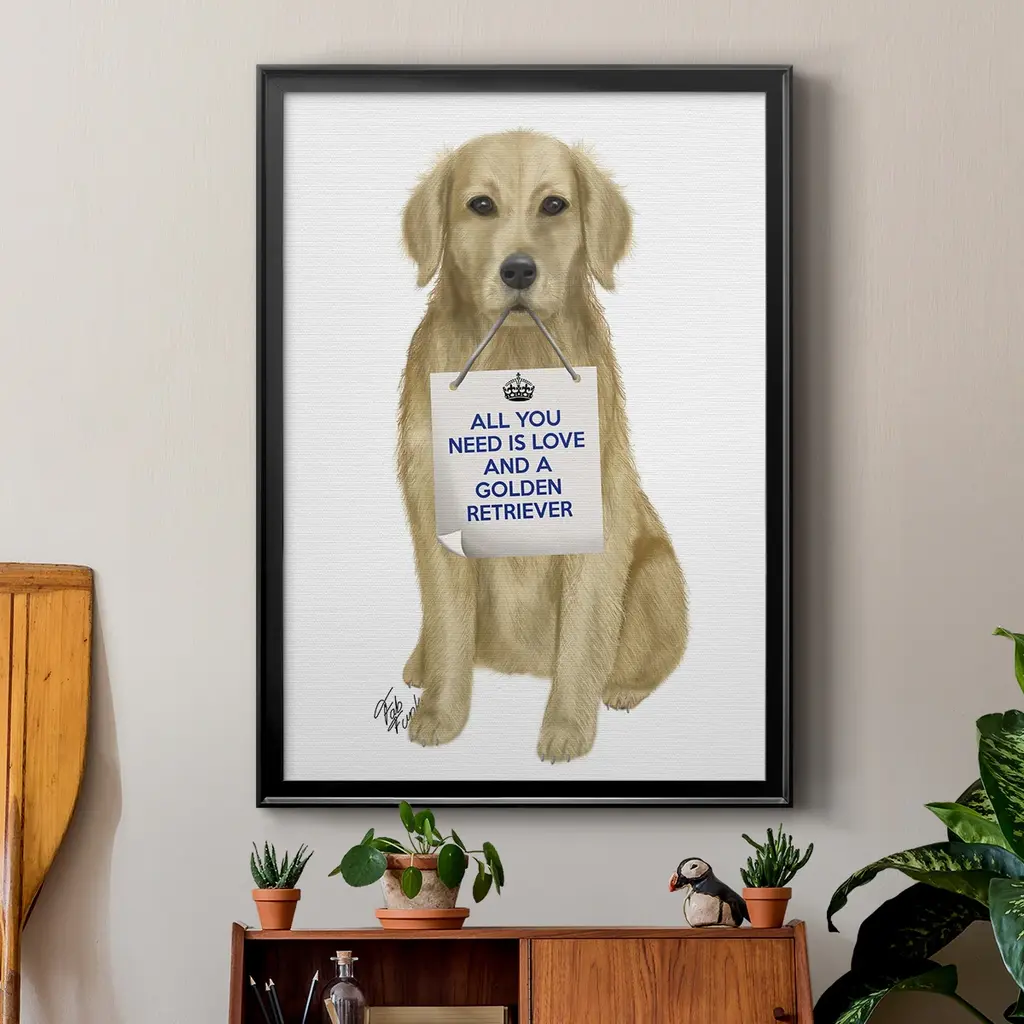 Love and Golden Retriever Premium Framed Print - Ready to Hang A Premium Framed Print created to last. Framed in distressed wood and available in an array of sizes and colors Featuring a beveled a solid wood stretcher bar, each piece comes ready to hand 4 SIZES AVAILABLE 30.5''X42.5'' - Overall Size 26.5'X36.5'' - Overall Size 22.5''x30.5'' - Overall Size 18.5''x24.5'' - Overall Size Each piece is made to order. Each piece comes with hanging hardware. Made in the USA Ready to Hang