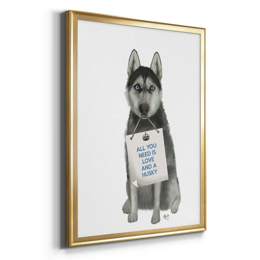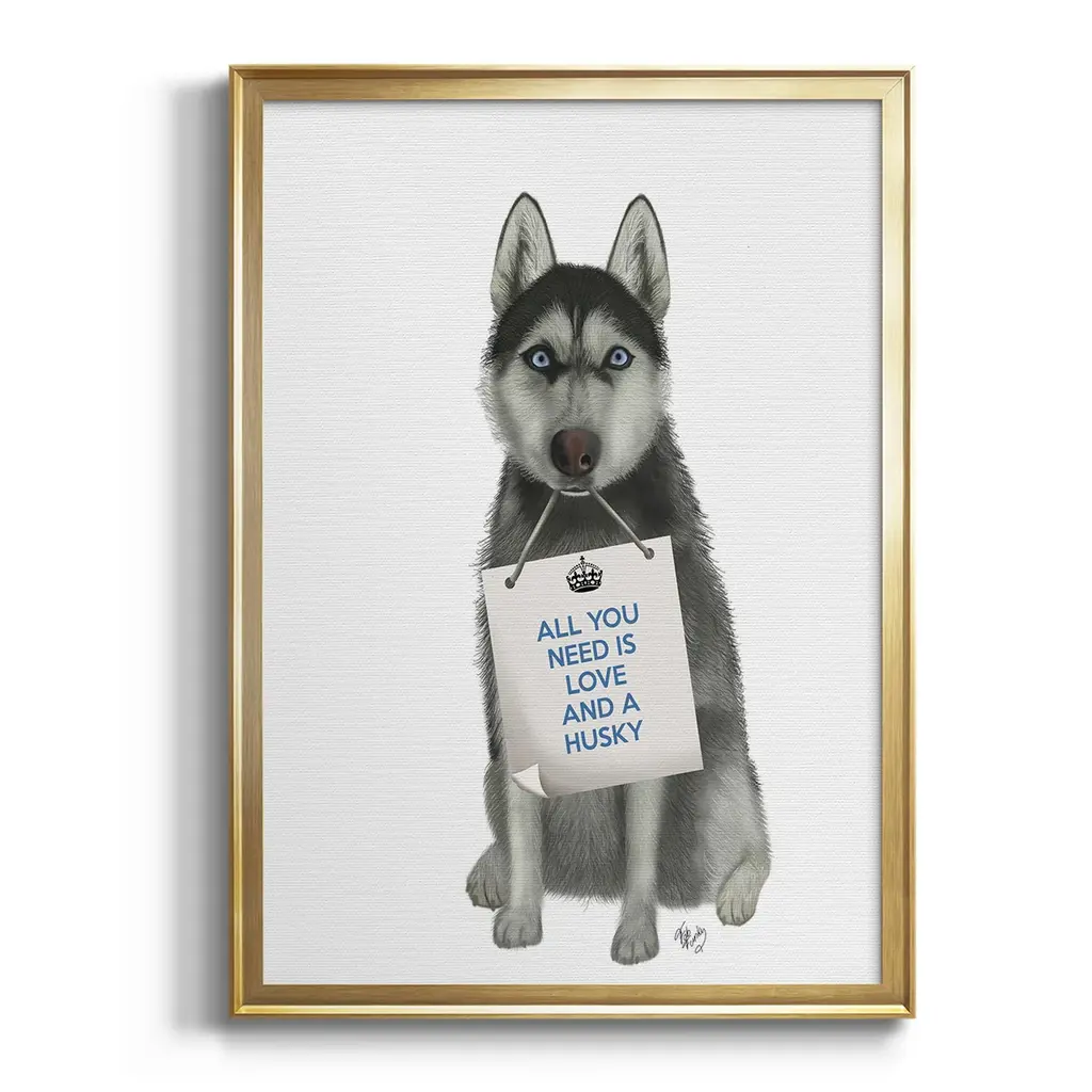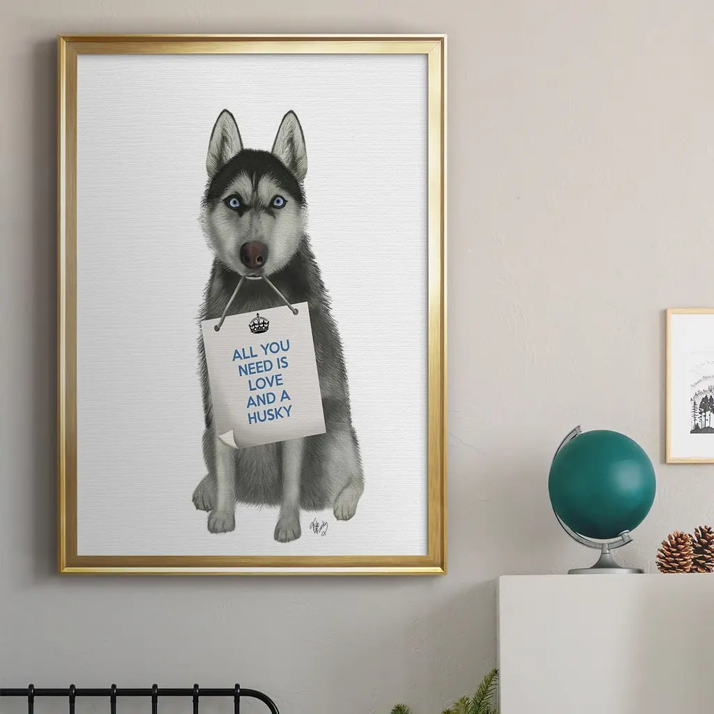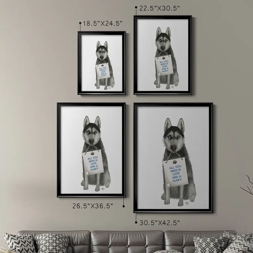 Love and Husky Premium Framed Print - Ready to Hang A Premium Framed Print created to last. Framed in distressed wood and available in an array of sizes and colors Featuring a beveled a solid wood stretcher bar, each piece comes ready to hand 4 SIZES AVAILABLE 30.5''X42.5'' - Overall Size 26.5'X36.5'' - Overall Size 22.5''x30.5'' - Overall Size 18.5''x24.5'' - Overall Size Each piece is made to order. Each piece comes with hanging hardware. Made in the USA Ready to Hang