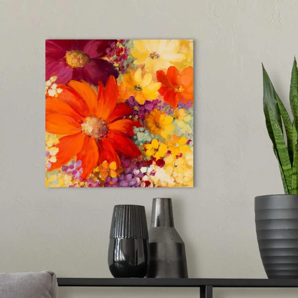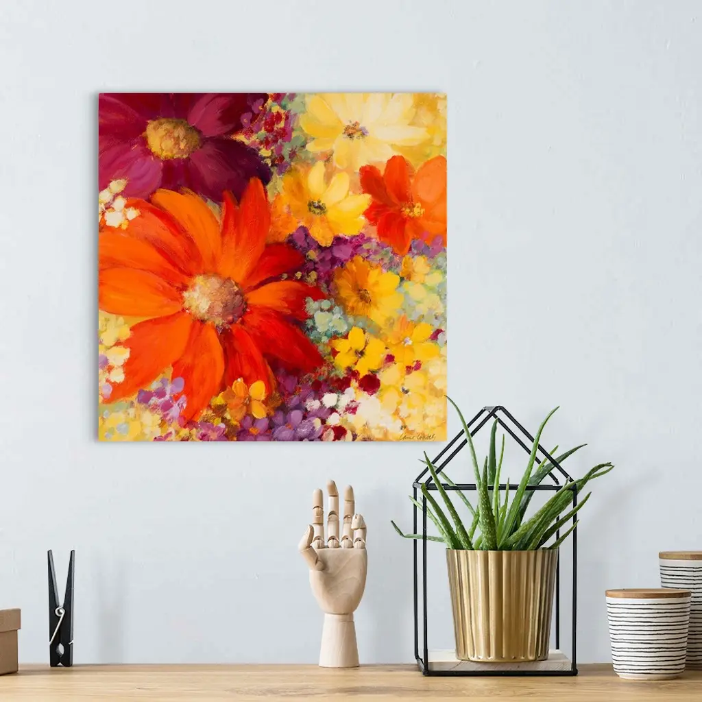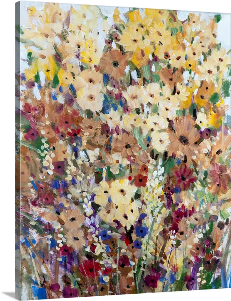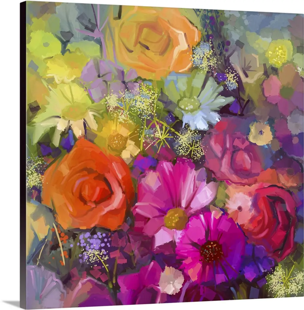 Closeup artwork of a variety of blooming flowers in mostly vibrant tones.