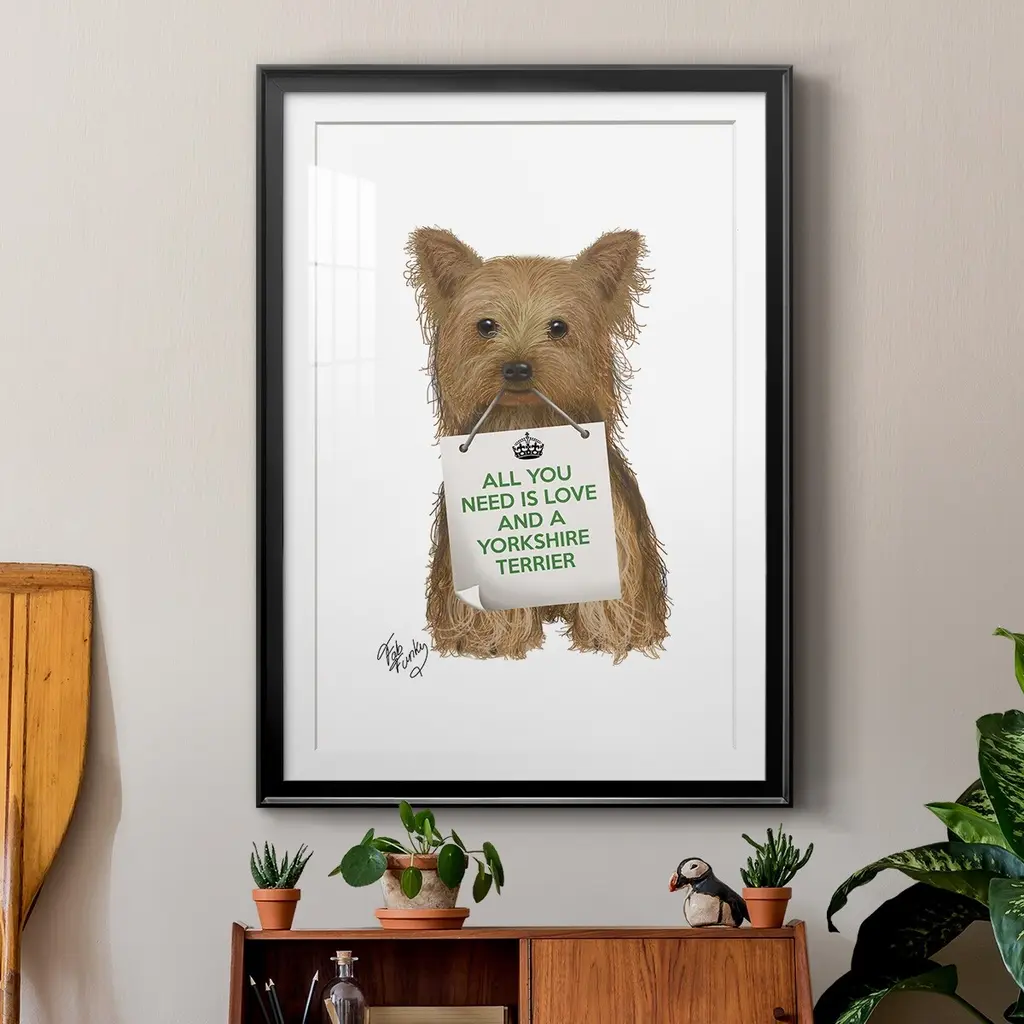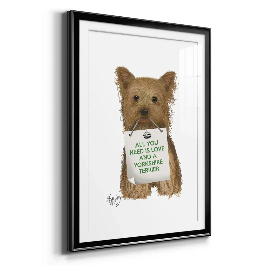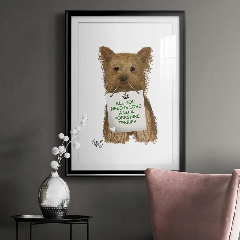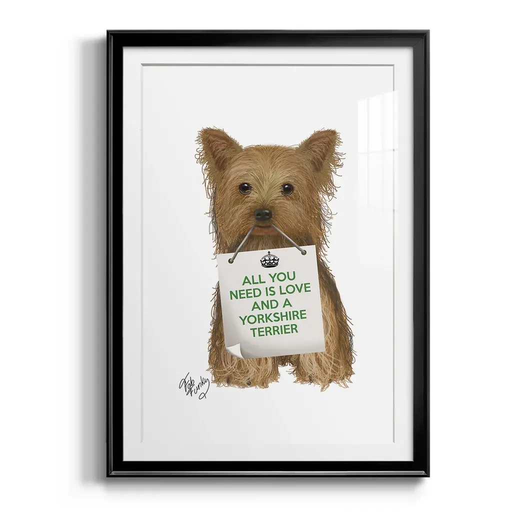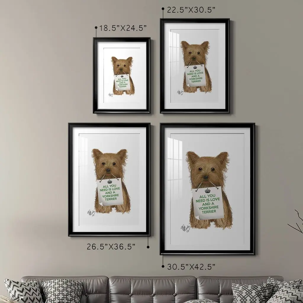 Love and Yorkshire Terrier Premium Framed Print - Ready to Hang A Premium Framed Print created to last. Framed in distressed wood and available in an array of sizes and colors Featuring a beveled a solid wood stretcher bar, each piece comes ready to hand 4 SIZES AVAILABLE 30.5''X42.5'' - Overall Size 26.5'X36.5'' - Overall Size 22.5''x30.5'' - Overall Size 18.5''x24.5'' - Overall Size Each piece is made to order. Each piece comes with hanging hardware. Made in the USA Ready to Hang Giclee Paper Print Acrylic Glass Beveled Matt Board