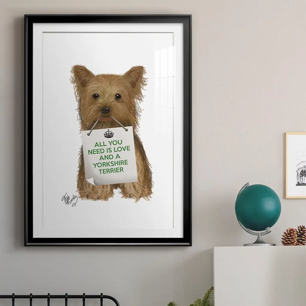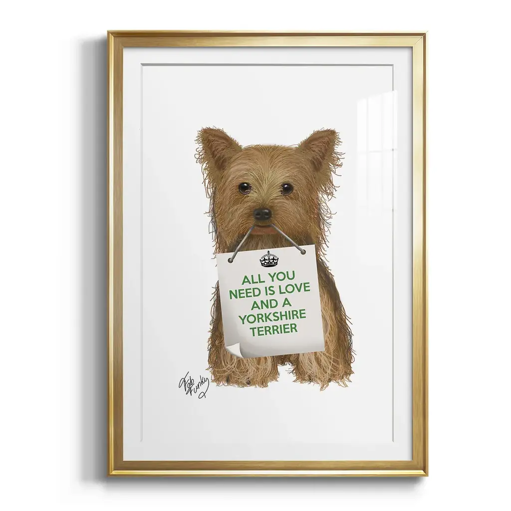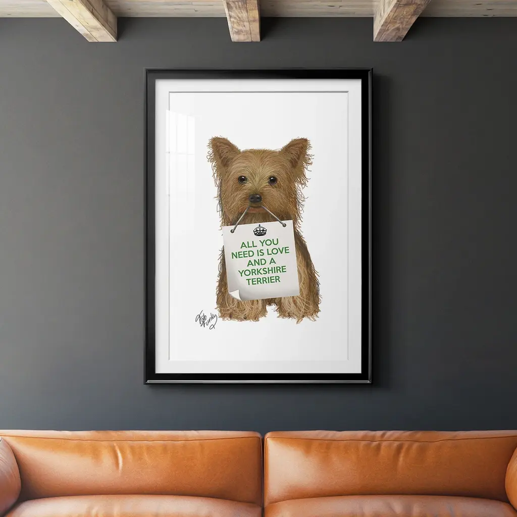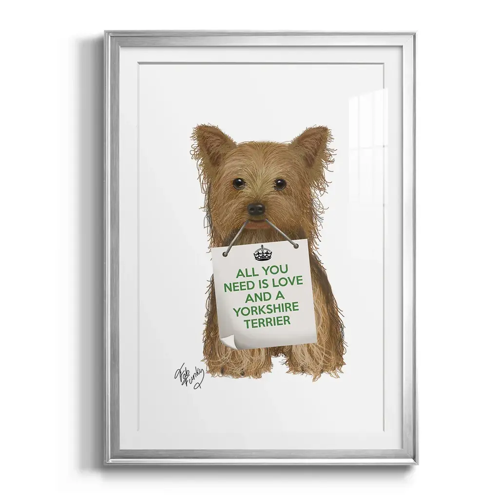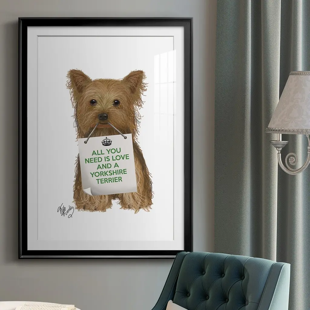 Love and Yorkshire Terrier Premium Framed Print - Ready to Hang A Premium Framed Print created to last. Framed in distressed wood and available in an array of sizes and colors Featuring a beveled a solid wood stretcher bar, each piece comes ready to hand 4 SIZES AVAILABLE 30.5''X42.5'' - Overall Size 26.5'X36.5'' - Overall Size 22.5''x30.5'' - Overall Size 18.5''x24.5'' - Overall Size Each piece is made to order. Each piece comes with hanging hardware. Made in the USA Ready to Hang Giclee Paper Print Acrylic Glass Beveled Matt Board
