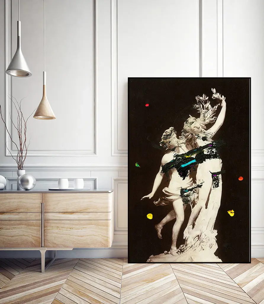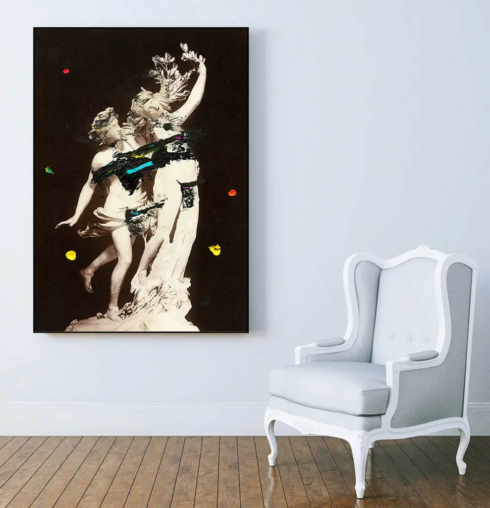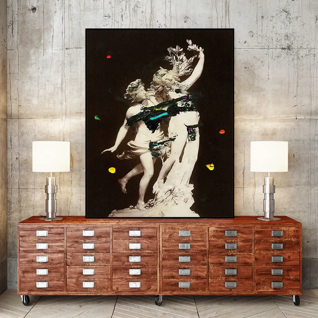 Your ready to hang artwork is printed on canvas then stretched and mounted to a 2-inch thick - hand stained black wood frame. Arrives at your door complete with an easy to use self-leveling hangking kit.