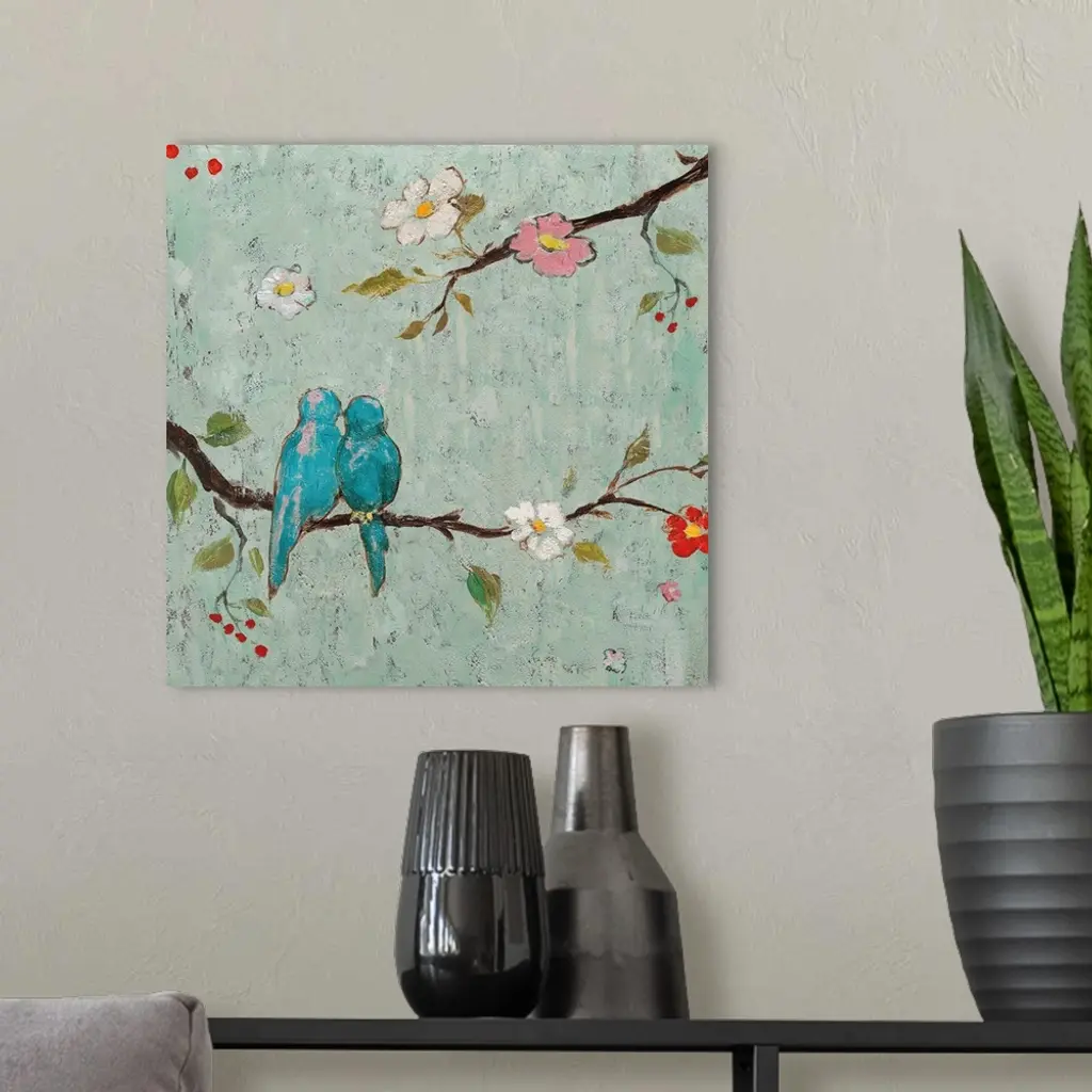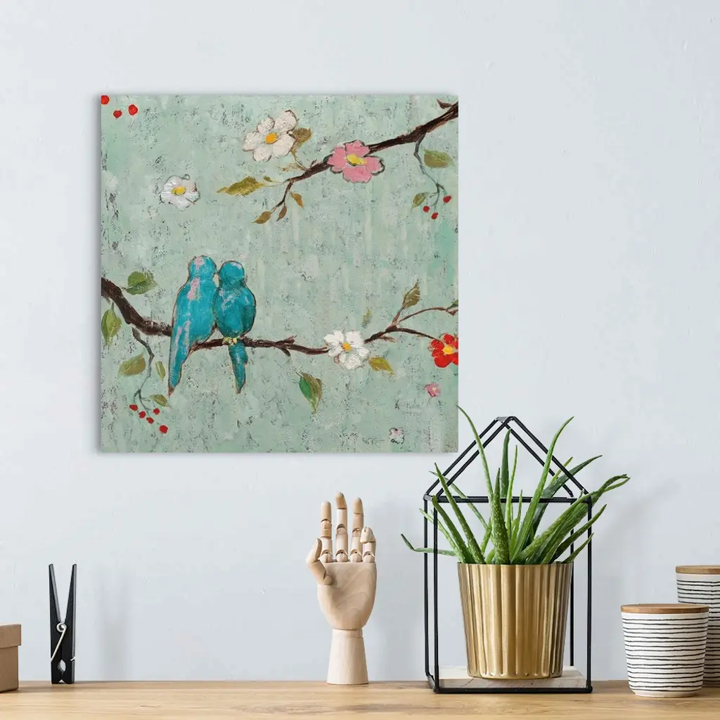 Contemporary square painting of two blue birds sitting on a tree branch with berries, leaves, and flowers on an eggshell blue background.