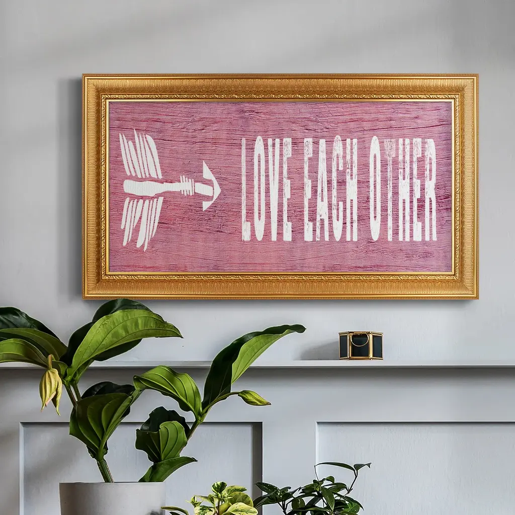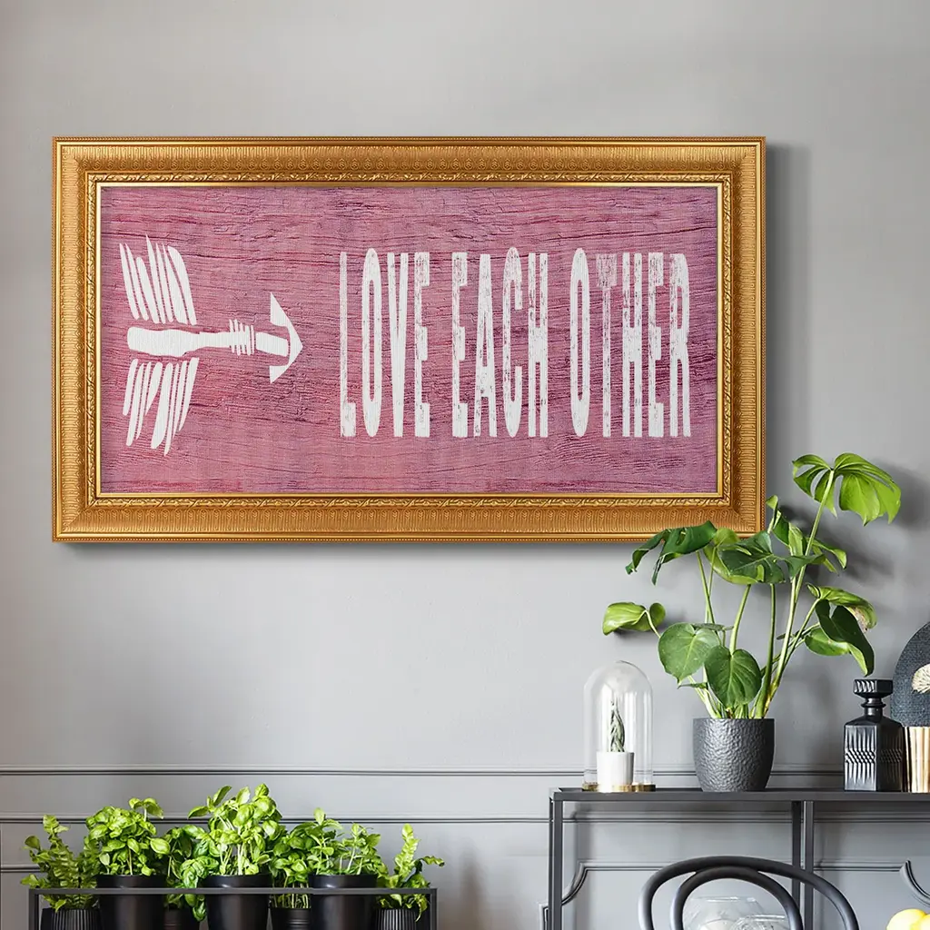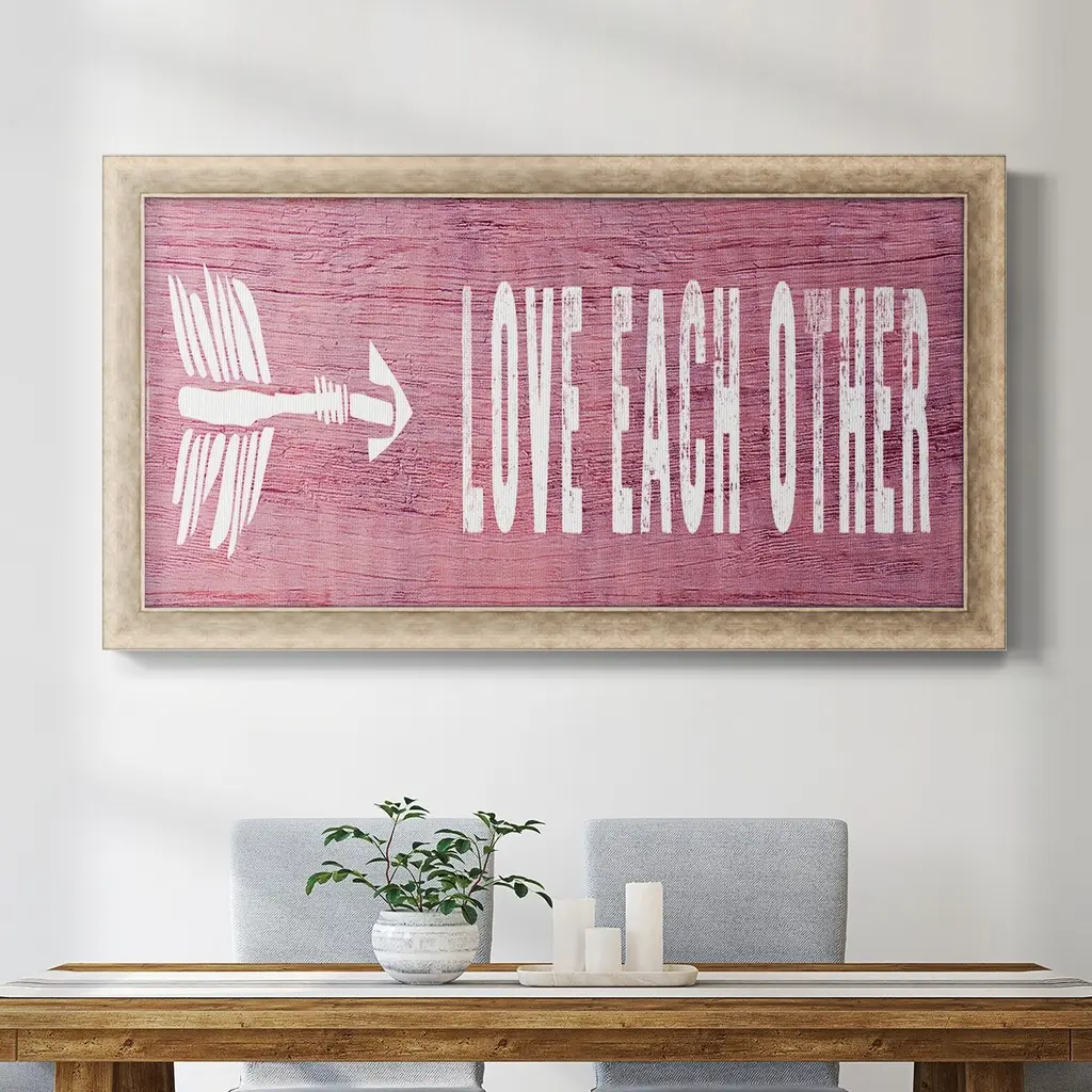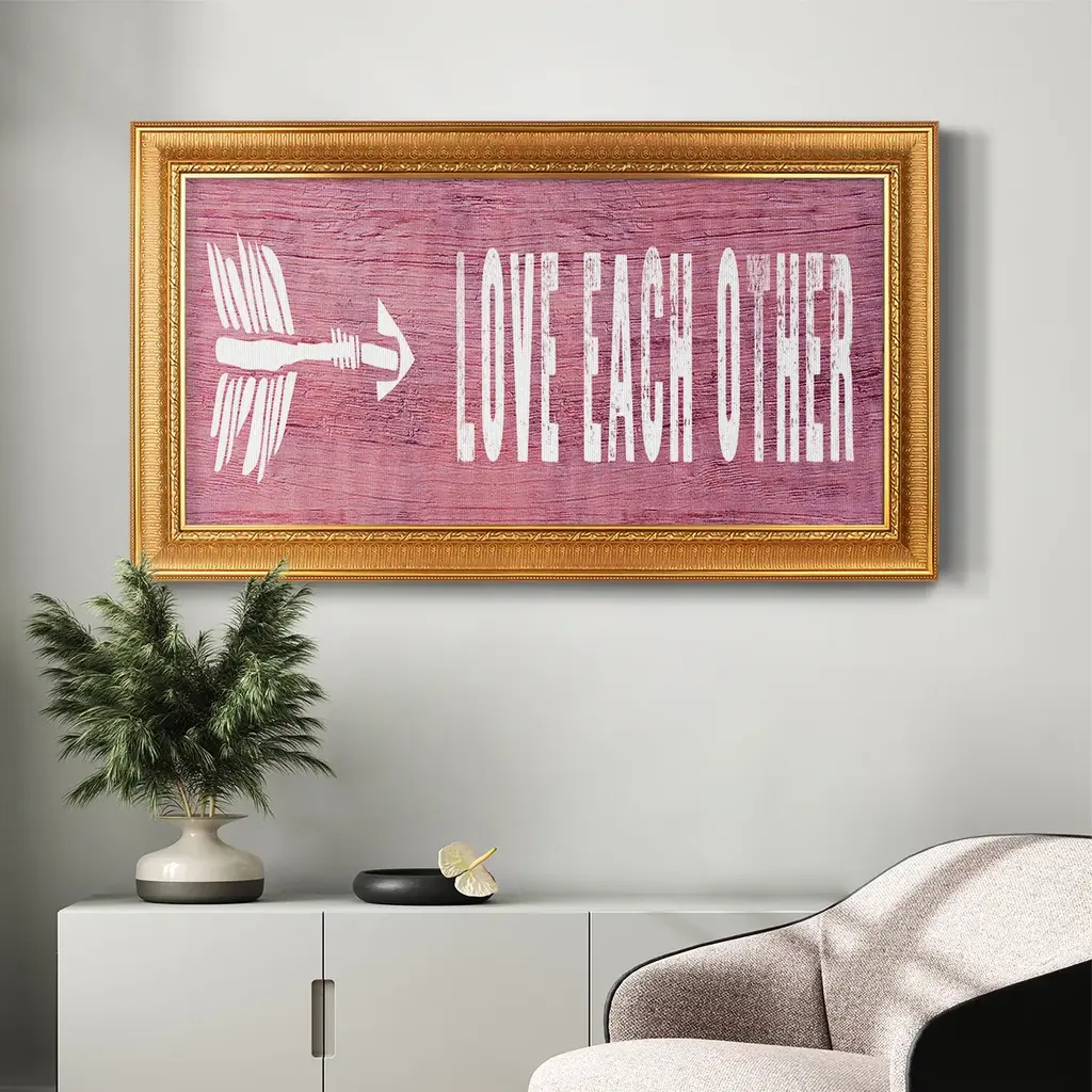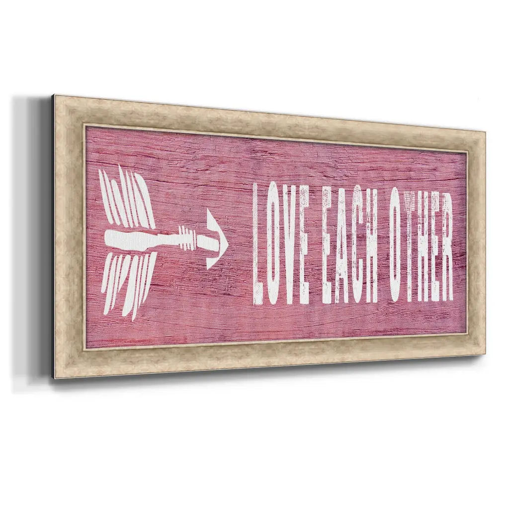 Love Each Other Premium Framed Canvas- Ready to Hang A Premium Framed Canvas created to last. Framed in distressed wood and available in an array of sizes and colors Featuring a beveled a solid wood stretcher bar, each piece comes ready to hand 3 SIZES AVAILABLE 21''X37'' - Overall Size 25''X45'' - Overall Size 29''x53'' - Overall Size Each piece is made to order. Each piece comes with hanging hardware. Made in the USA Ready to Hang Giclee Paper Print Acrylic Glass Beveled Matt Board