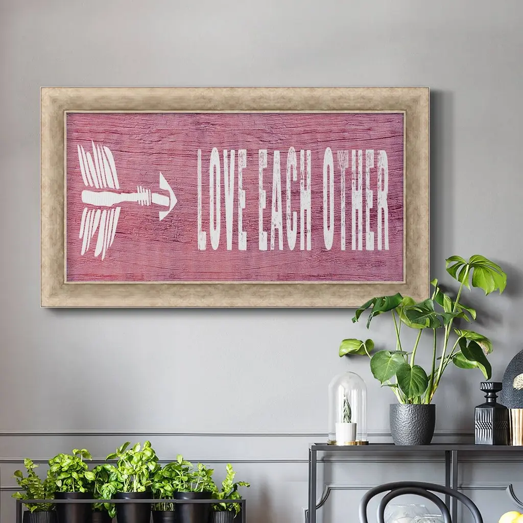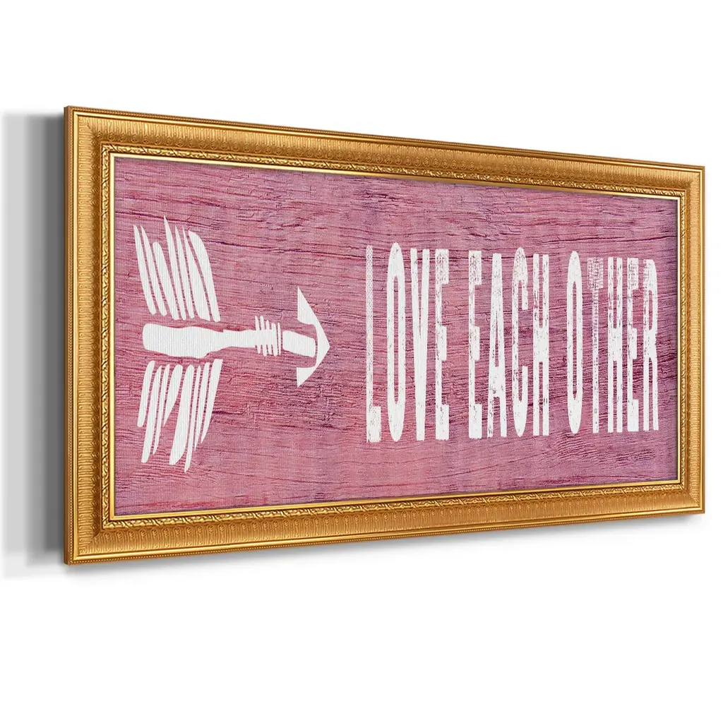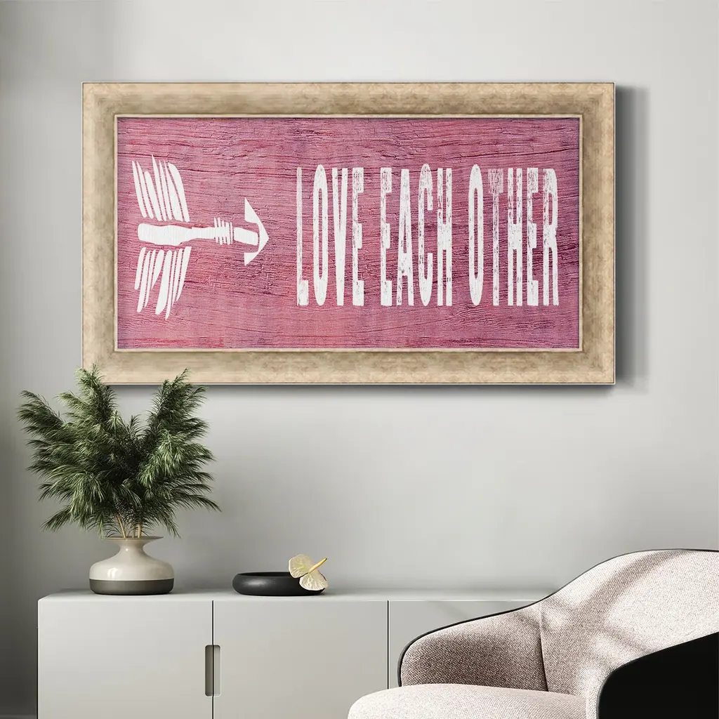 Love Each Other Premium Framed Canvas- Ready to Hang A Premium Framed Canvas created to last. Framed in distressed wood and available in an array of sizes and colors Featuring a beveled a solid wood stretcher bar, each piece comes ready to hand 3 SIZES AVAILABLE 21''X37'' - Overall Size 25''X45'' - Overall Size 29''x53'' - Overall Size Each piece is made to order. Each piece comes with hanging hardware. Made in the USA Ready to Hang Giclee Paper Print Acrylic Glass Beveled Matt Board