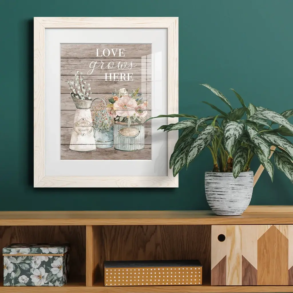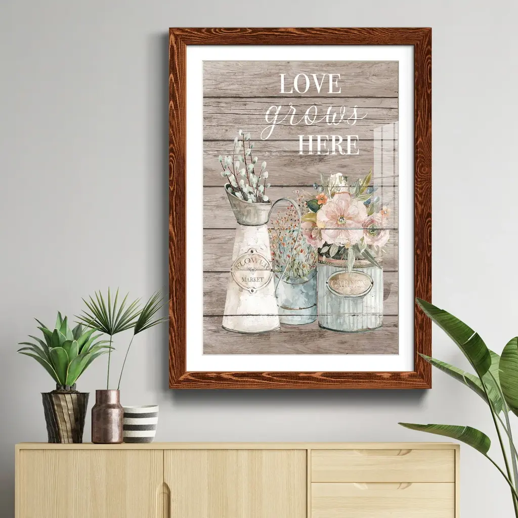 Love Grows Here-Premium Framed Print - Ready to Hang Framed in distressed wood and available in an array of sizes and colors Each piece is joined and assembled by hand and comes ready to hang 2 INCH BEVELED MATTE BOARD PLEXIGLASS COVERING READY TO HANG MADE IN THE USA SOLID WOOD FRAME MADE IN USA FADE RESISTANT GICLEE PRINTING on Canvas or Paper