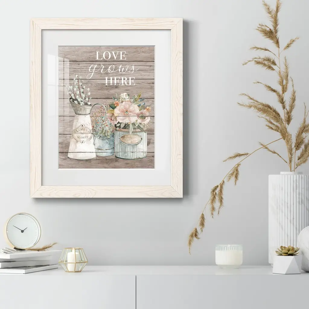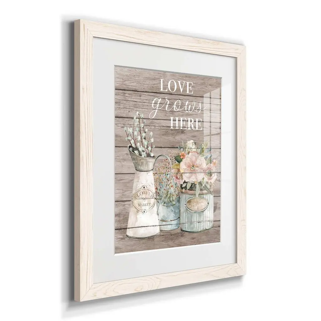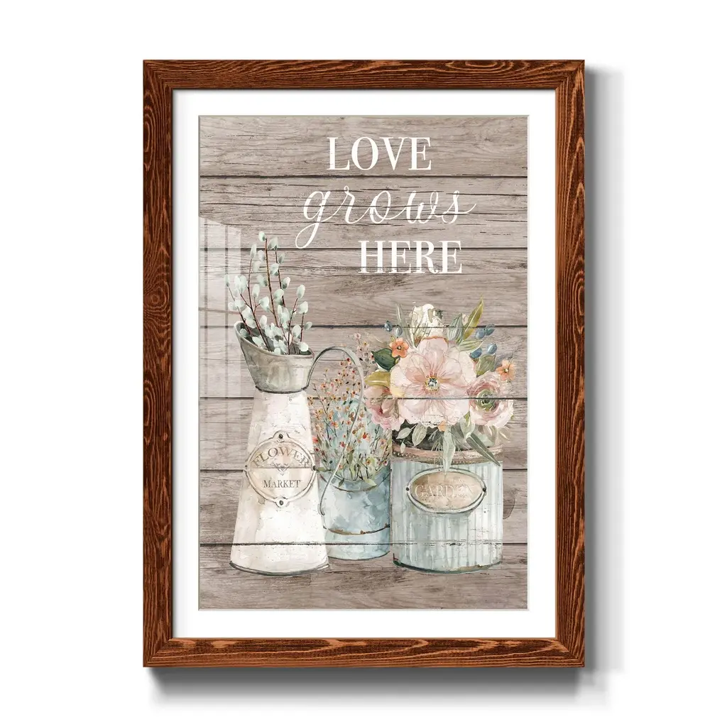 Love Grows Here-Premium Framed Print - Ready to Hang Framed in distressed wood and available in an array of sizes and colors Each piece is joined and assembled by hand and comes ready to hang 2 INCH BEVELED MATTE BOARD PLEXIGLASS COVERING READY TO HANG MADE IN THE USA SOLID WOOD FRAME MADE IN USA FADE RESISTANT GICLEE PRINTING on Canvas or Paper