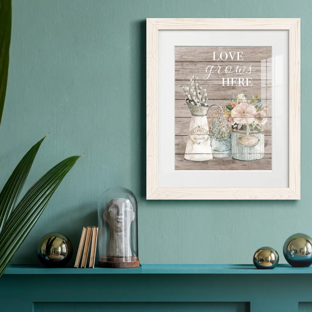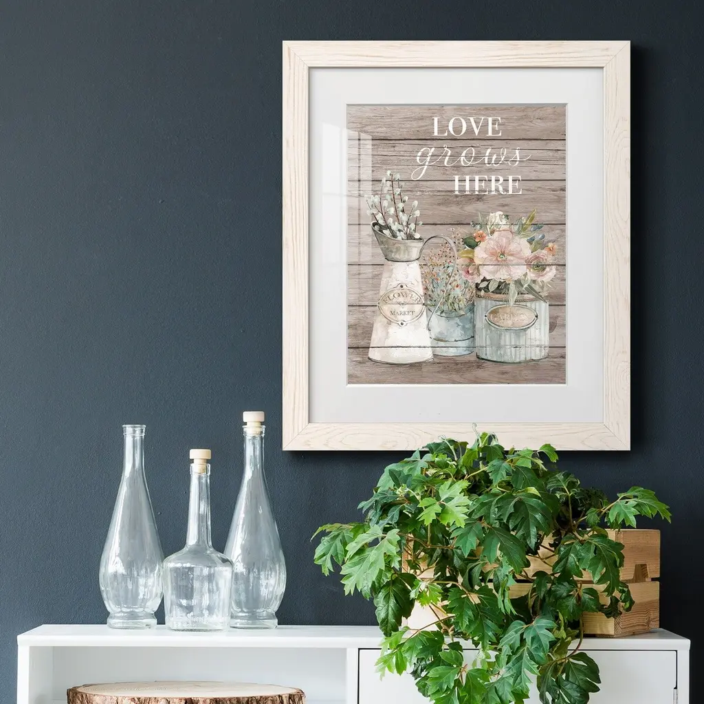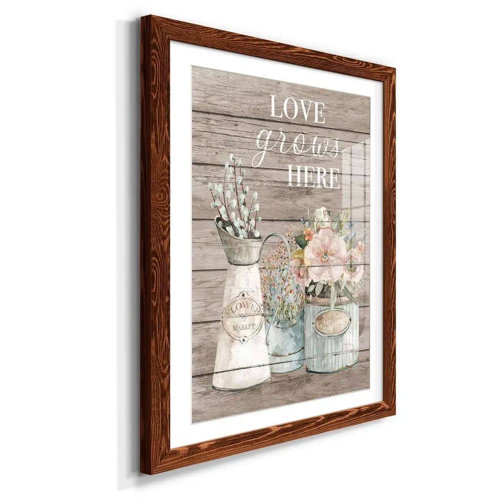 Love Grows Here-Premium Framed Print - Ready to Hang Framed in distressed wood and available in an array of sizes and colors Each piece is joined and assembled by hand and comes ready to hang 2 INCH BEVELED MATTE BOARD PLEXIGLASS COVERING READY TO HANG MADE IN THE USA SOLID WOOD FRAME MADE IN USA FADE RESISTANT GICLEE PRINTING on Canvas or Paper