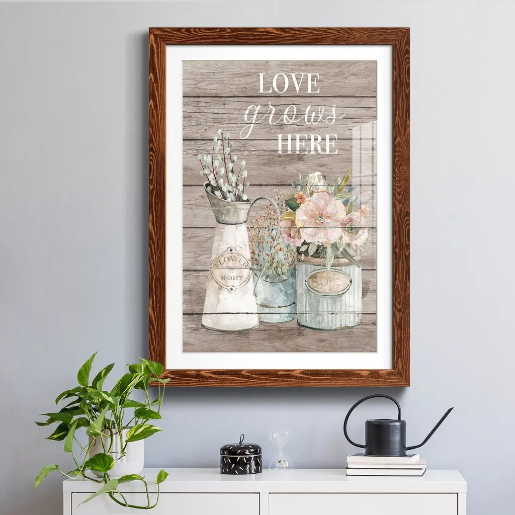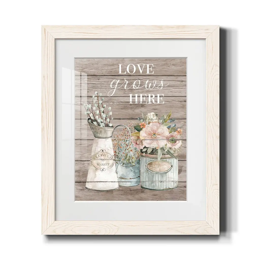 Love Grows Here-Premium Framed Print - Ready to Hang Framed in distressed wood and available in an array of sizes and colors Each piece is joined and assembled by hand and comes ready to hang 2 INCH BEVELED MATTE BOARD PLEXIGLASS COVERING READY TO HANG MADE IN THE USA SOLID WOOD FRAME MADE IN USA FADE RESISTANT GICLEE PRINTING on Canvas or Paper