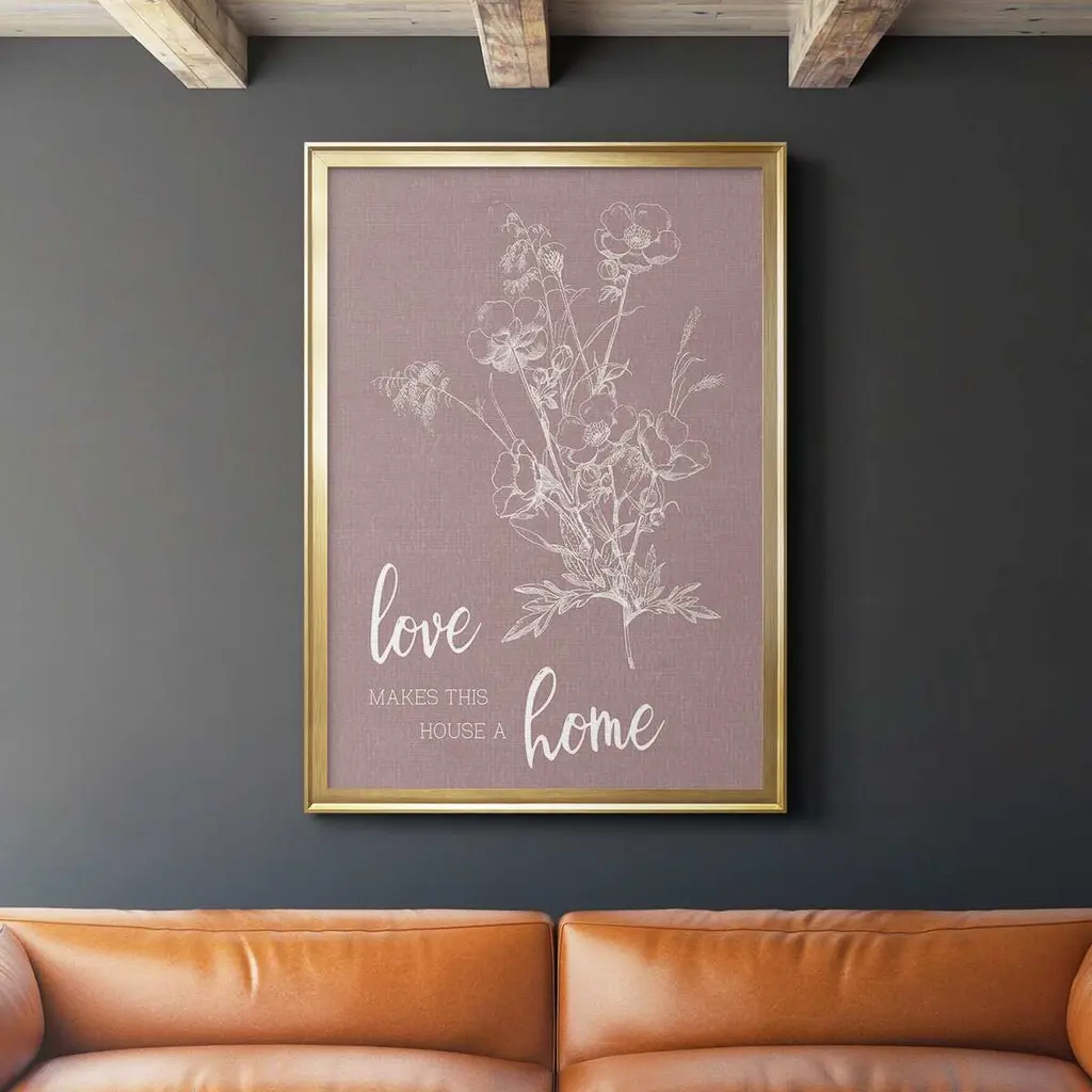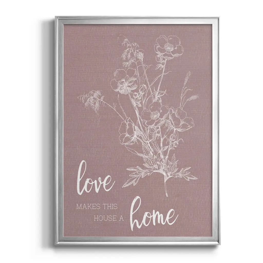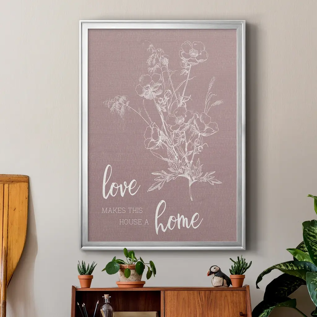 Love Home Premium Framed Print - Ready to Hang A Premium Framed Print created to last. Framed in distressed wood and available in an array of sizes and colors Featuring a beveled a solid wood stretcher bar, each piece comes ready to hand 4 SIZES AVAILABLE 30.5''X42.5'' - Overall Size 26.5'X36.5'' - Overall Size 22.5''x30.5'' - Overall Size 18.5''x24.5'' - Overall Size Each piece is made to order. Each piece comes with hanging hardware. Made in the USA Ready to Hang