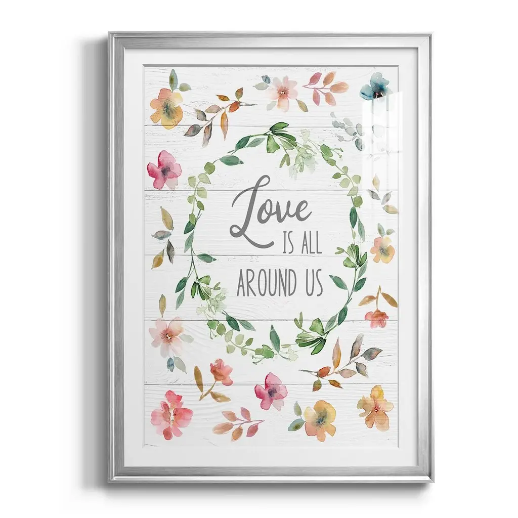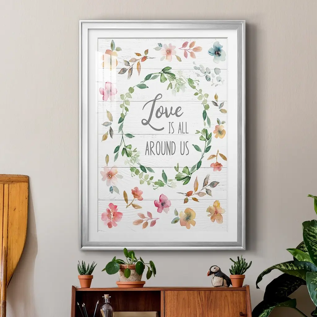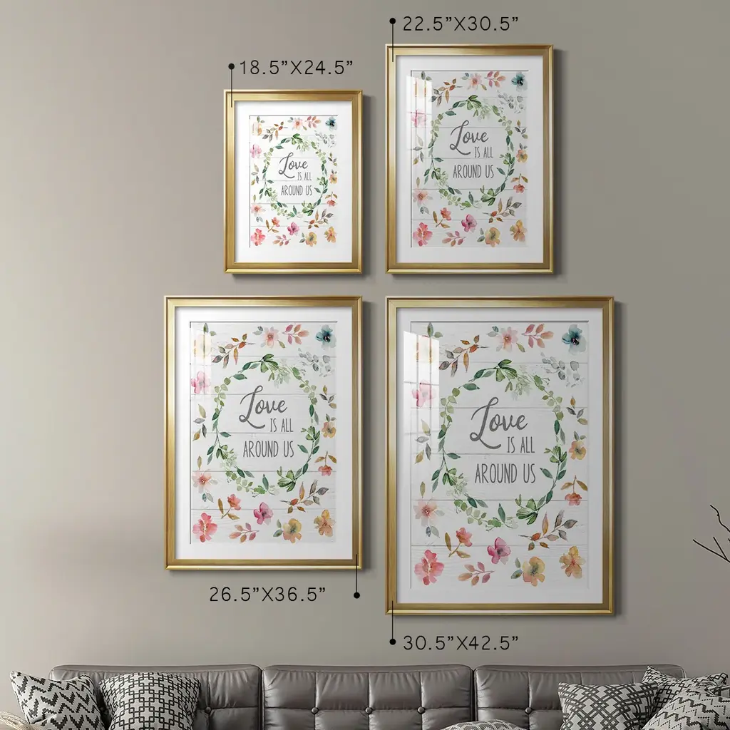 Love is All Around Us Premium Framed Print - Ready to Hang A Premium Framed Print created to last. Framed in distressed wood and available in an array of sizes and colors Featuring a beveled a solid wood stretcher bar, each piece comes ready to hand 4 SIZES AVAILABLE 30.5''X42.5'' - Overall Size 26.5'X36.5'' - Overall Size 22.5''x30.5'' - Overall Size 18.5''x24.5'' - Overall Size Each piece is made to order. Each piece comes with hanging hardware. Made in the USA Ready to Hang Giclee Paper Print Acrylic Glass Beveled Matt Board