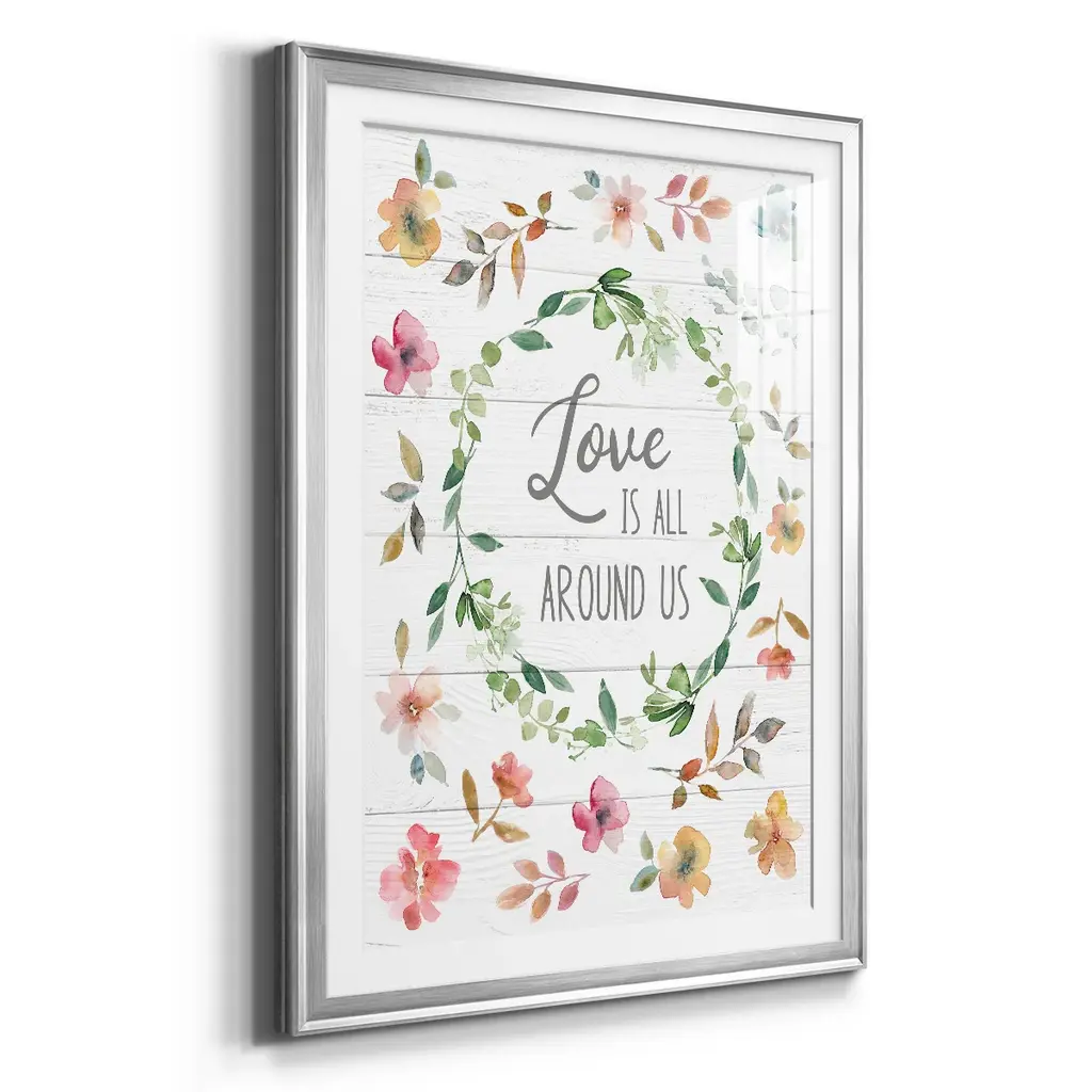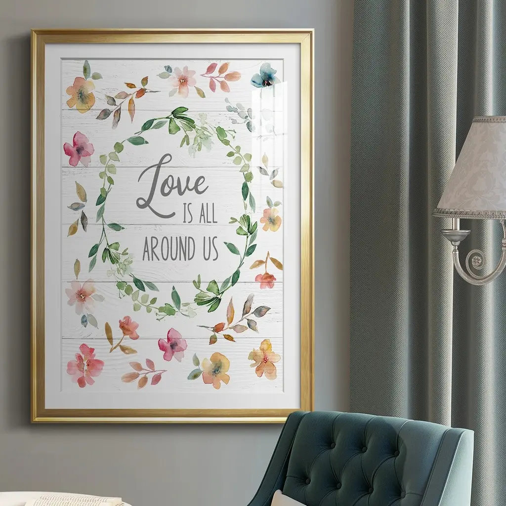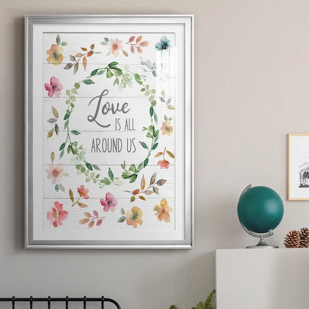 Love is All Around Us Premium Framed Print - Ready to Hang A Premium Framed Print created to last. Framed in distressed wood and available in an array of sizes and colors Featuring a beveled a solid wood stretcher bar, each piece comes ready to hand 4 SIZES AVAILABLE 30.5''X42.5'' - Overall Size 26.5'X36.5'' - Overall Size 22.5''x30.5'' - Overall Size 18.5''x24.5'' - Overall Size Each piece is made to order. Each piece comes with hanging hardware. Made in the USA Ready to Hang Giclee Paper Print Acrylic Glass Beveled Matt Board