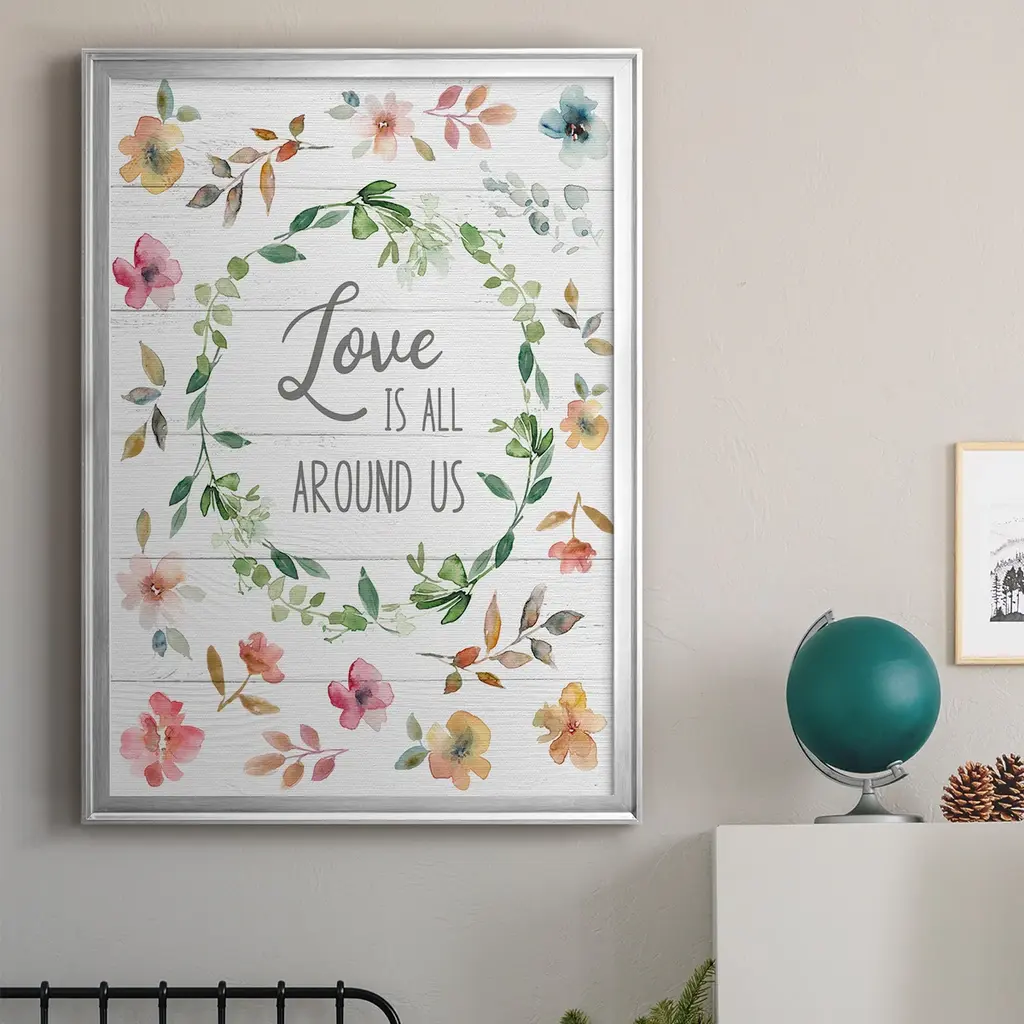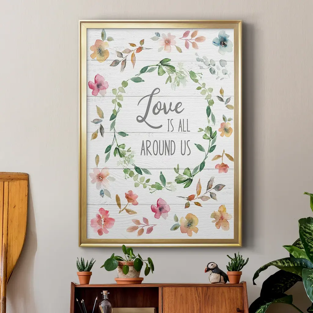Love is All Around Us Premium Framed Print - Ready to Hang A Premium Framed Print created to last. Framed in distressed wood and available in an array of sizes and colors Featuring a beveled a solid wood stretcher bar, each piece comes ready to hand 4 SIZES AVAILABLE 30.5''X42.5'' - Overall Size 26.5'X36.5'' - Overall Size 22.5''x30.5'' - Overall Size 18.5''x24.5'' - Overall Size Each piece is made to order. Each piece comes with hanging hardware. Made in the USA Ready to Hang