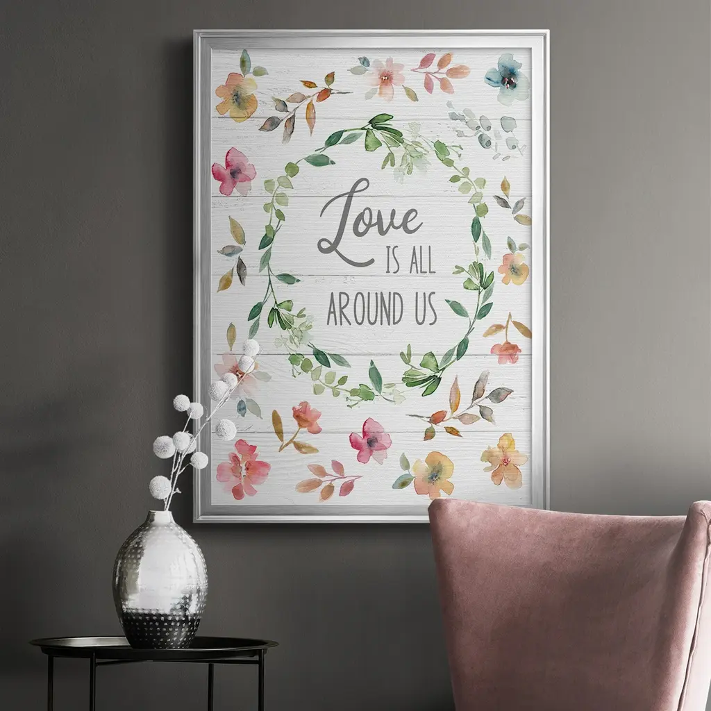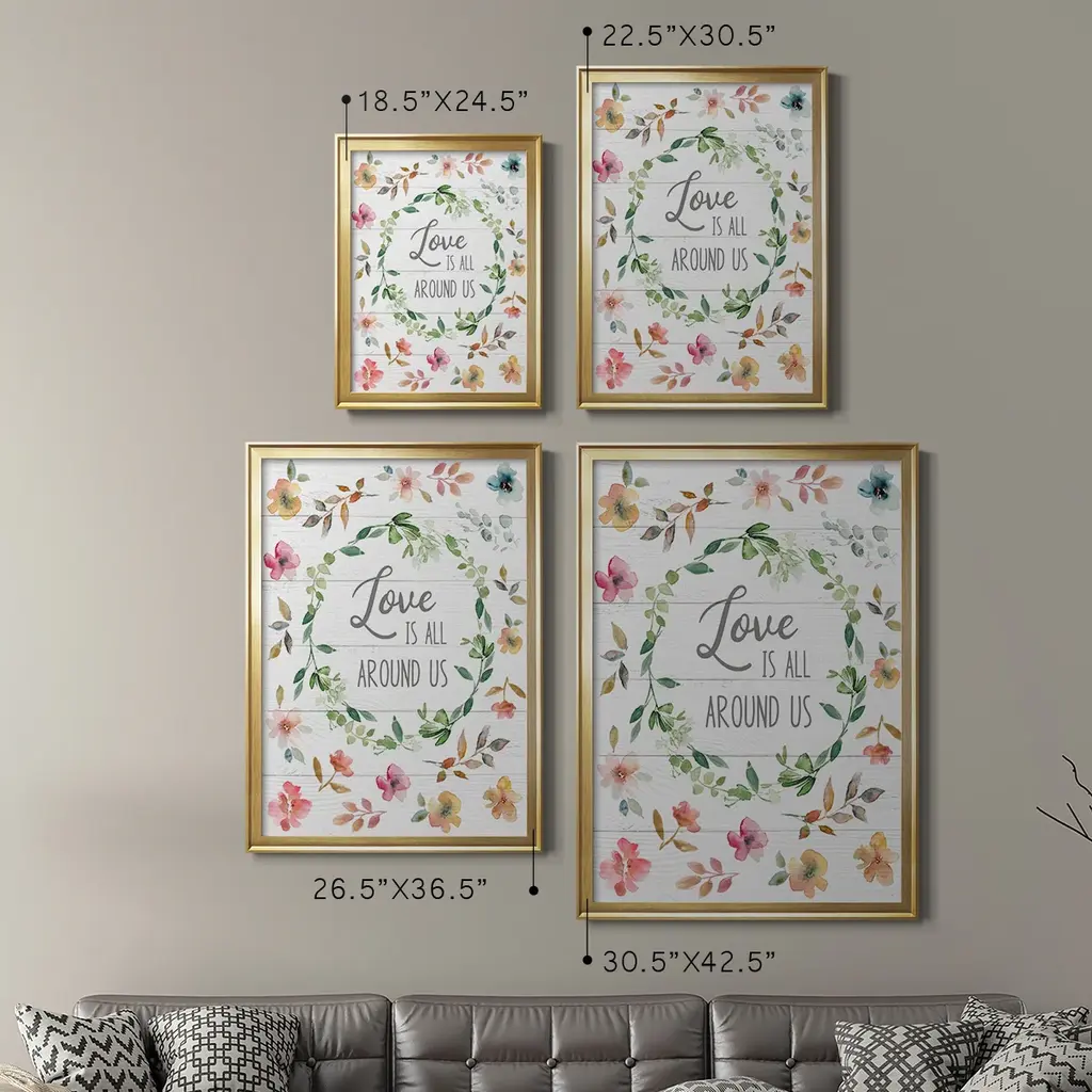 Love is All Around Us Premium Framed Print - Ready to Hang A Premium Framed Print created to last. Framed in distressed wood and available in an array of sizes and colors Featuring a beveled a solid wood stretcher bar, each piece comes ready to hand 4 SIZES AVAILABLE 30.5''X42.5'' - Overall Size 26.5'X36.5'' - Overall Size 22.5''x30.5'' - Overall Size 18.5''x24.5'' - Overall Size Each piece is made to order. Each piece comes with hanging hardware. Made in the USA Ready to Hang