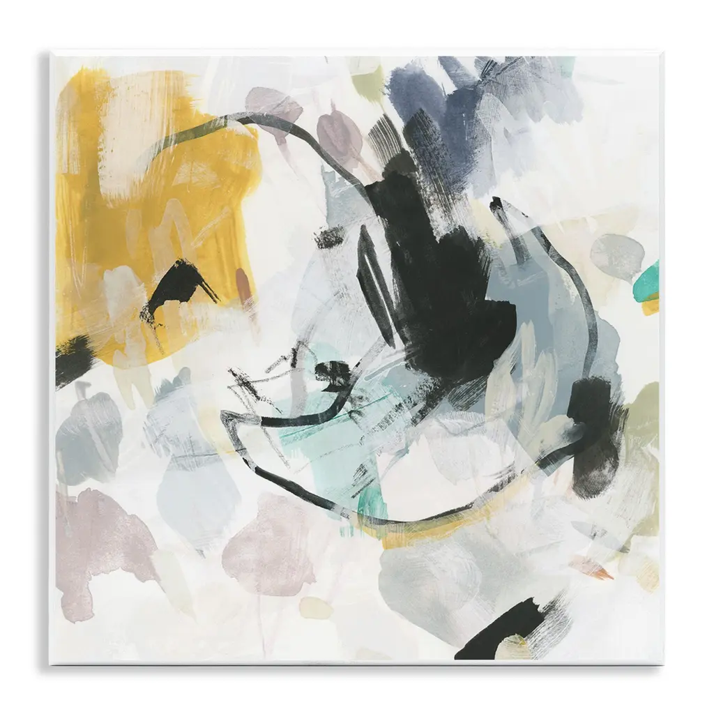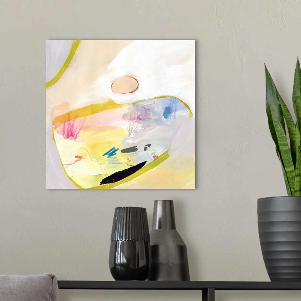 Contemporary abstract painting in various colors with large circular shapes in bright yellow.