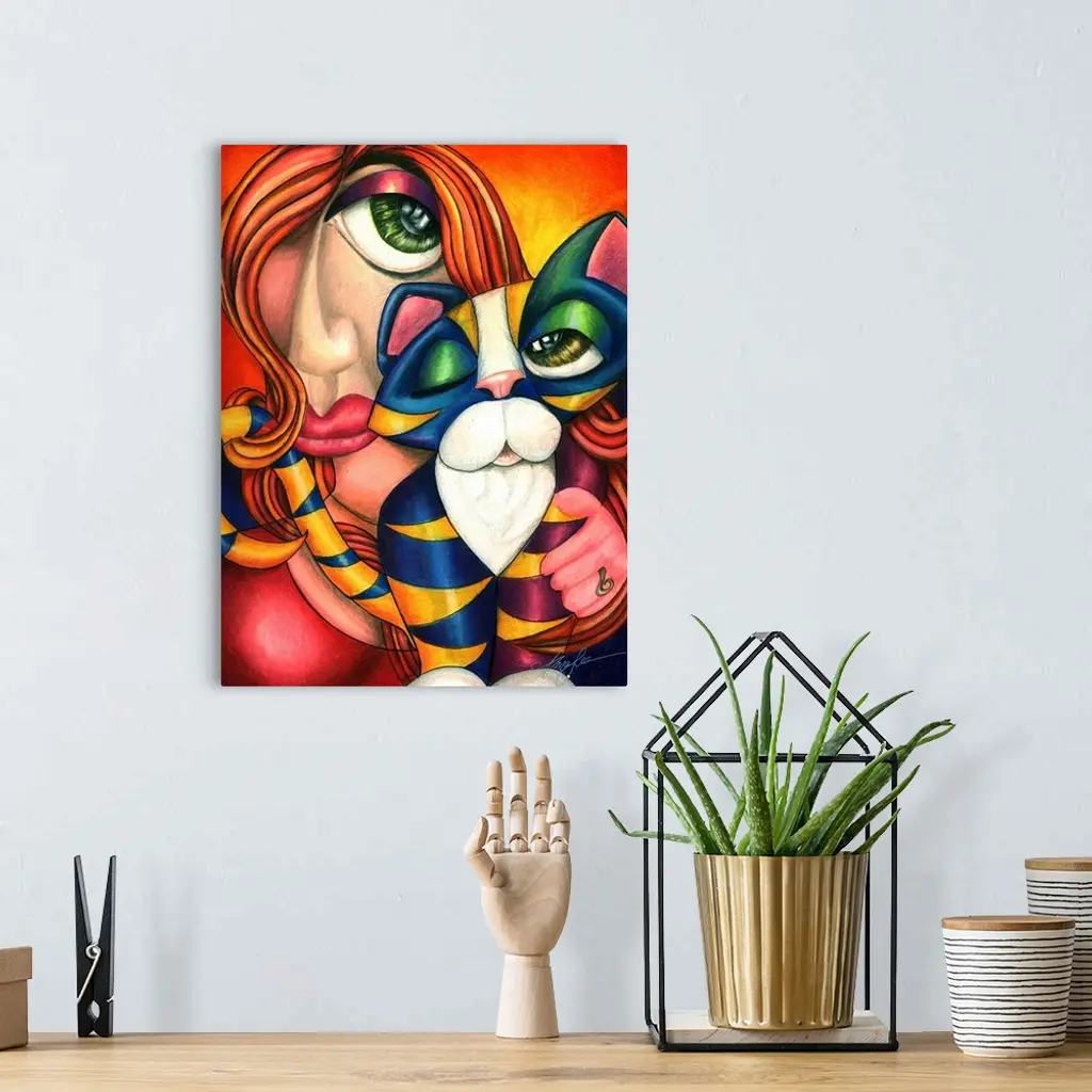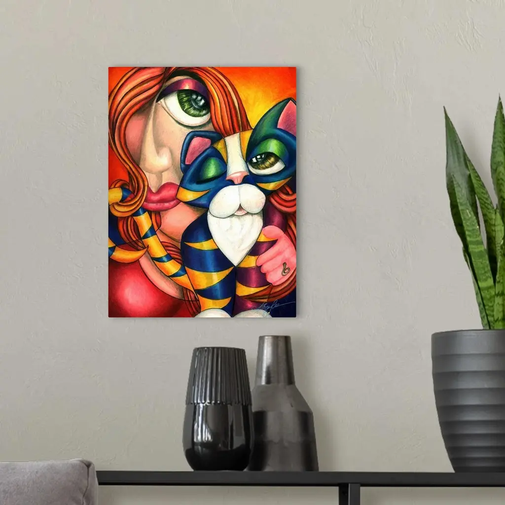 Contemporary artwork in the style of cubism of a female holding a cat in bold colors.