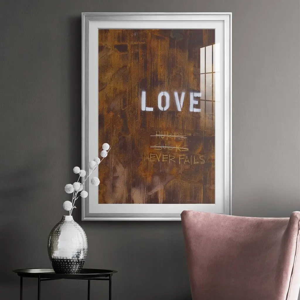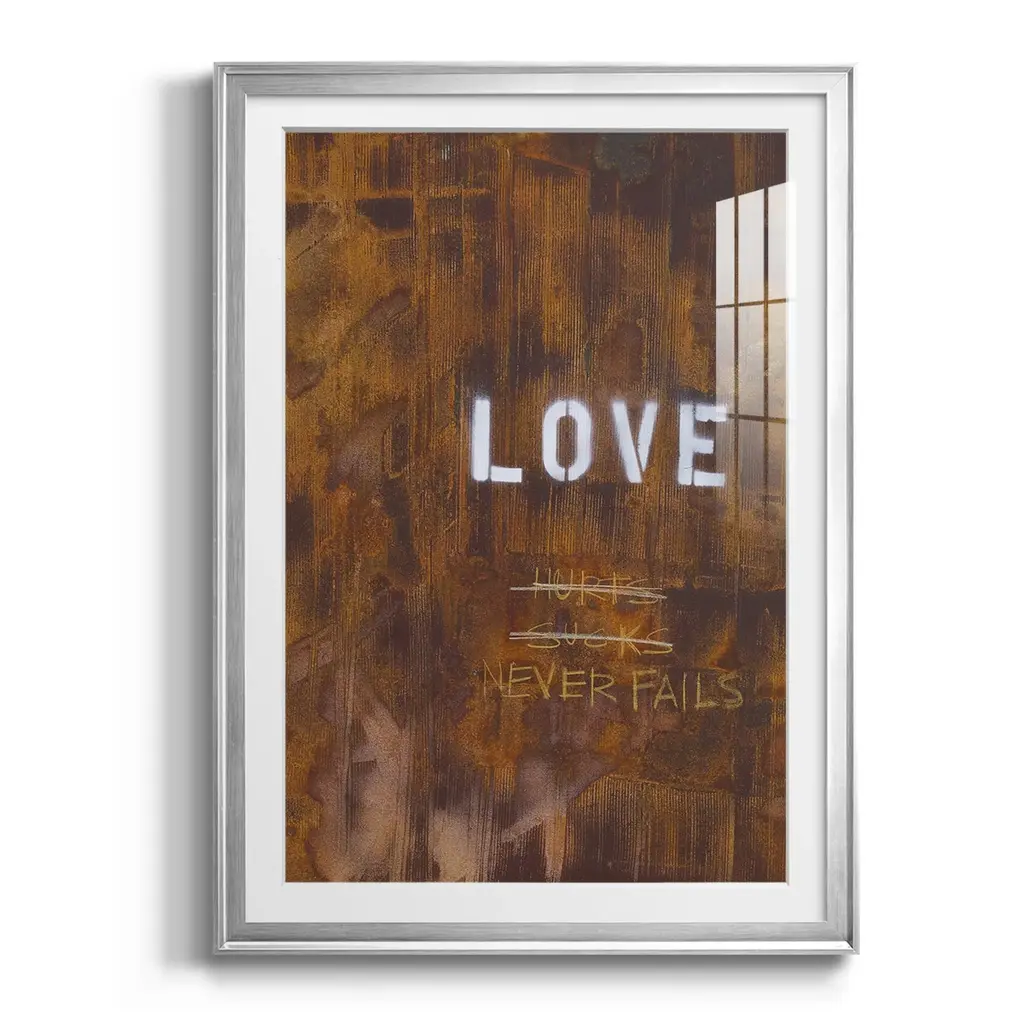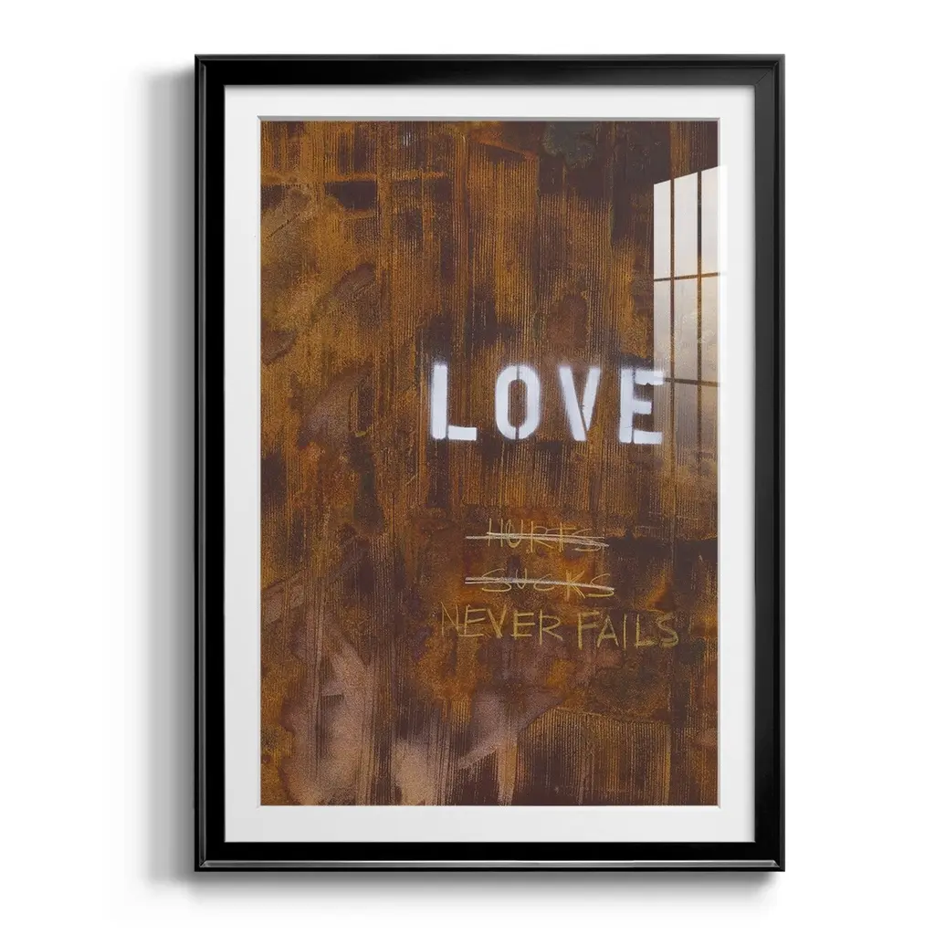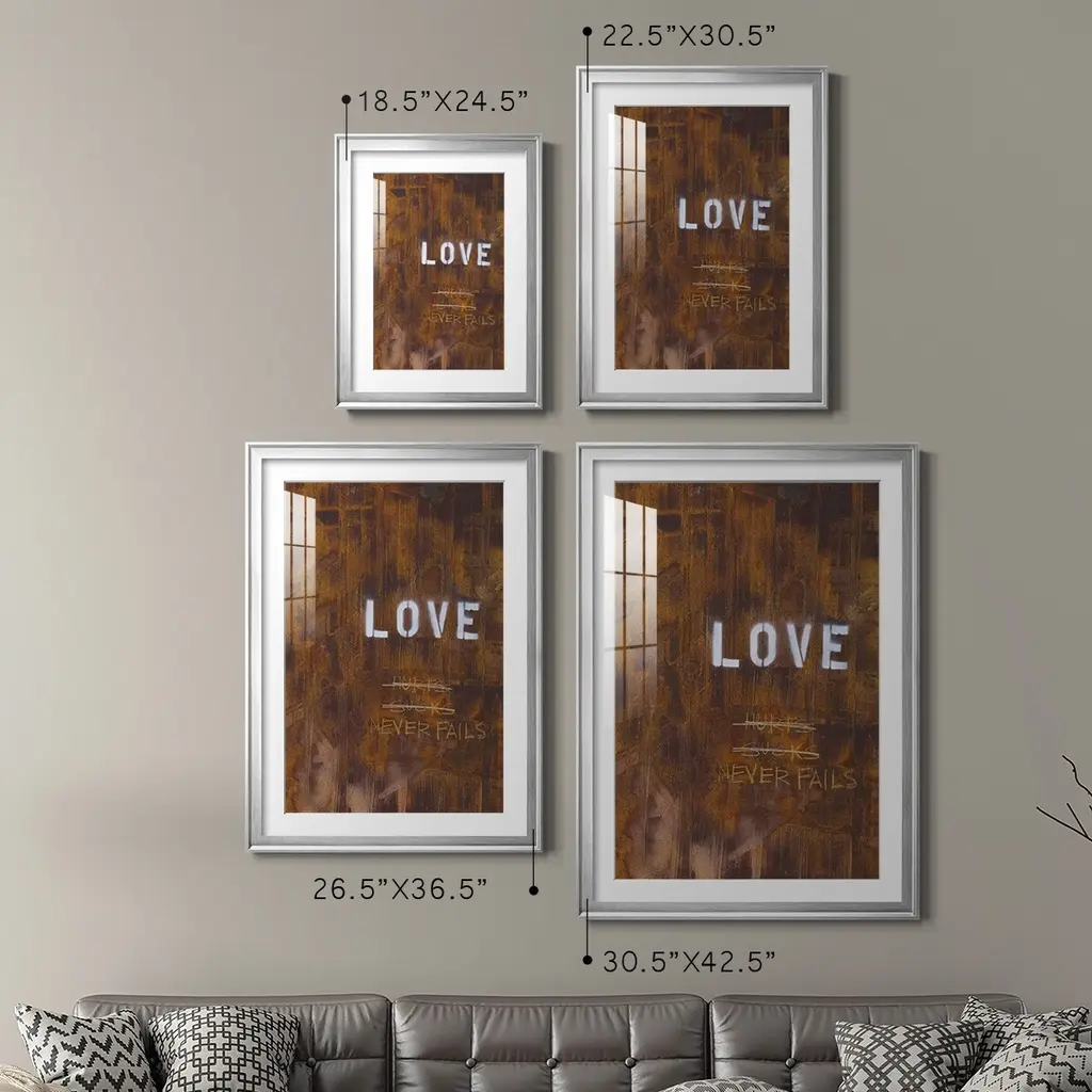 Love Never Fails I Premium Framed Print - Ready to Hang A Premium Framed Print created to last. Framed in distressed wood and available in an array of sizes and colors Featuring a beveled a solid wood stretcher bar, each piece comes ready to hand 4 SIZES AVAILABLE 30.5''X42.5'' - Overall Size 26.5'X36.5'' - Overall Size 22.5''x30.5'' - Overall Size 18.5''x24.5'' - Overall Size Each piece is made to order. Each piece comes with hanging hardware. Made in the USA Ready to Hang Giclee Paper Print Acrylic Glass Beveled Matt Board