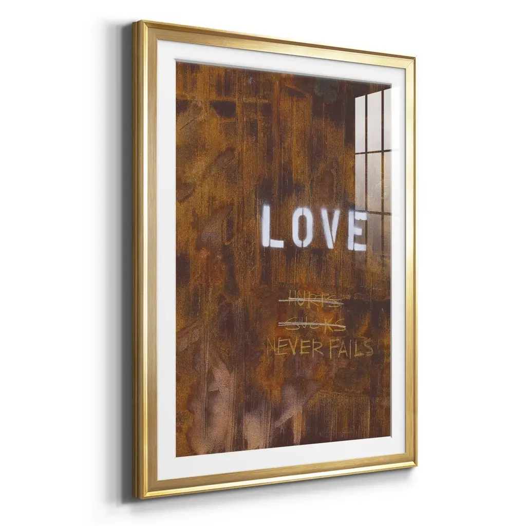 Love Never Fails I Premium Framed Print - Ready to Hang A Premium Framed Print created to last. Framed in distressed wood and available in an array of sizes and colors Featuring a beveled a solid wood stretcher bar, each piece comes ready to hand 4 SIZES AVAILABLE 30.5''X42.5'' - Overall Size 26.5'X36.5'' - Overall Size 22.5''x30.5'' - Overall Size 18.5''x24.5'' - Overall Size Each piece is made to order. Each piece comes with hanging hardware. Made in the USA Ready to Hang Giclee Paper Print Acrylic Glass Beveled Matt Board