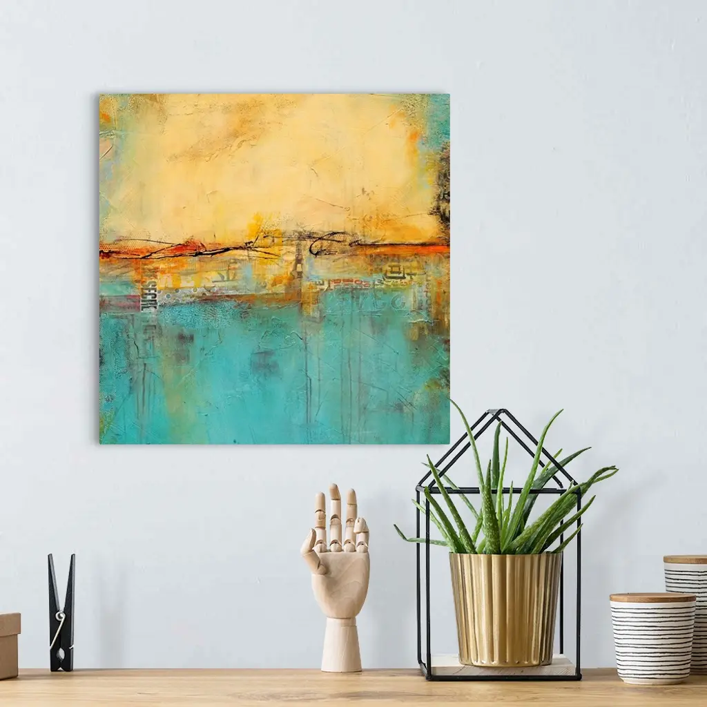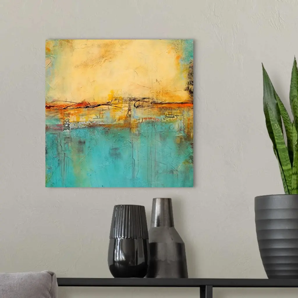 A contemporary abstract painting with cool colors accented with warm, earthy tones.
