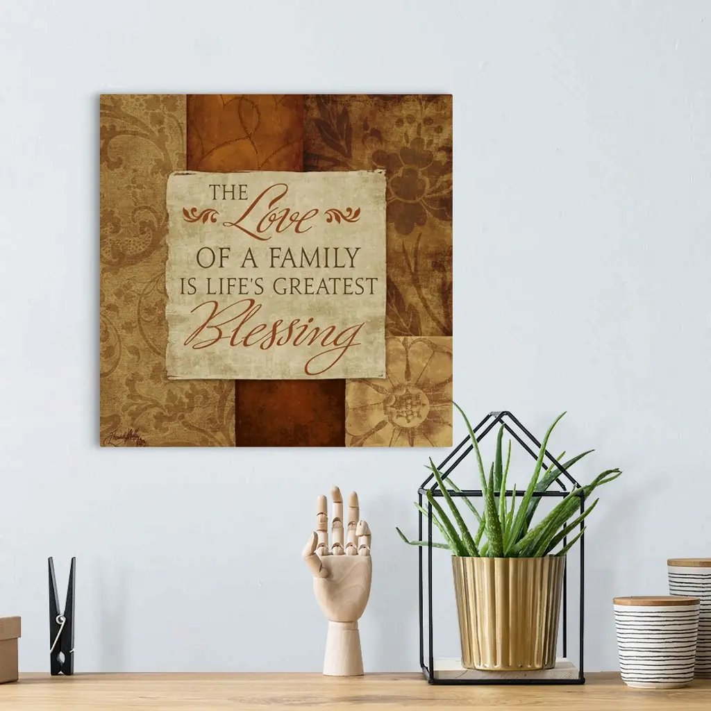 Inspirational artwork of a quote about family surrounded by different designs on neutral color blocks.