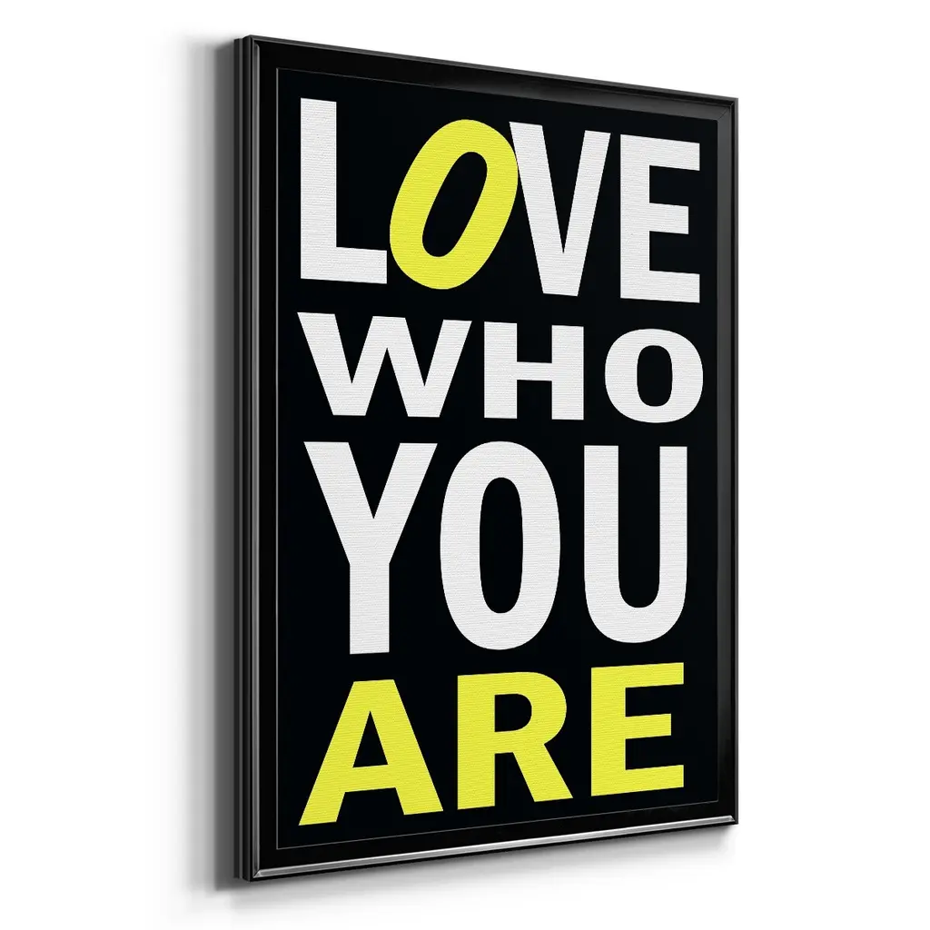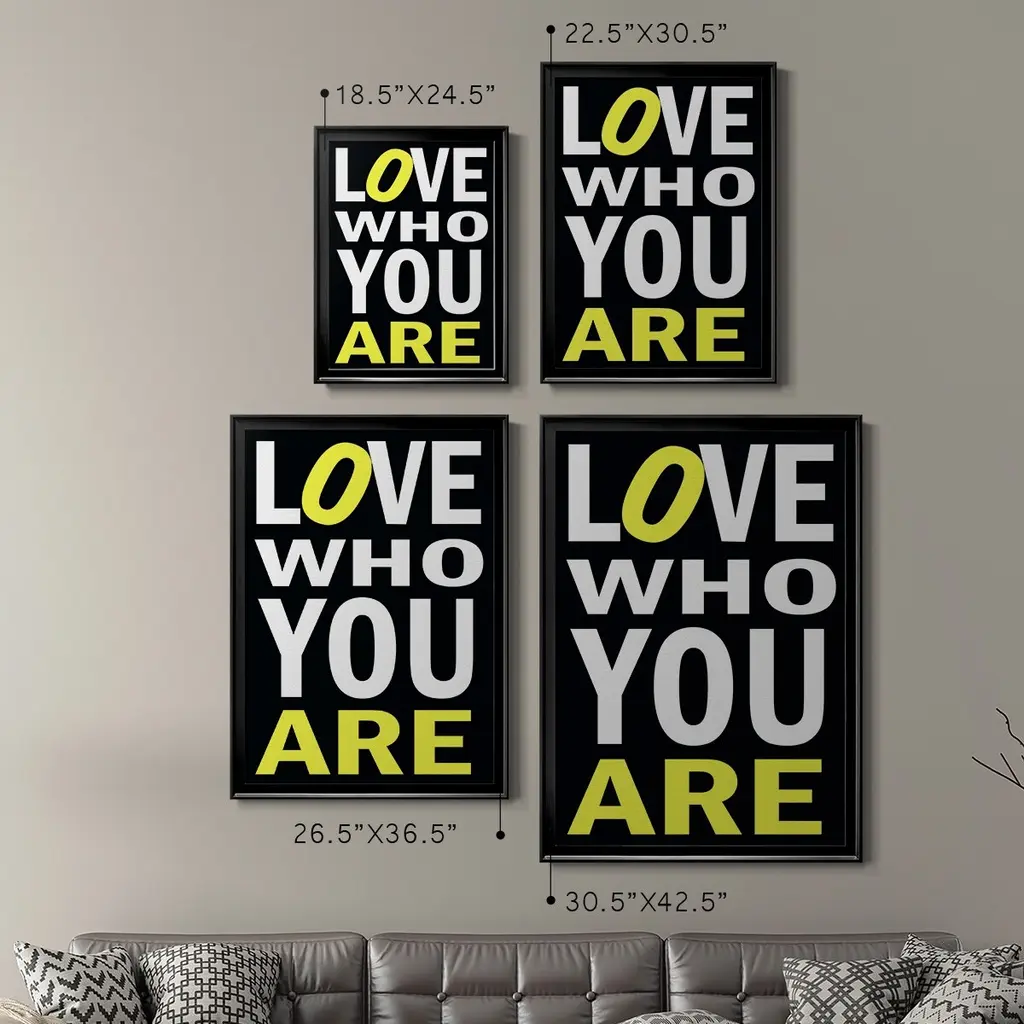 Love Who You Are Premium Framed Print - Ready to Hang A Premium Framed Print created to last. Framed in distressed wood and available in an array of sizes and colors Featuring a beveled a solid wood stretcher bar, each piece comes ready to hand 4 SIZES AVAILABLE 30.5''X42.5'' - Overall Size 26.5'X36.5'' - Overall Size 22.5''x30.5'' - Overall Size 18.5''x24.5'' - Overall Size Each piece is made to order. Each piece comes with hanging hardware. Made in the USA Ready to Hang