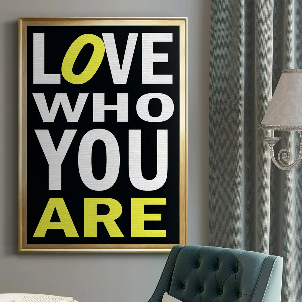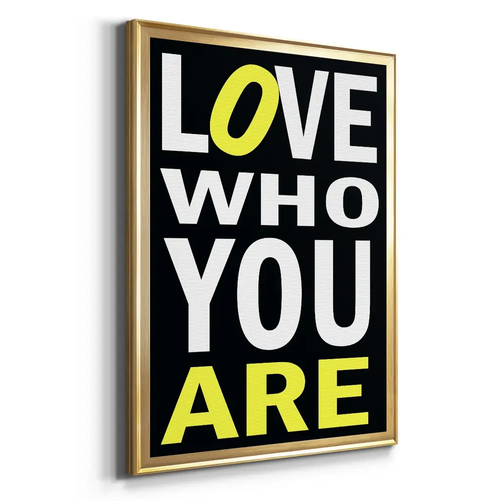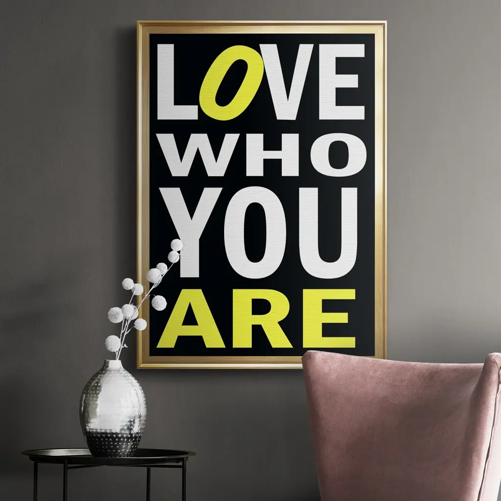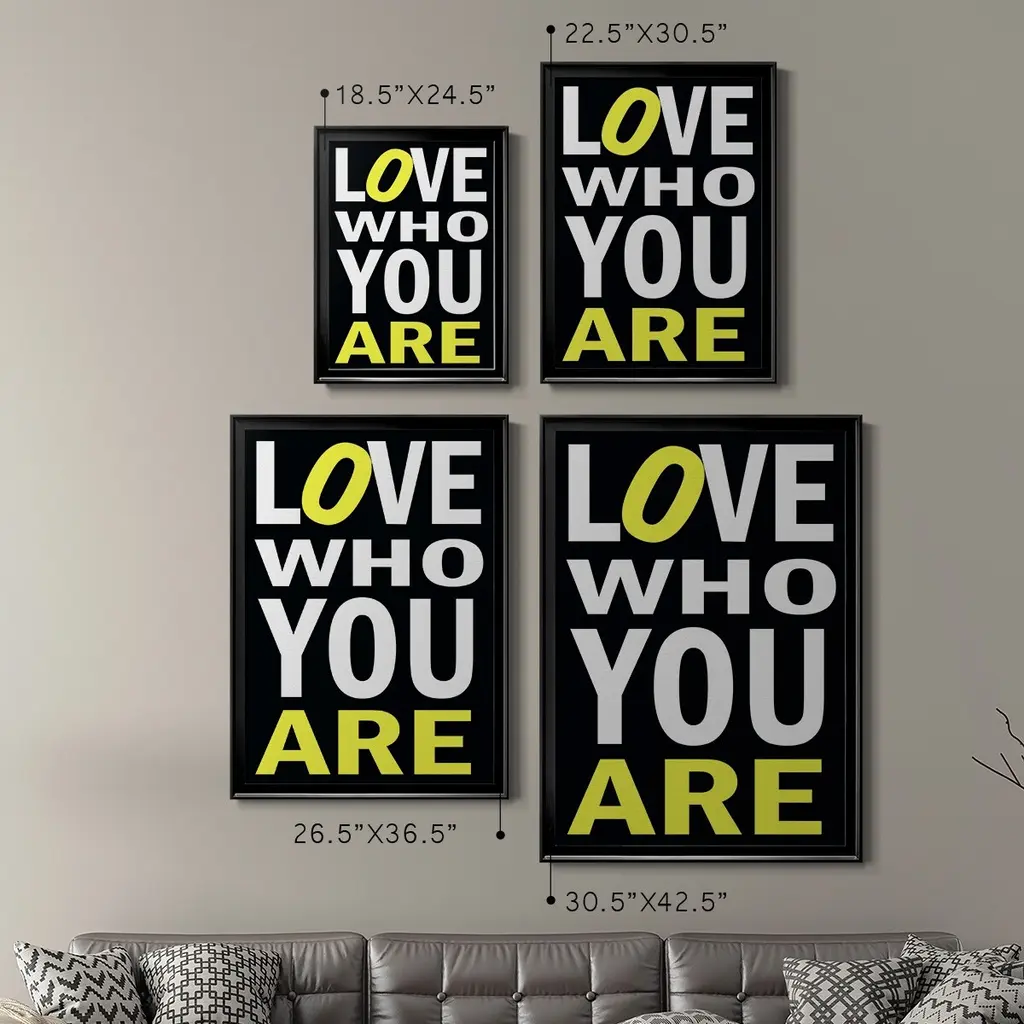Love Who You Are Premium Framed Print - Ready to Hang A Premium Framed Print created to last. Framed in distressed wood and available in an array of sizes and colors Featuring a beveled a solid wood stretcher bar, each piece comes ready to hand 4 SIZES AVAILABLE 30.5''X42.5'' - Overall Size 26.5'X36.5'' - Overall Size 22.5''x30.5'' - Overall Size 18.5''x24.5'' - Overall Size Each piece is made to order. Each piece comes with hanging hardware. Made in the USA Ready to Hang