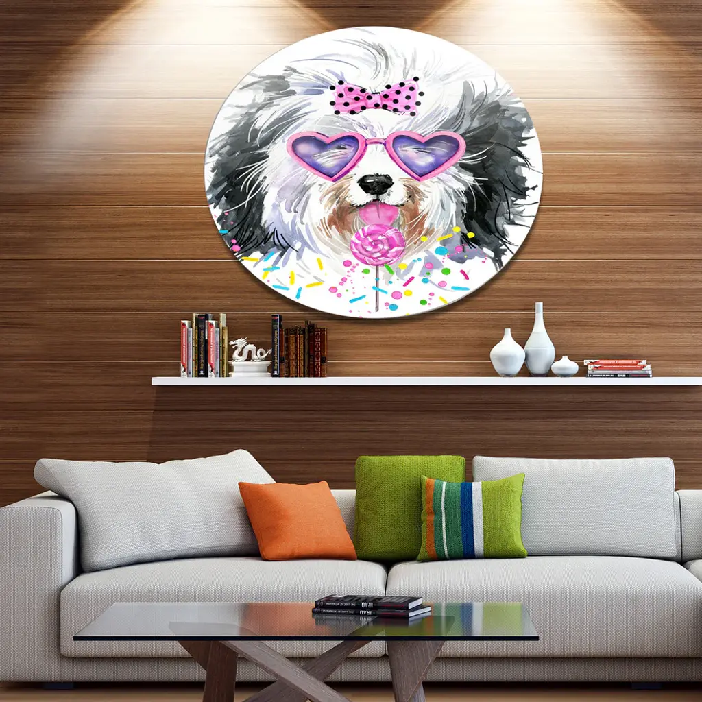 Bring Contemporary Abstraction to your home with this large Circle Metal wall art. This Lovely Dog with Pink Heart Glasses Metal Artwork makes it the focal point of any room or office. - White Gloss Coating ensures colors are extra vibrant with light reflection.- Aluminum grade Sheet Metal with 1 inch mounting frame on the back giving the illusion that the artwork is floating on the wall..- Mounting Brackets are included along with instructions.- High Quality Digital images are created directly into a glossy aluminum panel producing a stunning and captivating print into the glossy finish of the metal.- Water, Fire and Scratch resistant HD Aluminum panels.- Looks better than any photo paper and guaranteed to last at least 20 years- Easy to clean with a microfiber cloth. Colors are far superior to regular Canvas Art. - Easy to Hang