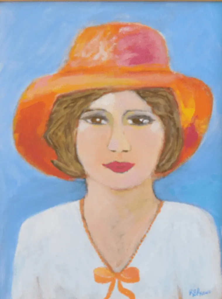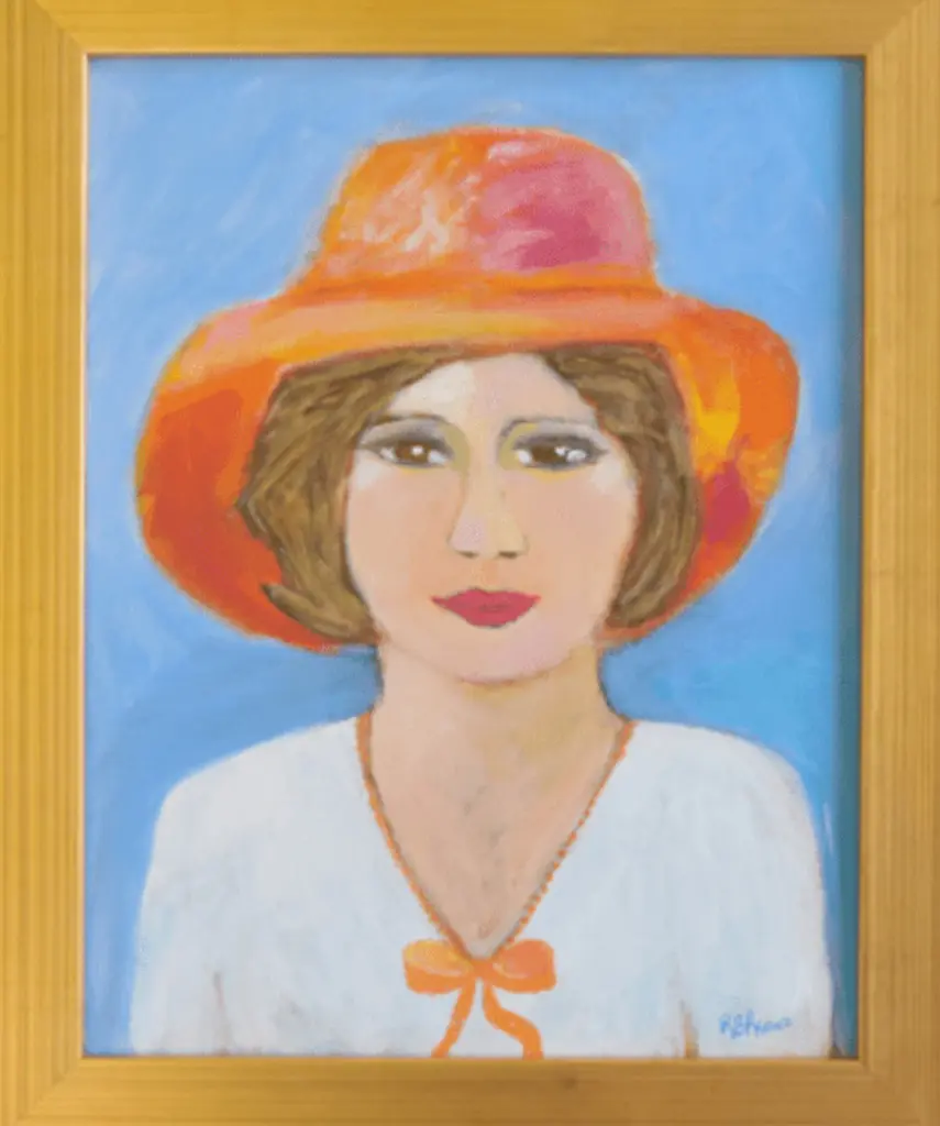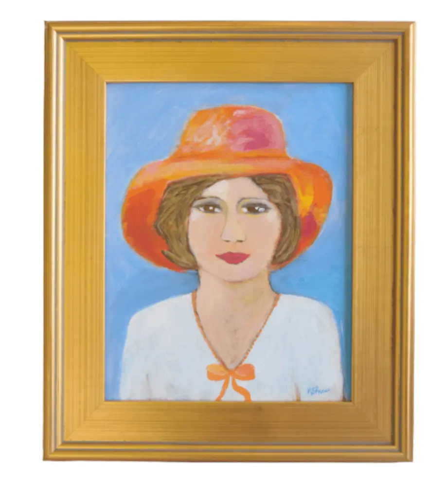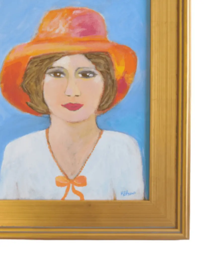 Lovely brunette haired lady with an orange hat portrait oil painting on stretched artist's canvas titled ���Ursula Dean.” Signed by the artist “Ruth Arenz������� lower right. Included are the antiqued gold leaf wood frame and hanging hardware/wire. Dimensions: Artwork, 11”L x 14����H; overall including the frame, 16�����L x 19”H. Excellent beautiful condition!!!!