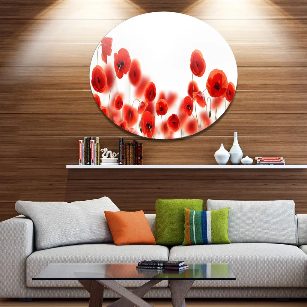 Bring Contemporary Abstraction to your home with this large Circle Metal wall art. This Lovely Poppy Flowers on White Metal Artwork makes it the focal point of any room or office. - White Gloss Coating ensures colors are extra vibrant with light reflection.- Aluminum grade Sheet Metal with 1 inch mounting frame on the back giving the illusion that the artwork is floating on the wall..- Mounting Brackets are included along with instructions.- High Quality Digital images are created directly into a glossy aluminum panel producing a stunning and captivating print into the glossy finish of the metal.- Water, Fire and Scratch resistant HD Aluminum panels.- Looks better than any photo paper and guaranteed to last at least 20 years- Easy to clean with a microfiber cloth. Colors are far superior to regular Canvas Art. - Easy to Hang