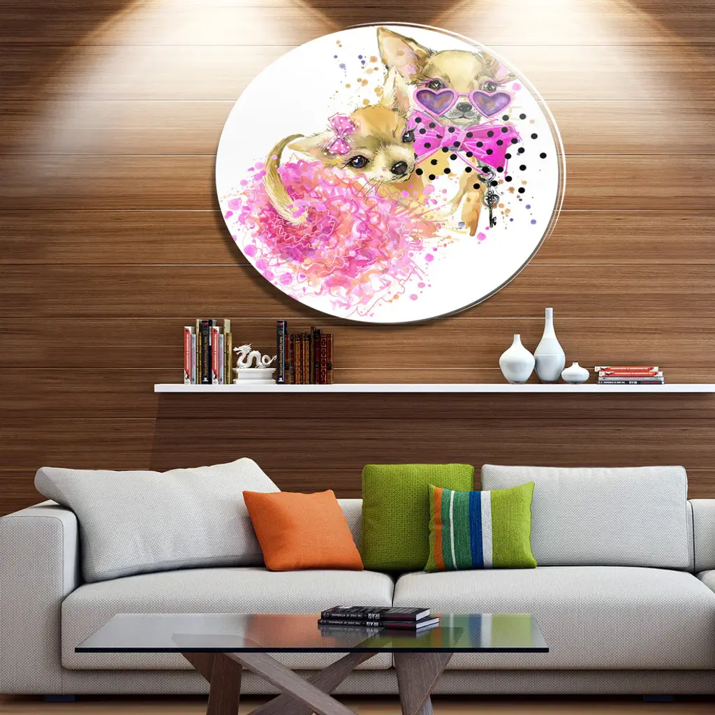 Bring Contemporary Abstraction to your home with this large Circle Metal wall art. This Lovely Sweet Dog Watercolor Metal Artwork makes it the focal point of any room or office. - White Gloss Coating ensures colors are extra vibrant with light reflection.- Aluminum grade Sheet Metal with 1 inch mounting frame on the back giving the illusion that the artwork is floating on the wall..- Mounting Brackets are included along with instructions.- High Quality Digital images are created directly into a glossy aluminum panel producing a stunning and captivating print into the glossy finish of the metal.- Water, Fire and Scratch resistant HD Aluminum panels.- Looks better than any photo paper and guaranteed to last at least 20 years- Easy to clean with a microfiber cloth. Colors are far superior to regular Canvas Art. - Easy to Hang