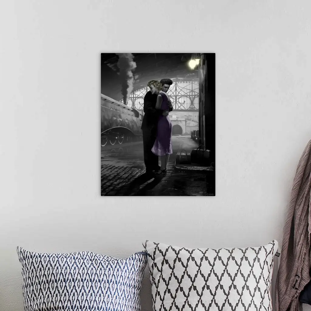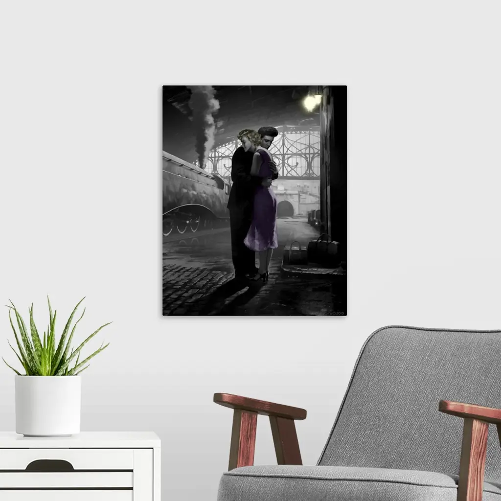 Painting of Marilyn Monroe and Elvis Presley embracing in a train station.