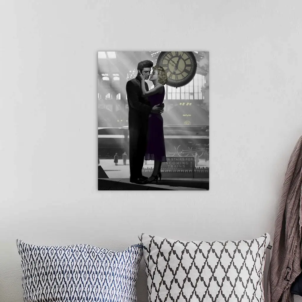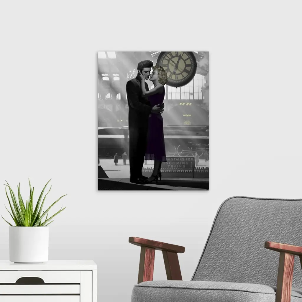 Painting of Marilyn Monroe and Elvis Presley embracing in a train station.