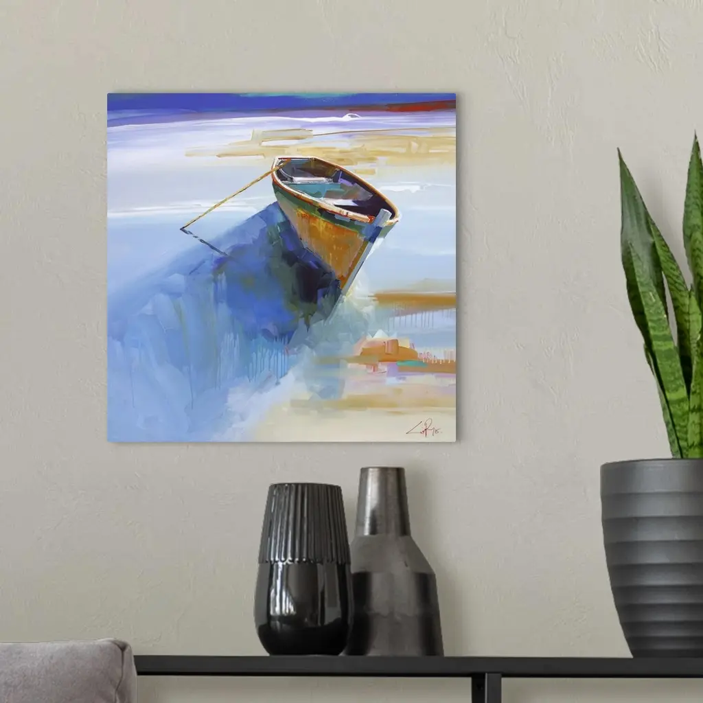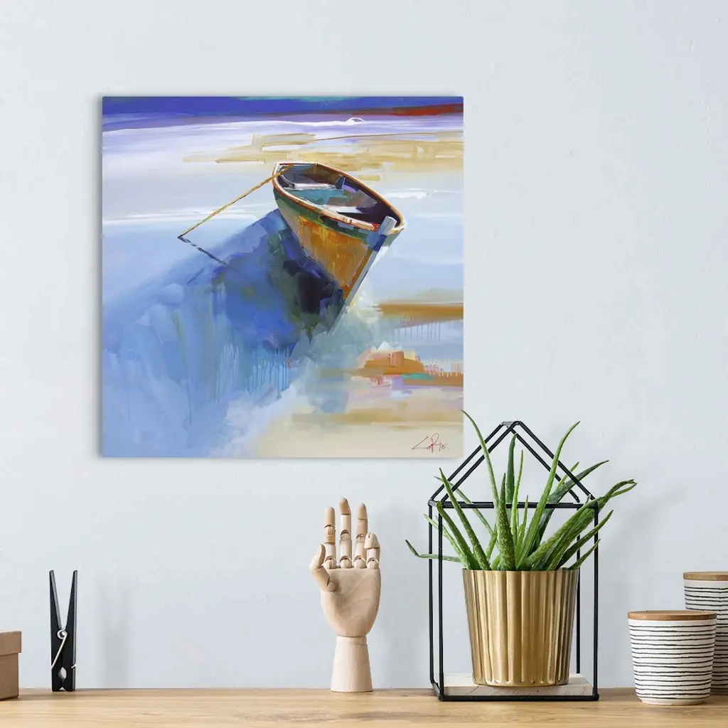 Contemporary painting of a small boat beached on the shore.