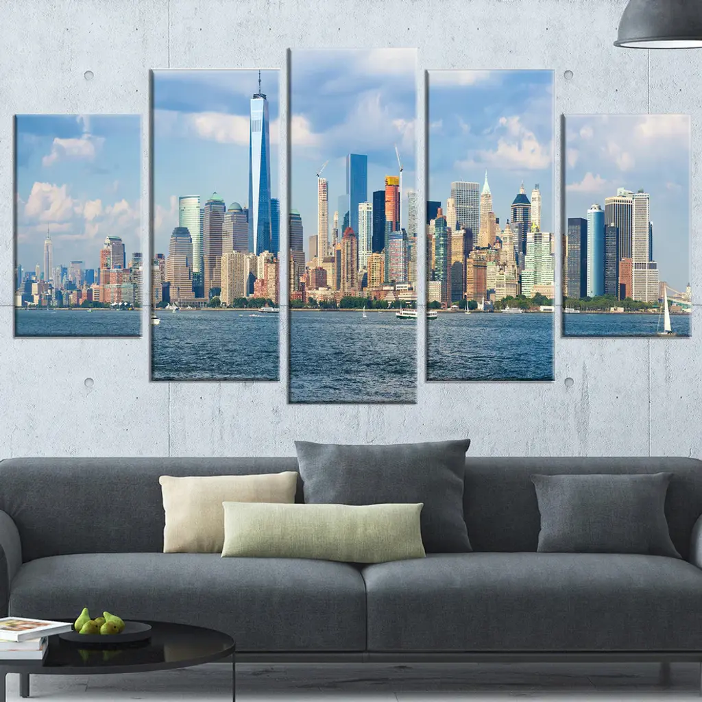 "Lower Manhattan Skyline Panorama" Cityscape Artwork Canvas, 5 Panels, 60"x32"