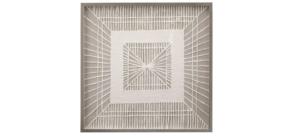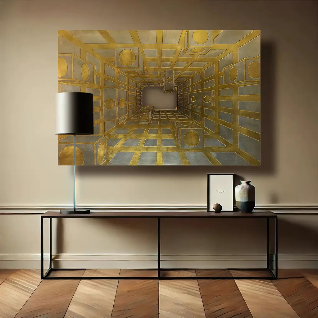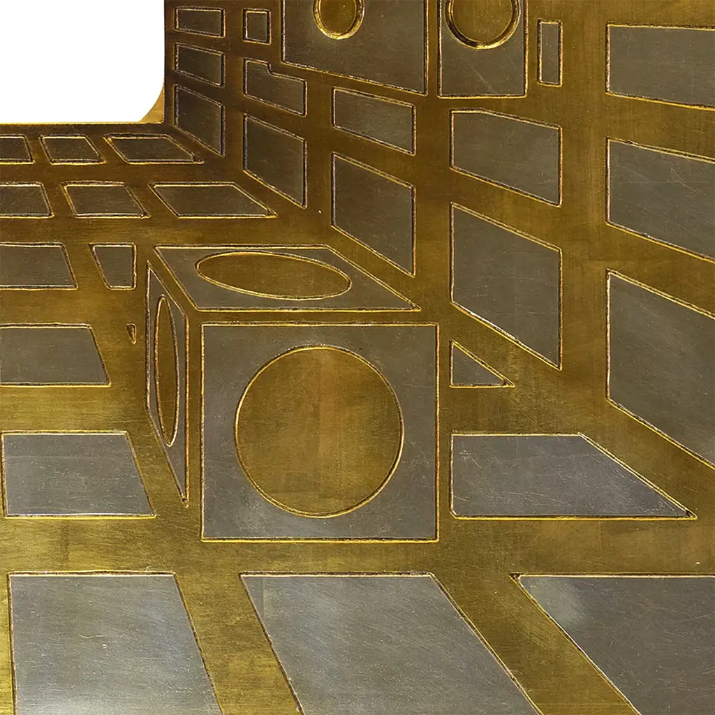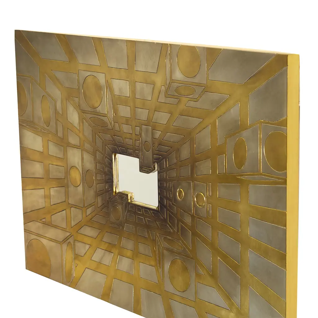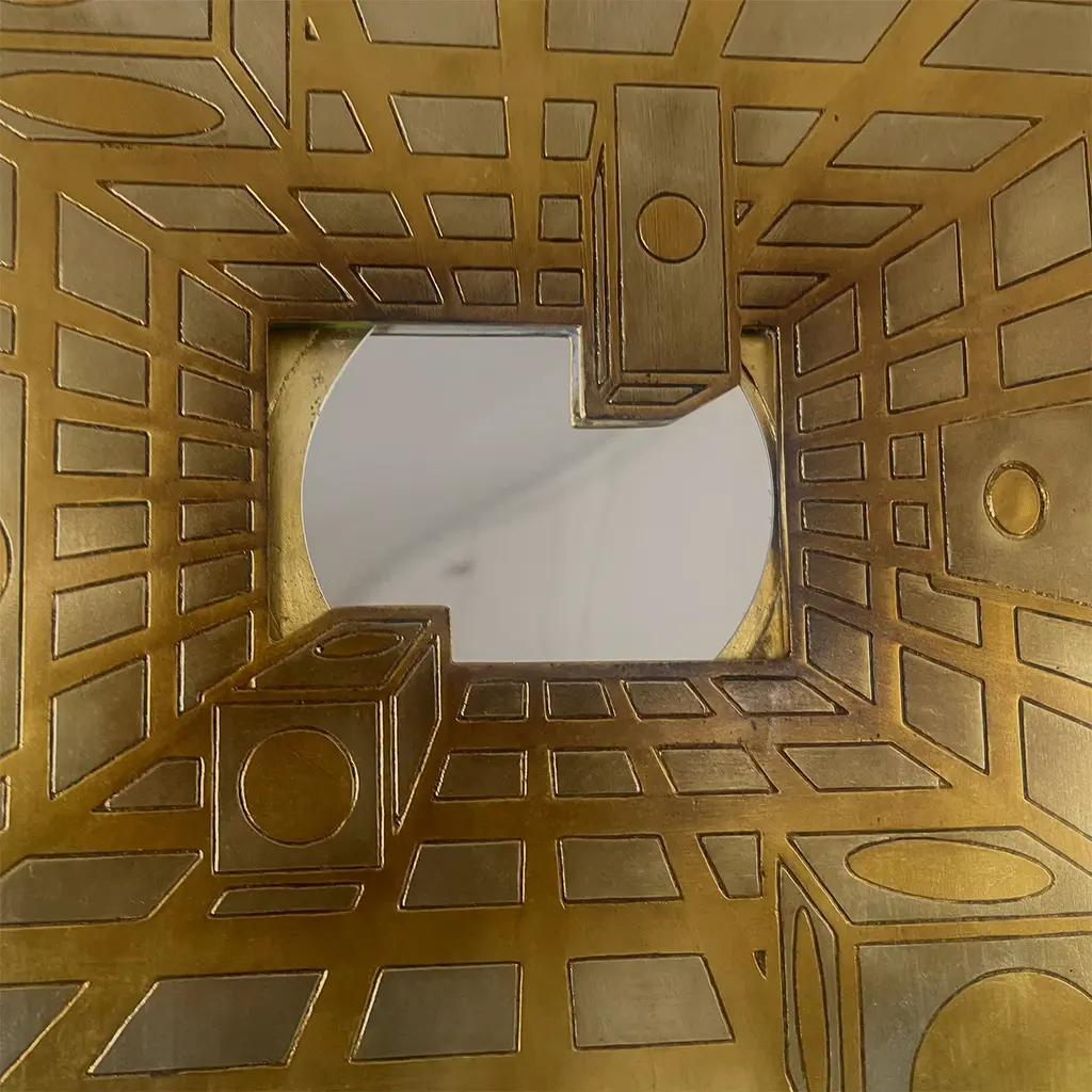 Experience the captivating allure of Luce et Lucis, a visually striking piece that transports viewers into an infinite realm of illumination. This artwork skillfully combines intricate carvings and gilding with gold and silver leaf, creating a dynamic interplay with light that enhances the three-dimensional illusion of depth. At its heart lies a convex magnifying mirror, which serves as a focal point that distorts and amplifies perceptions of reality, inviting observers into a mesmerizing optical experience. The harmonious balance of geometrical shapes within the design elevates this piece, making it a remarkable fusion of artistry and visual perception. Perfect for elevating any space, this artwork encapsulates a sense of wonder and intrigue, making it an exceptional addition to contemporary or abstract art collections. One-of-a-kind piece.