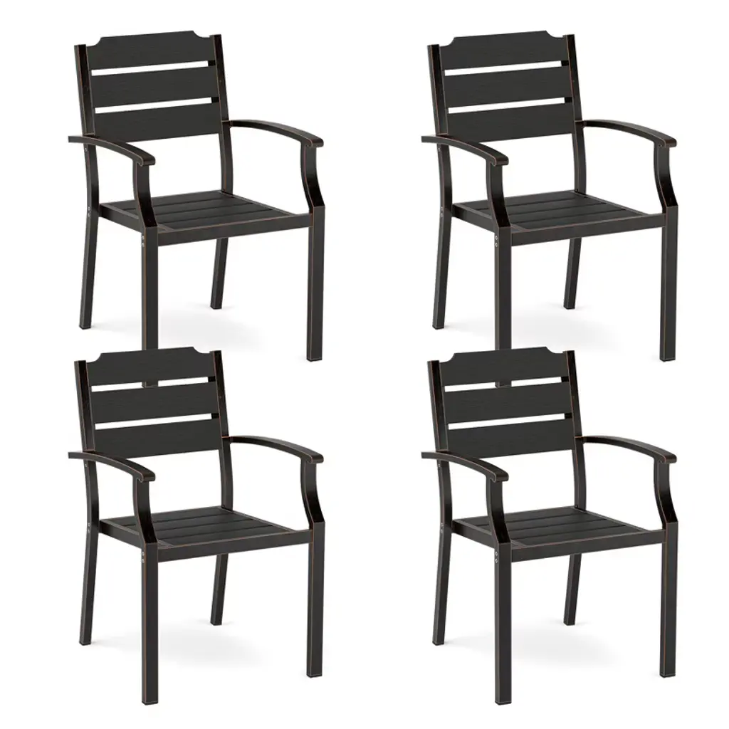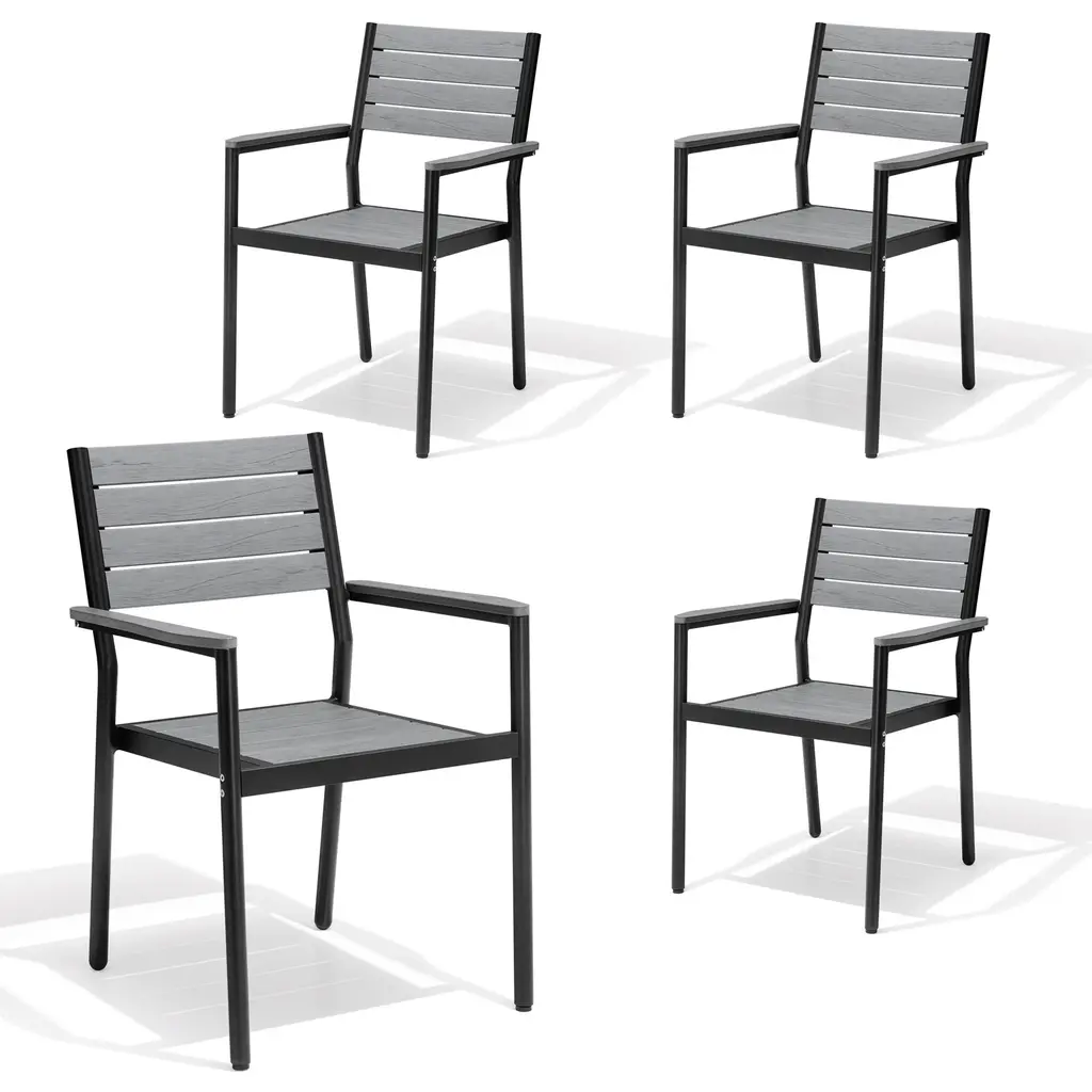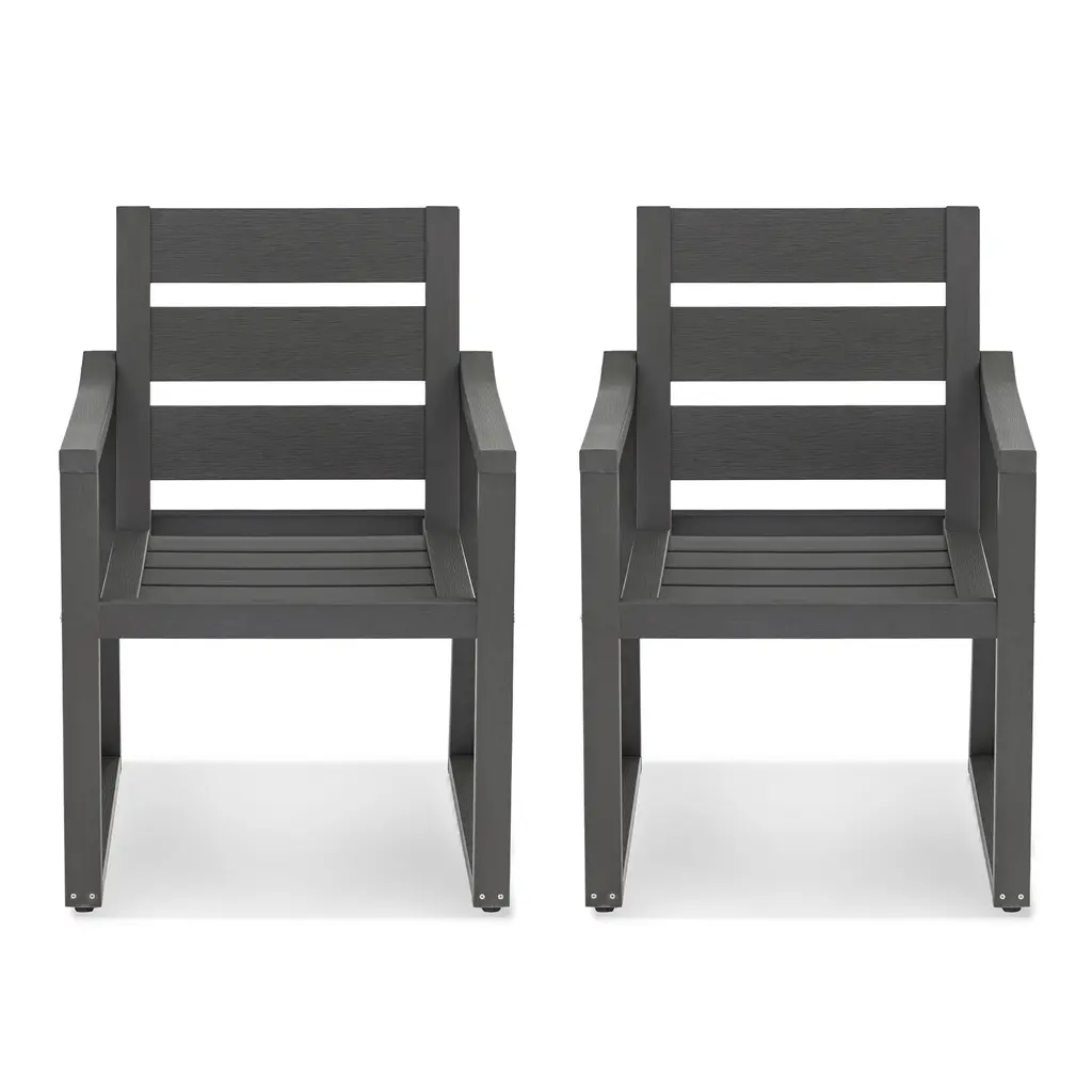If you are on the hunt for more chairs for your patio set, then look no further than these plastic wood armchairs from our outdoor furniture assortment. This cottage-inspired chair features subtle curves and a comfortably arched back that shows off a classic look. This outdoor dining chair is made of plastic wood. The stylish square-leg design brings a simple and elegant feeling to this outdoor dining chair, making it the perfect complement to your house space both indoors and outdoors. Meanwhile, it also provides strong and durable properties beyond the ordinary dining chair, which can cope with any inclement weather. Let you no longer worry about it can be placed outdoors with the dining table. The stackability allows for easy storage and portability. Pair this all-weather dining armchair and any coordinating dining table to create a set that fits perfectly with your outdoor decor. Features: Curved back and seat brings comfort without cushions to this patio dining table Plastic wood lumber requires no painting, staining, waterproofing, or similar maintenance Stylish square-leg design brings a simple and elegant feeling to this outdoor dining chair, making it a perfect complement to your house space both indoors and outdoors Rugged properties of the plastic wood make the patio dining chairs withstand any inclement weather Plastic wood outdoor dining chairs do not splinter, crack, chip, peel, or rot Cleans easily with soap, water, and a soft-bristle brush, UV protectant and color continuously throughout the HDPE material requires no painting or waterproofing Overall dimensions: 24.6 in. W x 23.6 in. D x 34.6 in. H Holds up to 350 lbs weight per chair Dining tables are not included in