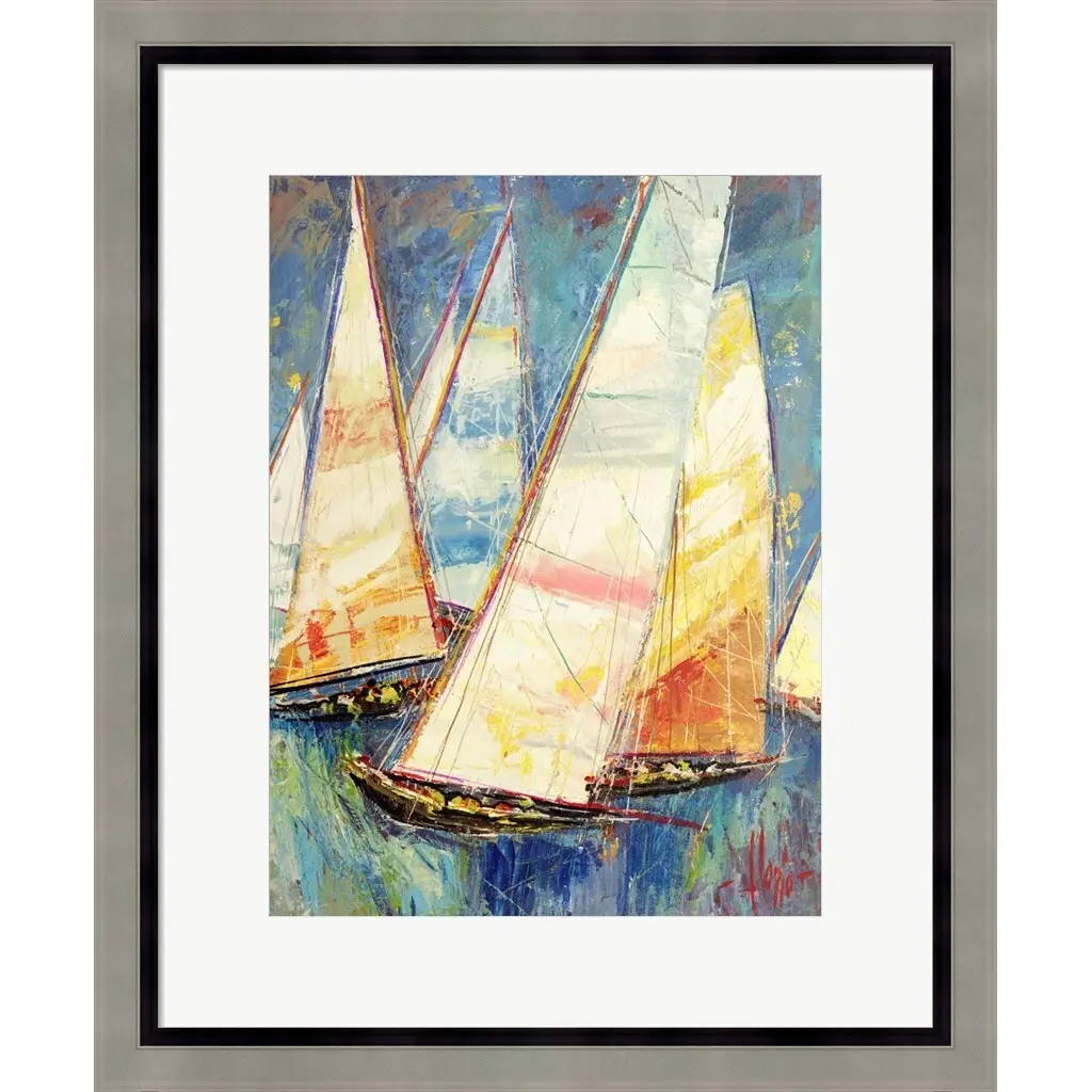 Vele a Colori II by Luigi Florio is a high quality piece of framed artwork. The finished size of this piece is 19" X 23". It has a Contemporary Silver Wood w/Black Inner Accent frame, is single matted and finished with high quality Acrylic Plexiglass. 100% Satisfaction Guaranteed.