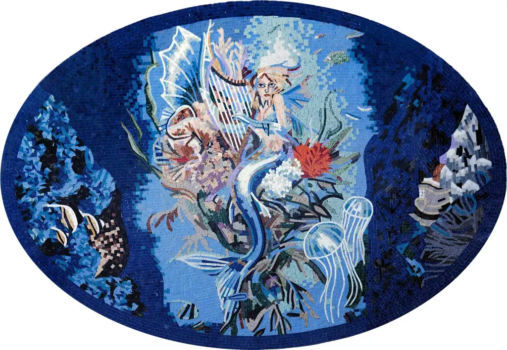 Dive into a world of enchantment with our Lullaby Mermaid Mosaic Art Design, a stunning centerpiece that transforms any space into a serene underwater paradise. This exquisite artwork showcases a breathtaking scene of a mermaid gracefully navigating the ocean depths, surrounded by vibrant shades of blue that shimmer and dance, capturing the essence of tranquility and wonder. Crafted with meticulous attention to detail, this handcrafted mosaic combines premium quality natural stone materials to ensure durability and lasting beauty. Each tile reflects intricate artistry, blending colors harmoniously to create a mesmerizing visual experience that breathes life into your home or office decor. The mosaic’s palette features luxurious stones such as Blue Macaubas, known for its vibrant blue quartzite with stunning cerulean veining and sapphire-like depth, adding electric blue radiance to the composition. Complementing this are radiant quartz hues including luminous Brown Quartz, prismatic Orange Quartz, and scintillating Dark Red Quartz, each imparting a jewel-like warmth and crystalline brilliance. The cool, translucent Aqua Blue Quartz, Dark Blue Quartz, Prisma Blue Quartz, and Light Red Quartz further enrich the design with shimmering, prismatic accents that evoke the ocean’s silky, cool embrace. Whether enhancing a living room, bedroom, or creative space, this captivating mermaid design brings a touch of magic and sophistication. More than decoration, the Lullaby Mermaid Mosaic invites you to escape into a tranquil realm where beauty and imagination entwine. Imagine serene evenings surrounded by calming ocean blues, this art piece becoming a radiant focal point that sparks conversation and ignites dreams. Its exotic materials and unique design make it a perfect gift for art lovers and mermaid enthusiasts seeking peace and wonder. Elevate your decor and enrich your living space with the enchanting allure of this luxury natural stone mosaic. Bring home the Lullaby Mermaid Mosaic Art Design today and let it inspire joy and tranquility in your life.