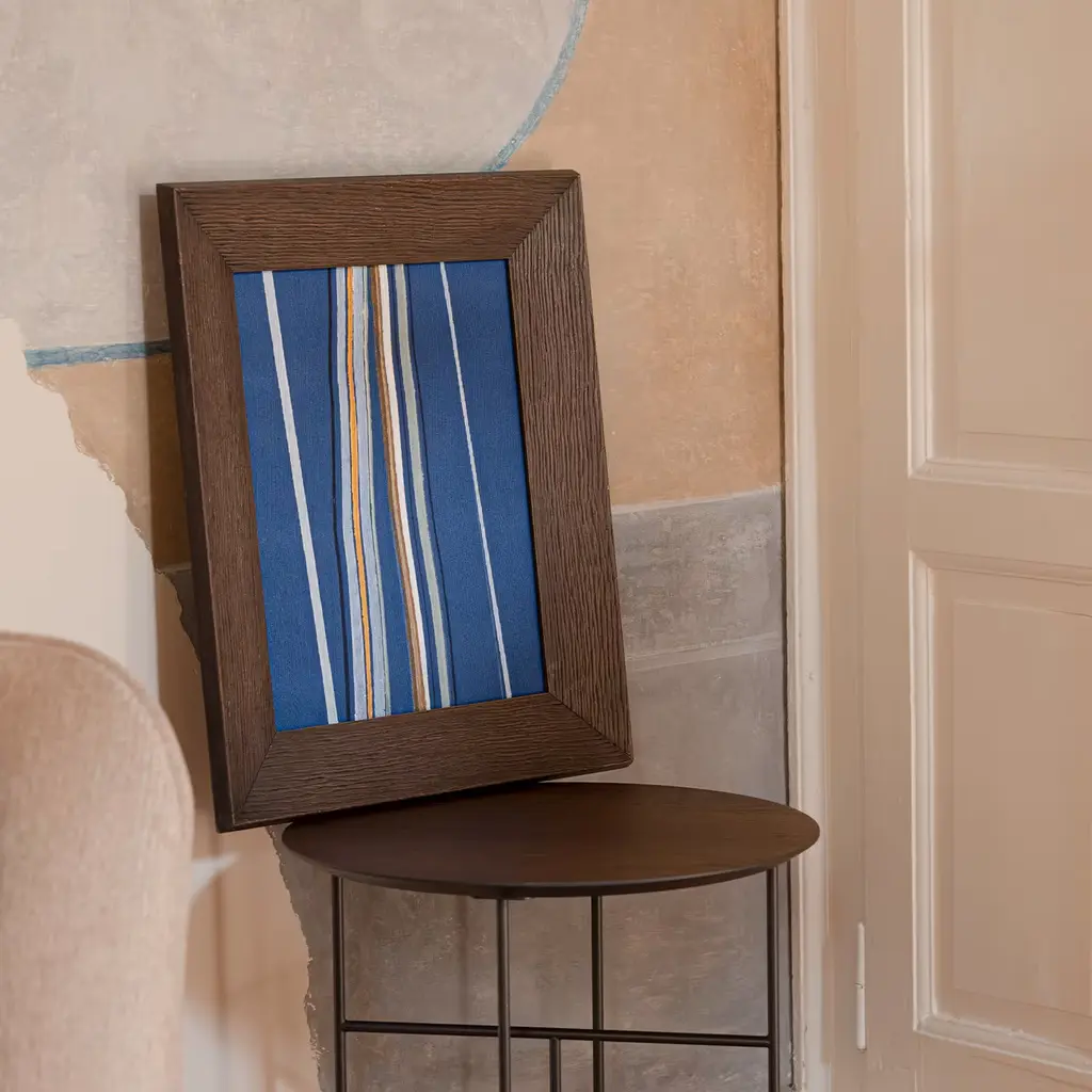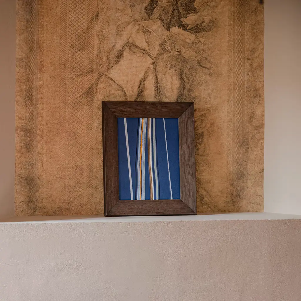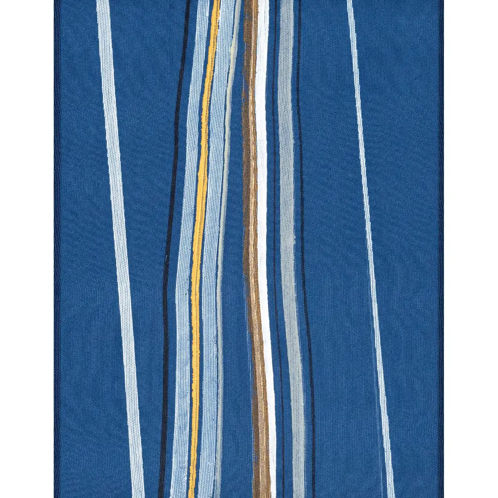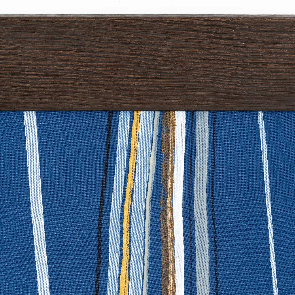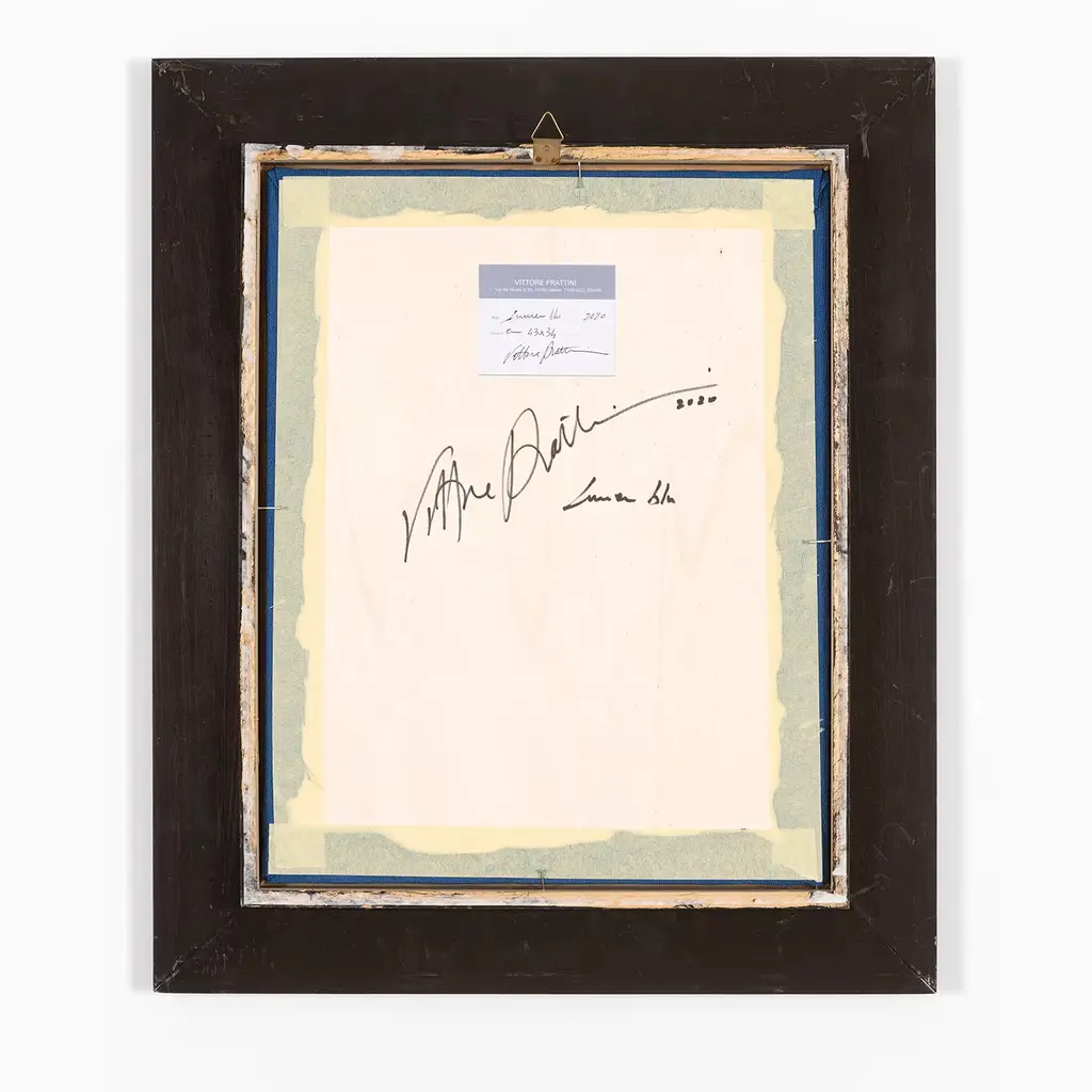 Inspired by natural phenomena, this magnificent painting by Vittore Frattini is part of a 2020 series entirely made using acrylic colors and Lumen, a blend of durable acrylic co-polymers that allows the colors to shine at night. Painted on canvas and enclosed in a simple and textured frame, the painting (43 x 34 cm frameless) flaunts horizontal and irregular white and yellow lines interrupting the tranquility of a blue background.
